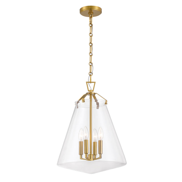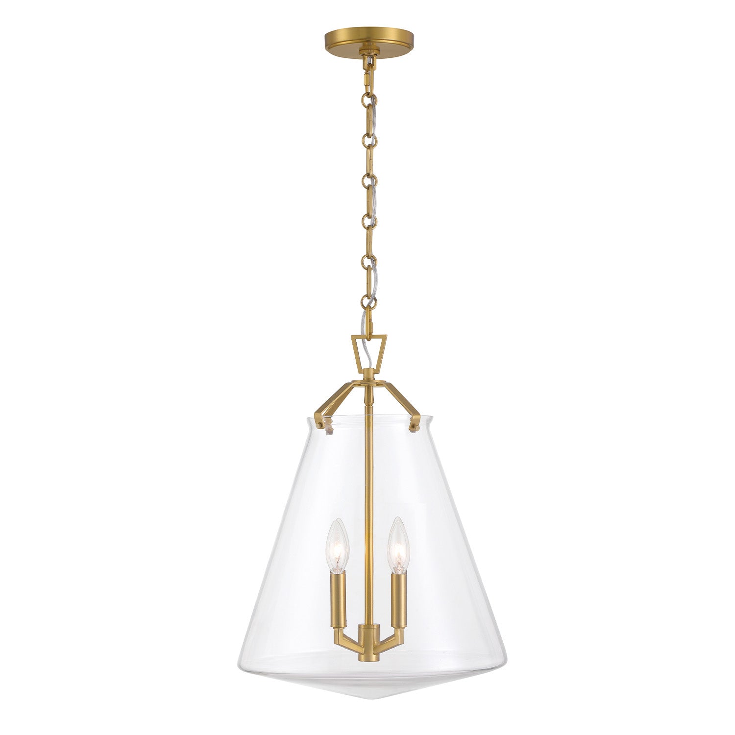 The Addison Large Pendant 15" brings dramatic sophistication to dining rooms, entryways, and grand living spaces with its impressive architectural design. Featuring a generously scaled tapered clear glass shade enclosing four candelabra lights, this pendant creates both powerful illumination and elegant ambiance. The warm brass canopy, decorative chain, and interior fixture add luxurious touches that complement both modern and traditional interiors. The Addison pendant combines classic materials with contemporary sensibility to create a statement lighting solution that enhances your space with refined elegance.