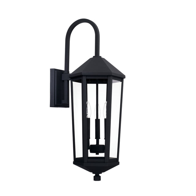 The Asbury Outdoor Medium 29" Wall Light brings timeless lantern charm to your exterior spaces with its distinctive hexagonal silhouette. This classic lantern design features a striking angular frame that combines clean geometric lines with traditional proportions. The gracefully curved mounting arm extends elegantly from the wall, giving the fixture an authentic lantern presence while providing optimal light distribution. The sleek matte black finish beautifully contrasts with expansive clear glass panels that showcase three E12 candelabra bulbs, while the slanted dome top adds architectural interest and weather protection. This substantial 29" outdoor wall light is engineered to withstand the elements, featuring a UL wet-rated certification and a durable powder-coated finish.