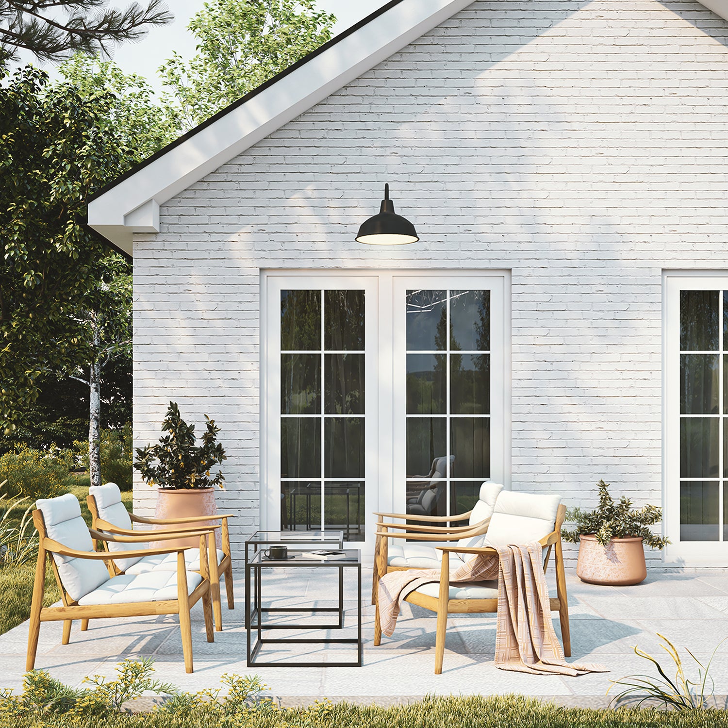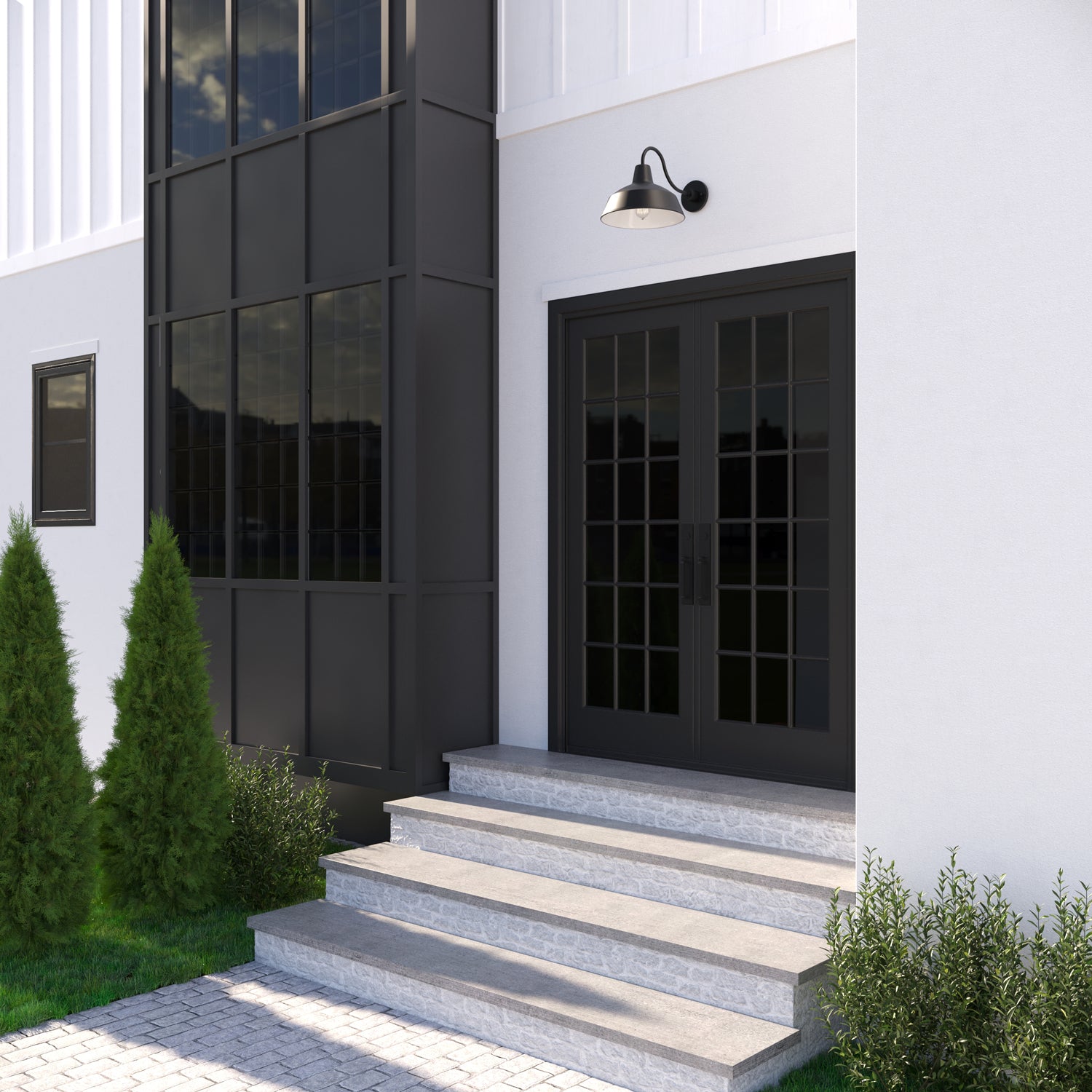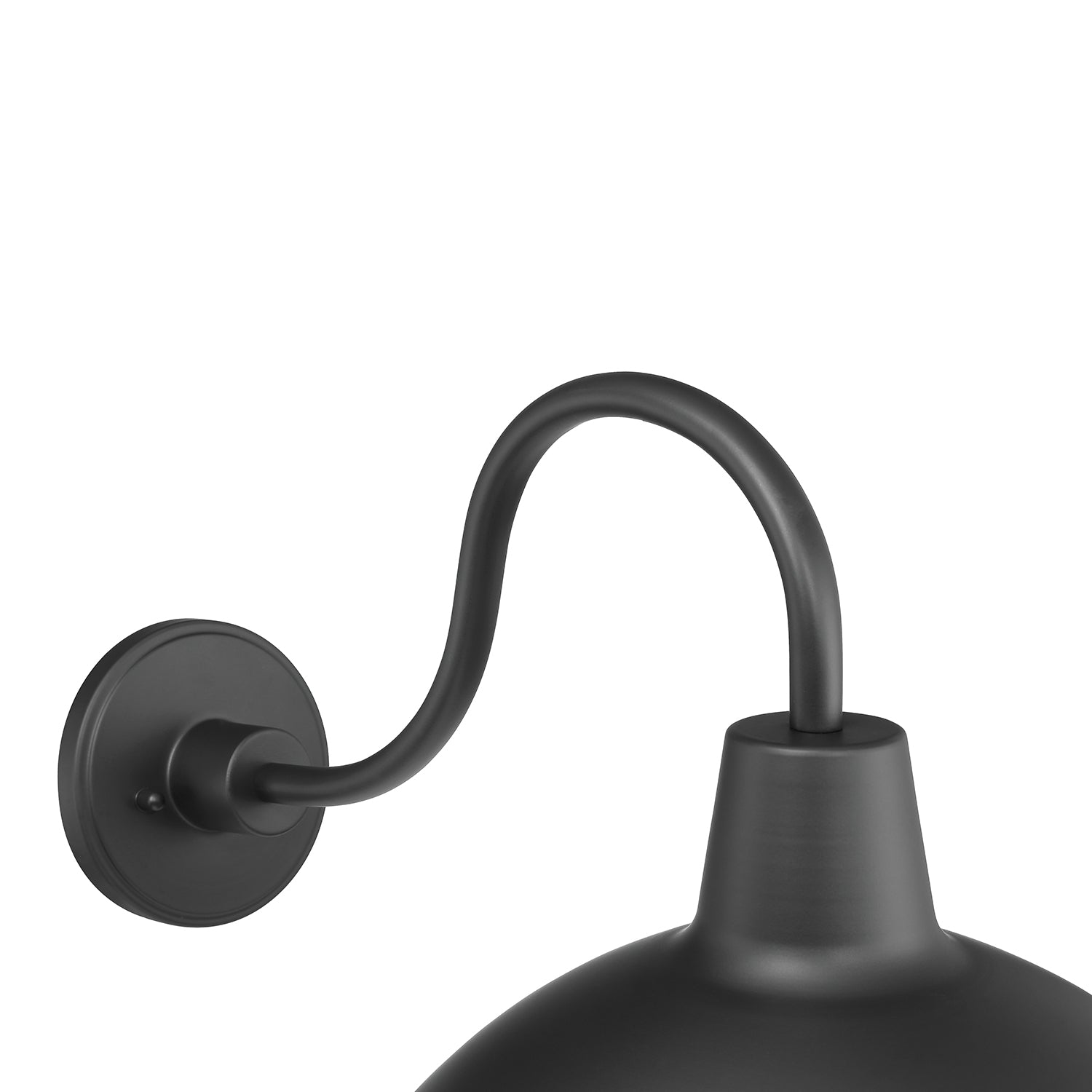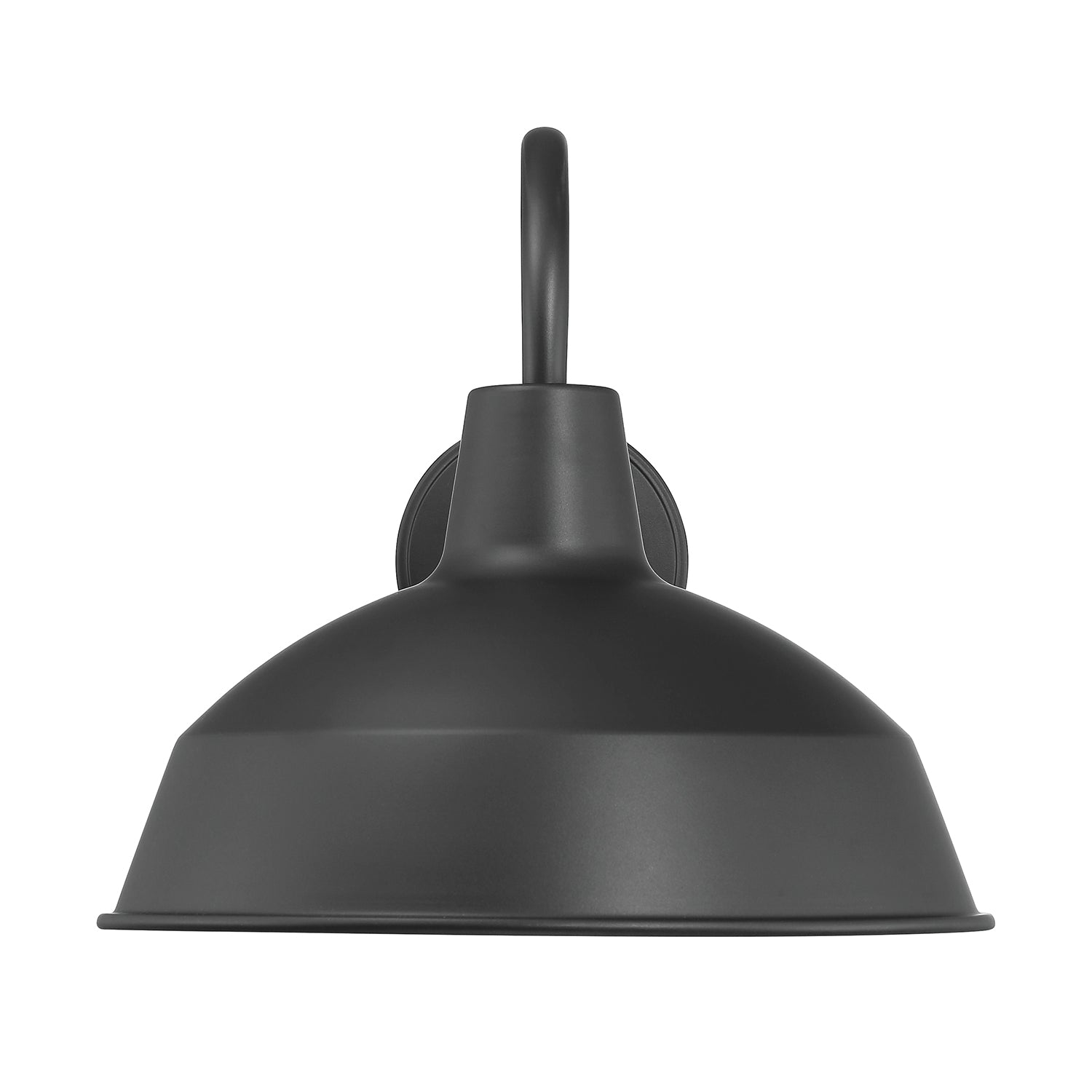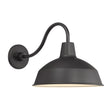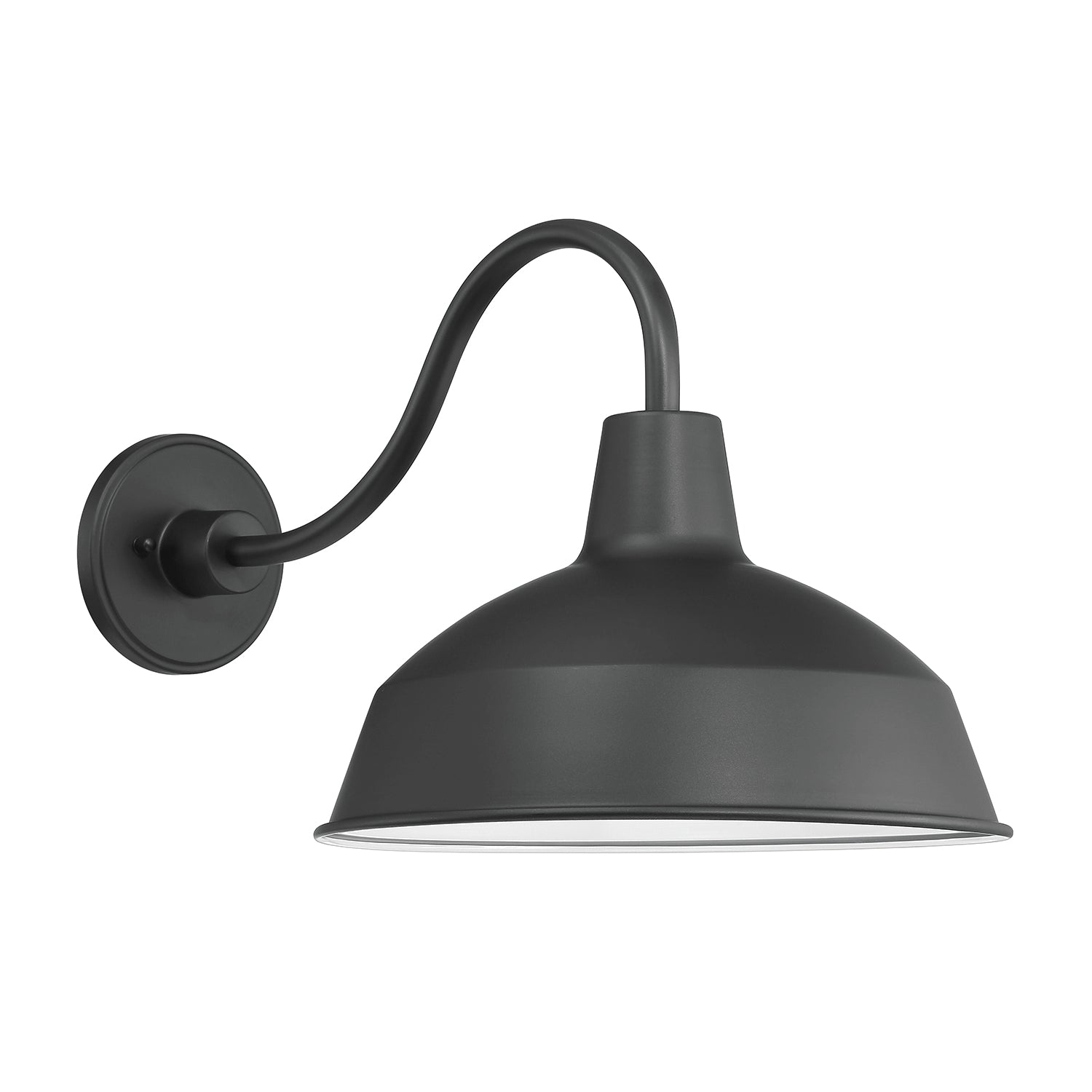 Inspired by turn-of-the-century industrial lighting, our Asher collection brings a modern farmhouse flair to your home or commercial space. The Asher Large Outdoor Wall Light is rich in vintage styling and features a curved, gooseneck arm with a 12.5" round shade, suspended from a sturdy, tiered metal backplate. The matte black finish with white interior adds a refined note to this updated barn light. This light can be used outdoors or indoors and looks as great on a patio as it does in a kitchen or bathroom. The Asher Large Outdoor Wall Light is part of a larger collection of fixtures to complete your lighting needs.