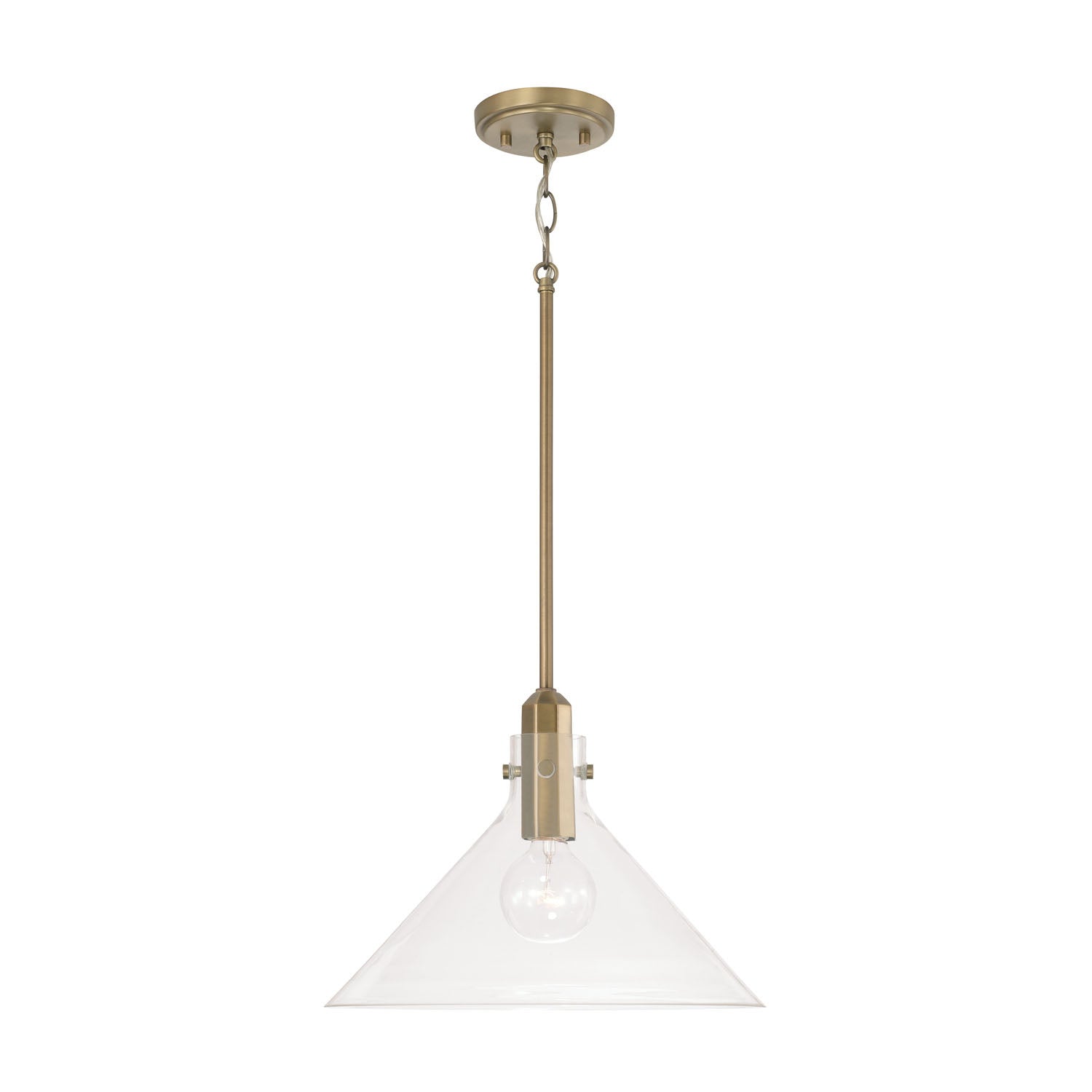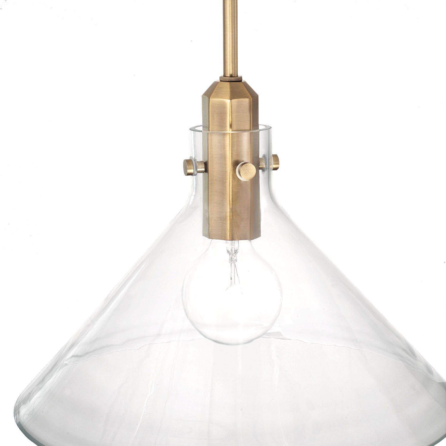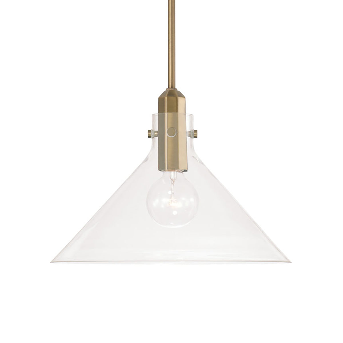 A modern take on midcentury style, the Nash Pendant 14" brings understated sophistication to any space with its clean, minimalist design. This thoughtfully crafted pendant features a round canopy, downrod support, faceted socket, and rivet details in an Aged Brass finish. A sleek, clear conical glass shade provides beautiful ambient lighting while showcasing the bulb within. The simple yet elegant silhouette creates striking illumination perfect for dining rooms, kitchen islands, or entryways where refined design meets functional lighting needs.
