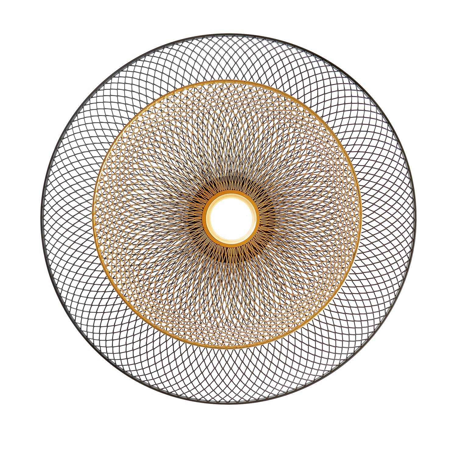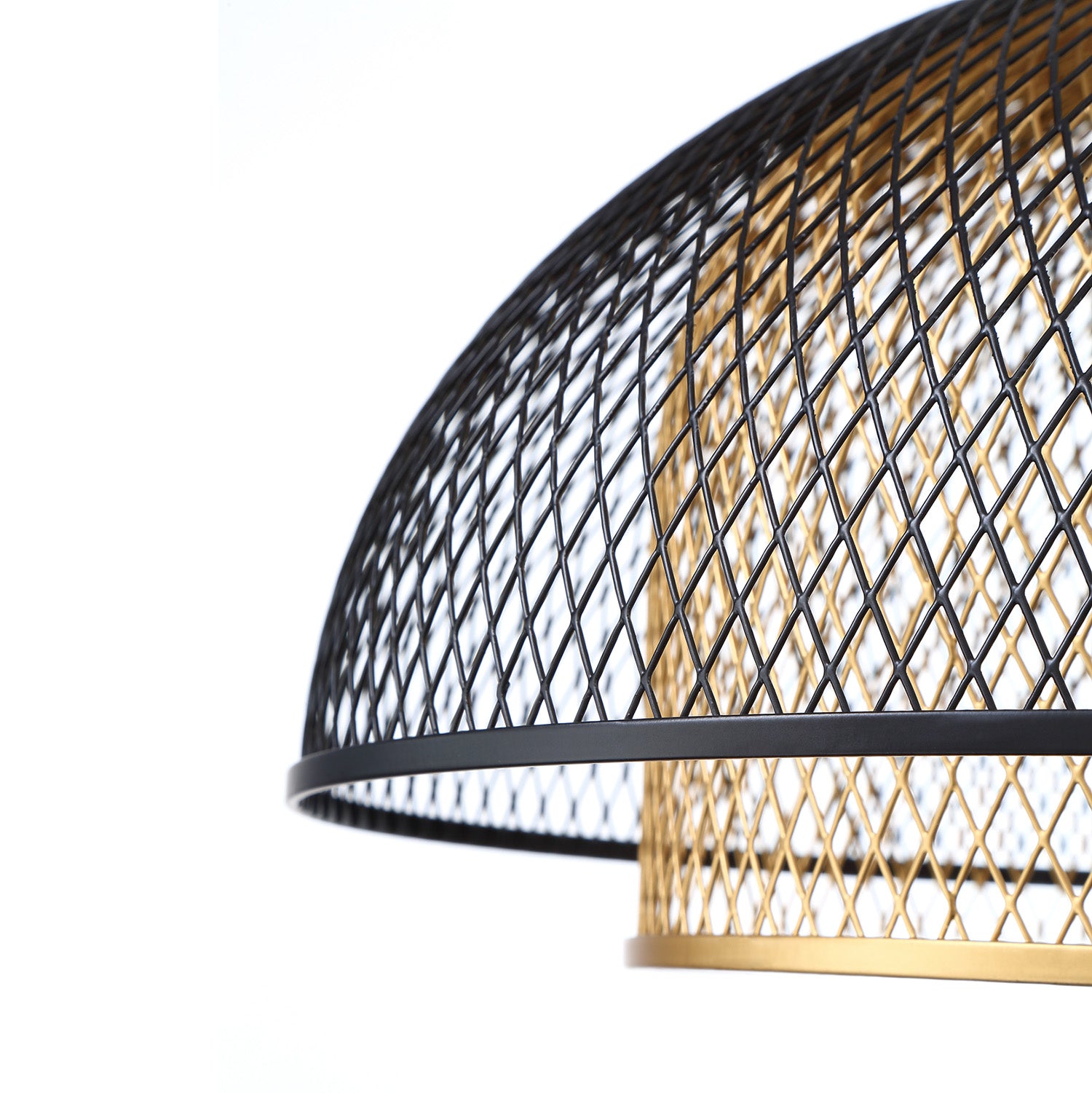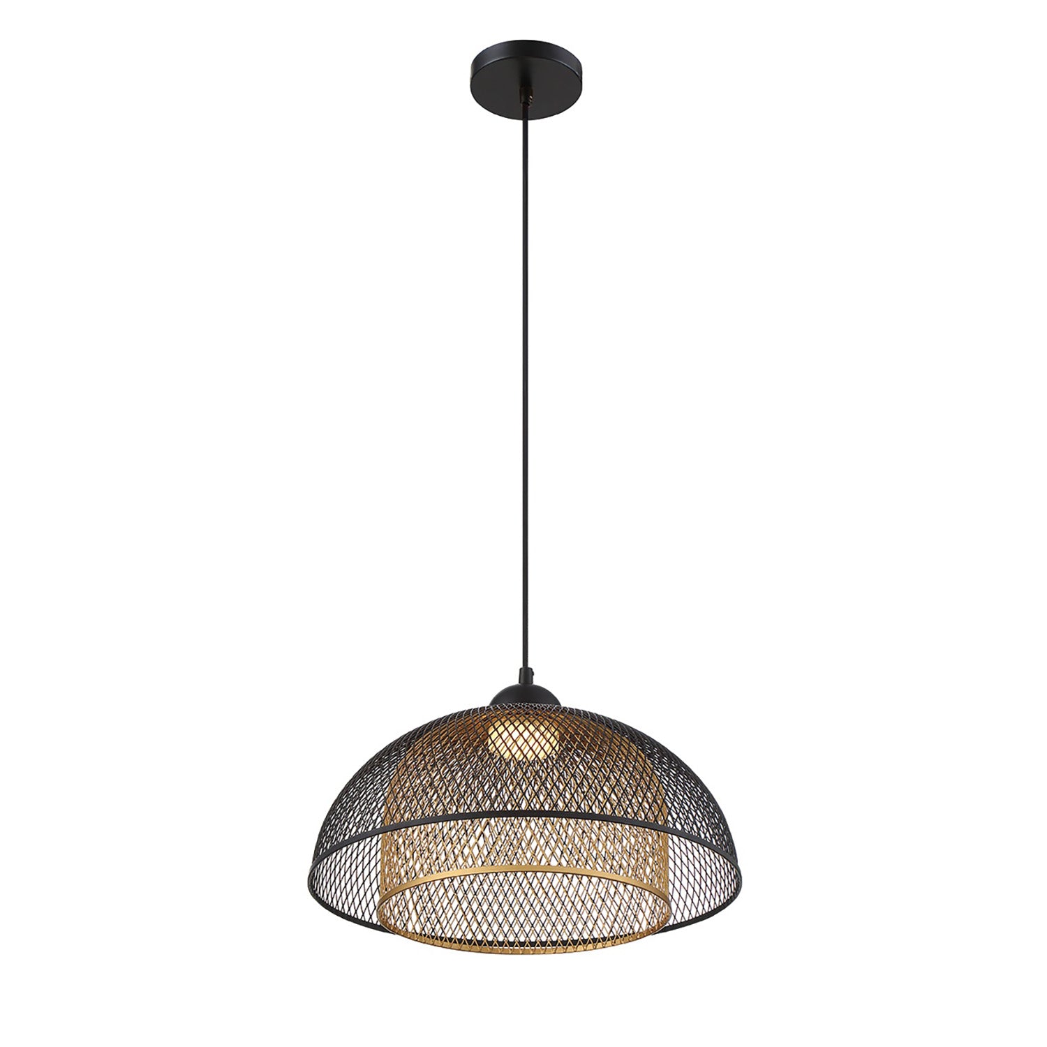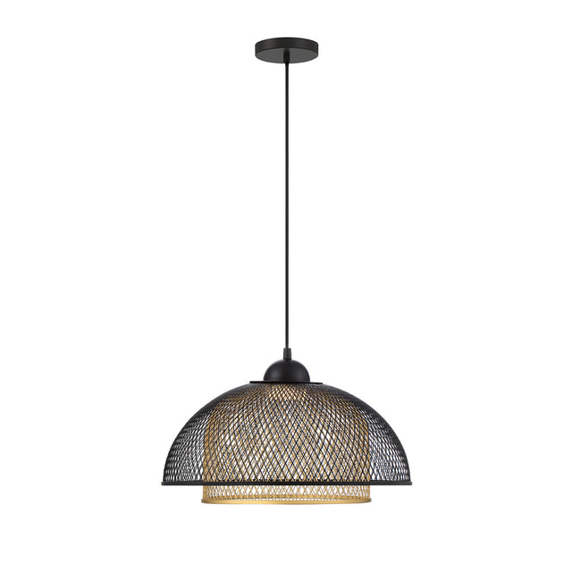 • Delicate black and brass mesh shade hangs from a single adjustable black cord, creating dazzling light patterns on walls