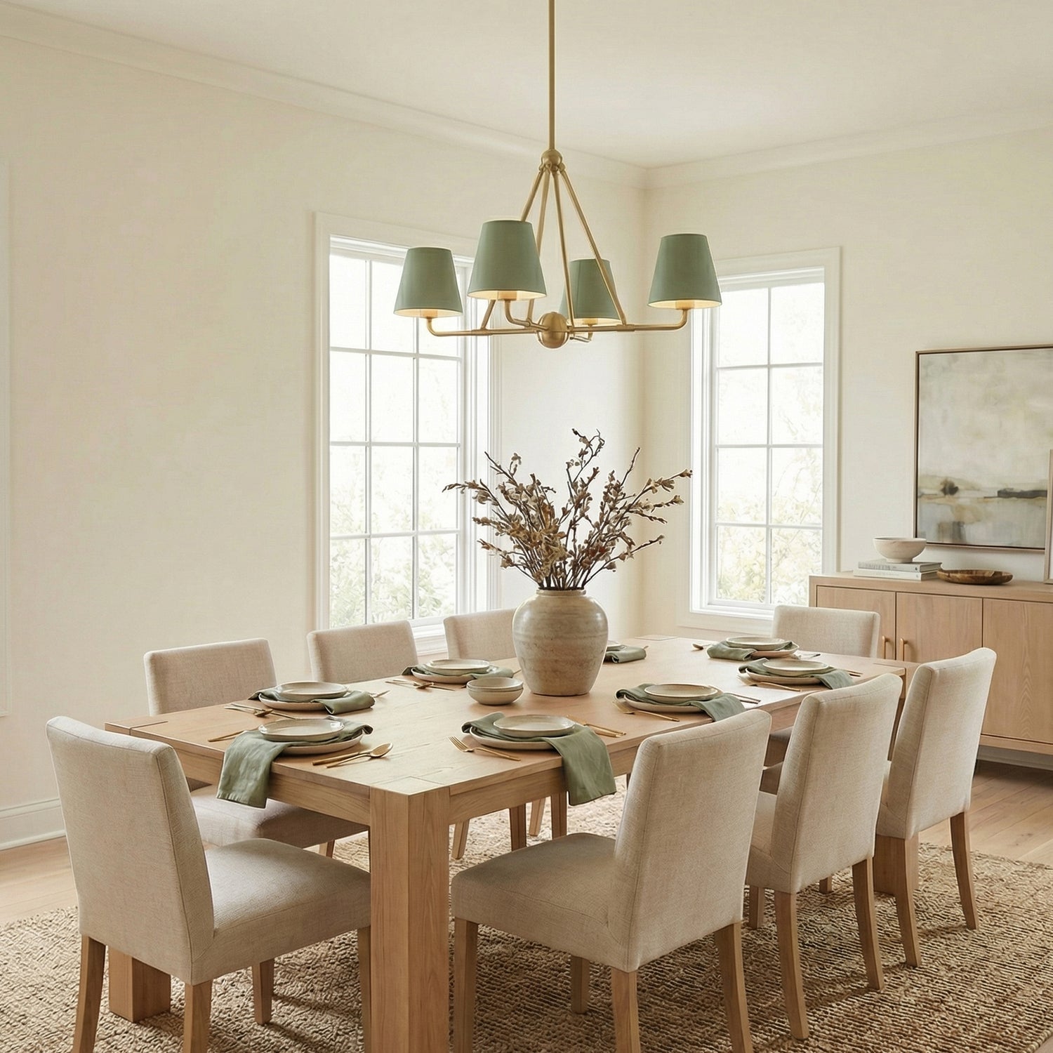 The Banks 4 Light Chandelier brings refined elegance with a touch of color. Featuring four sage green conical metal shades with white interiors and a brass body, this chandelier provides balanced illumination, perfect for dining tables, kitchen islands, or entryways. The combination of sage green and brass adds warmth and contemporary style, effortlessly complementing a variety of interior designs. Clean lines and thoughtful proportions create a fixture that makes a statement while maintaining a timeless, uncluttered look—ideal for the modern home.