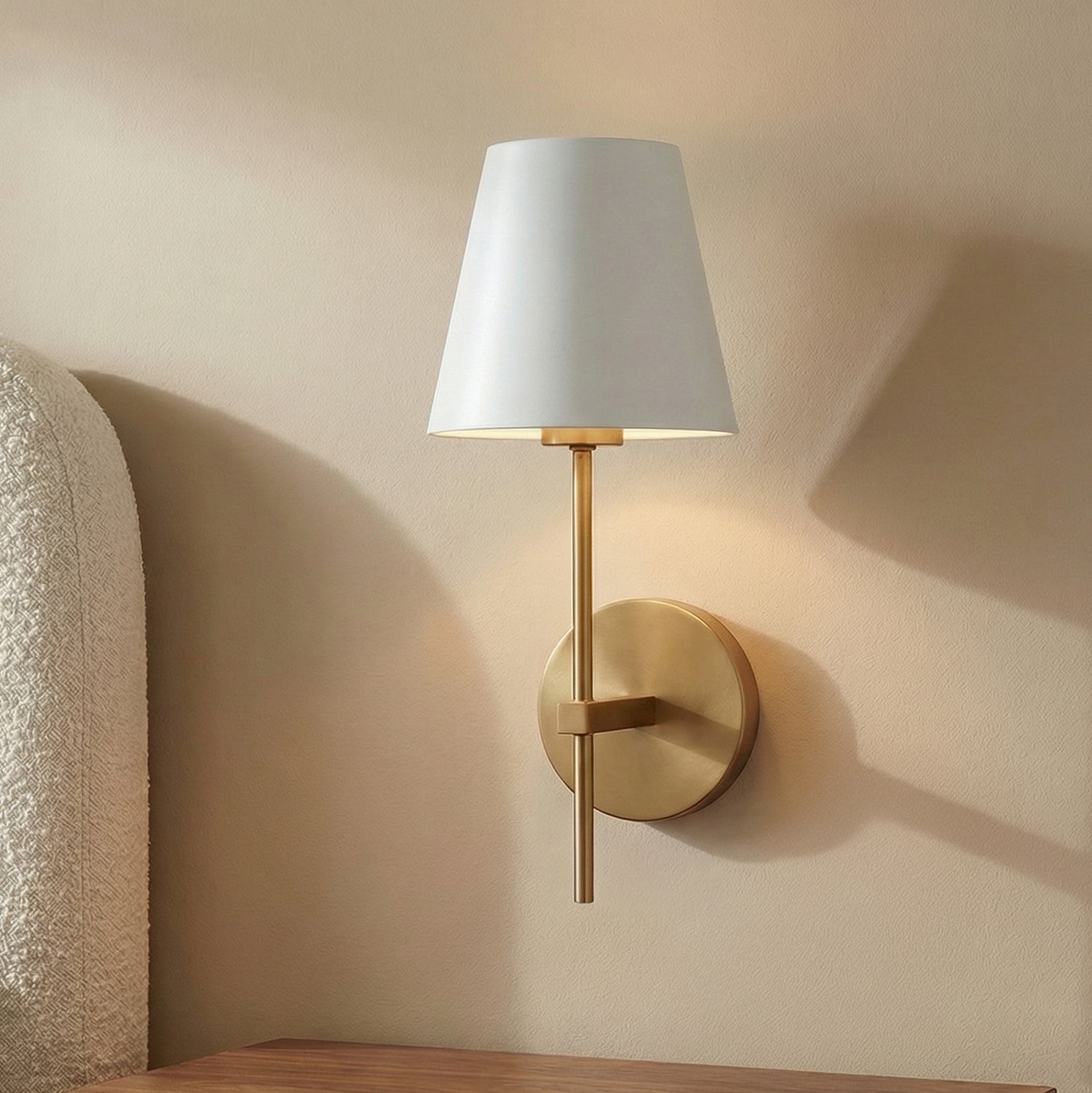 The Banks 15" Wall Sconce brings a refined, modern touch to your walls with its elegant contrast of a white conical metal shade and a brass body. The sleek, slender design provides focused illumination, making it perfect for hallways, bedside use, or highlighting mirrors and artwork. Its sophisticated blend of finishes adds warmth and contemporary flair to any space. Damp-rated, this versatile sconce fits beautifully in bathrooms, bedrooms, living rooms, or foyers, offering both style and function in a timeless, elegant design.