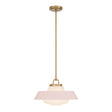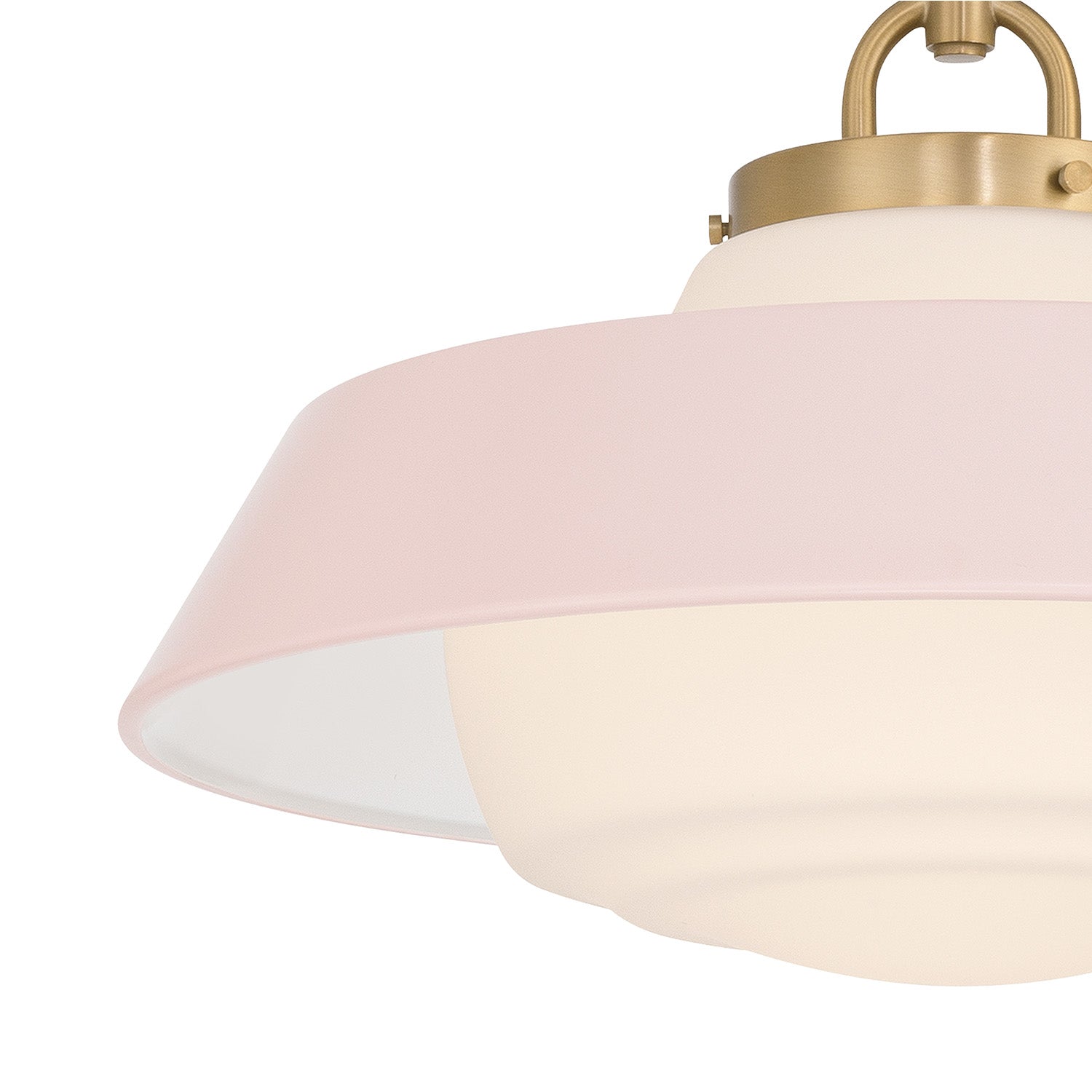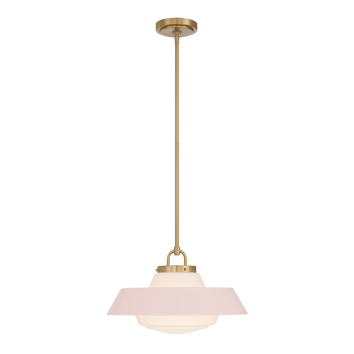 The Blaine Pendant 16" captures a mid-century-inspired aesthetic, defined by clean architectural lines and vibrant pops of color. This fixture pairs a brilliant white opal glass diffuser with a colorful steel shade and warm brass accents, creating a two-toned finish that brings a sense of refined character to any interior. The soft Rose Quartz finish lends a delicate, blush-toned elegance to the structured frame, providing a gentle and welcoming glow perfect for nurseries, bedrooms, or boutique-inspired spaces.