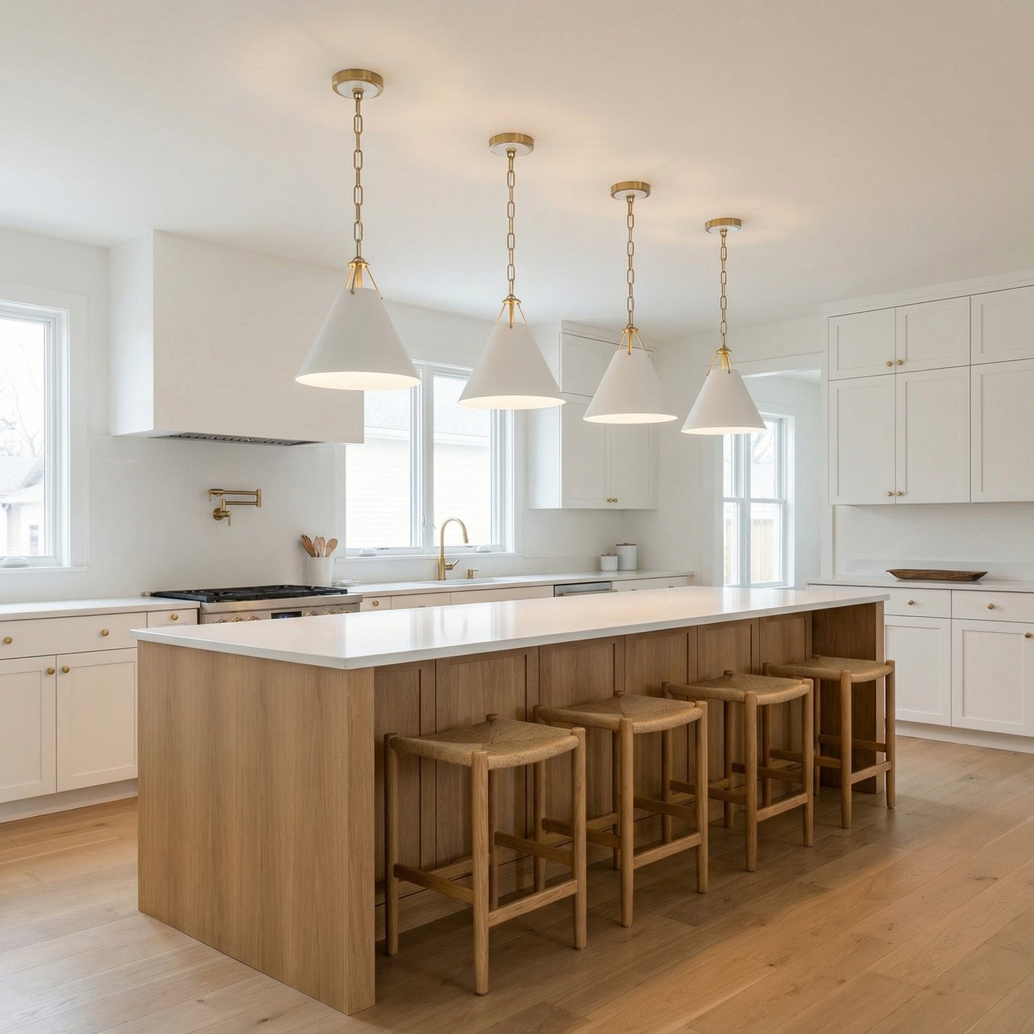 • A single-bulb pendant light with a conical metal shade, finished in white with brass detailing, and a crisp white interior for enhanced illumination