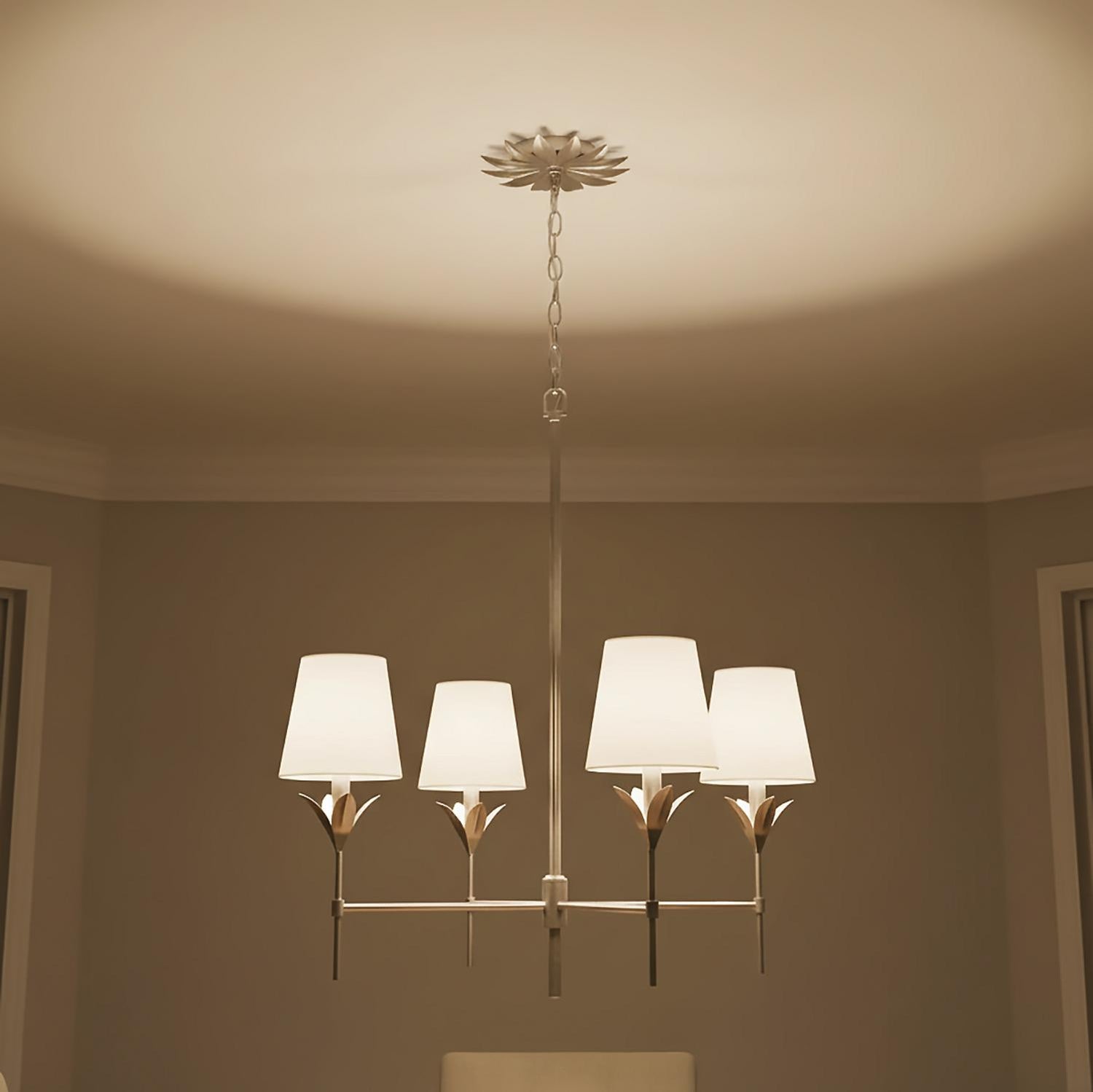 The Alice 4 Light Chandelier brings refined elegance to your space with sculptural leaf details and tailored fabric shades. Finished in antique silver, this fixture offers timeless appeal with a touch of vintage charm. The crisp white shades diffuse light beautifully, casting a warm, inviting glow. With a balanced 28" diameter, it makes a statement while maintaining graceful proportions, perfect for dining rooms, living areas, or entryways. The included 72" chain and rod allow for adjustable hanging height, ensuring a seamless fit for your space.