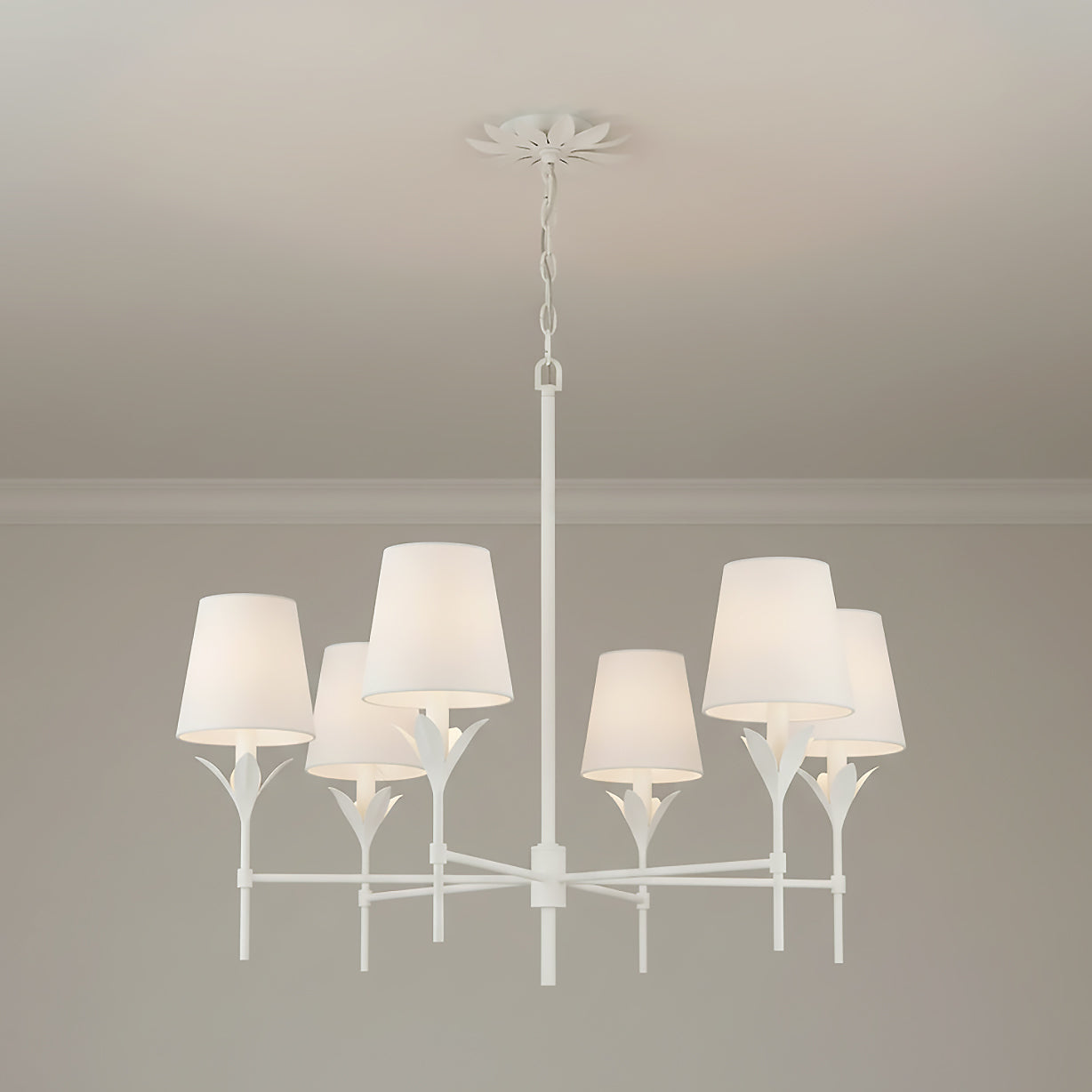 The Alice 6 Light Chandelier brings refined elegance to your space with sculptural leaf details and tailored white fabric shades. Finished in fresh matte white, this fixture exudes timeless charm with a touch of vintage inspiration. Six crisp fabric shades diffuse light beautifully, casting a warm, inviting glow. With a balanced 32" diameter, it makes a statement while maintaining graceful proportions, perfect for dining rooms, living areas, or entryways. The included 72" chain and rod allow for adjustable hanging height, ensuring a seamless fit for your space.