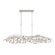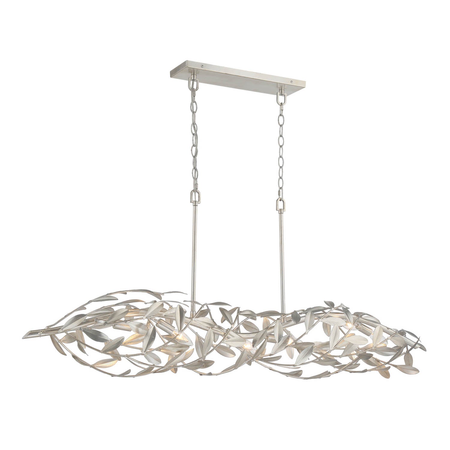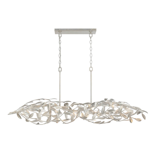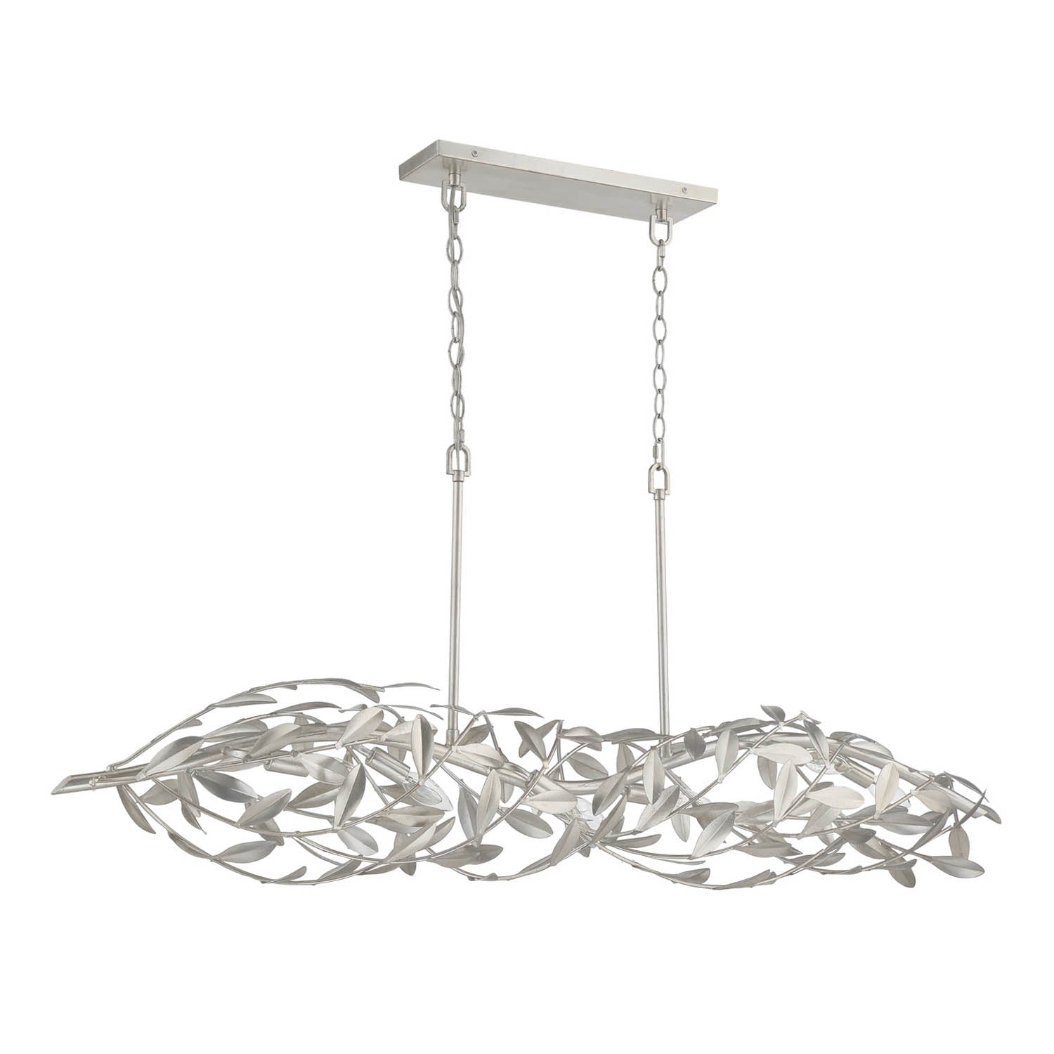 The Alison Linear Chandelier 50" is a classic transitional light that makes a breathtaking statement with its intricate, nature-inspired design. The fixture features individual wrought iron leaves that are masterfully arranged to create a shimmering, cloud-like silhouette. This glamorous linear chandelier is thoughtfully designed to provide stunning, multi-directional illumination, making it an ideal centerpiece for a large dining table or kitchen island. With its UL damp rating, it offers both exceptional visual interest and versatile appeal in various indoor environments. The sophisticated Antique Silver finish enhances the delicate floral details, delivering enduring style and a perfect blend of artistic elegance and modern charm.
