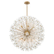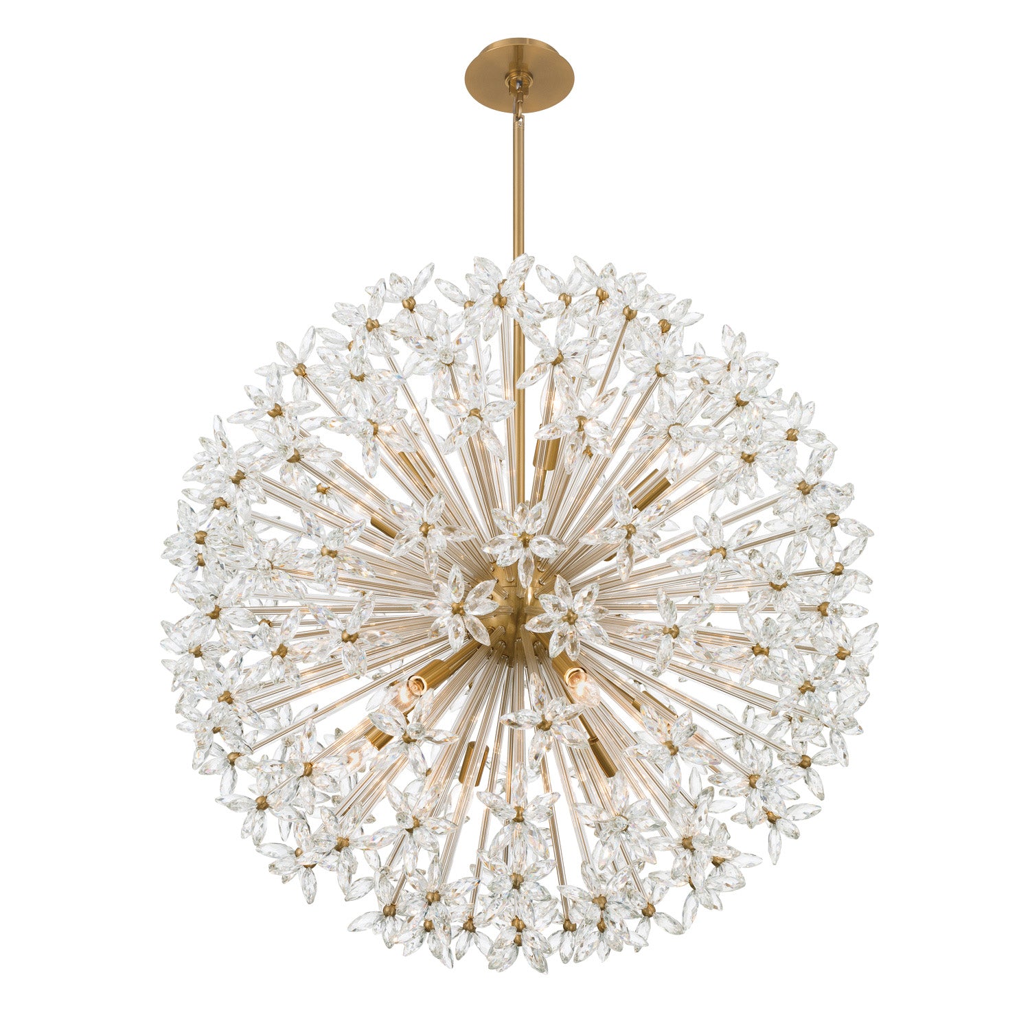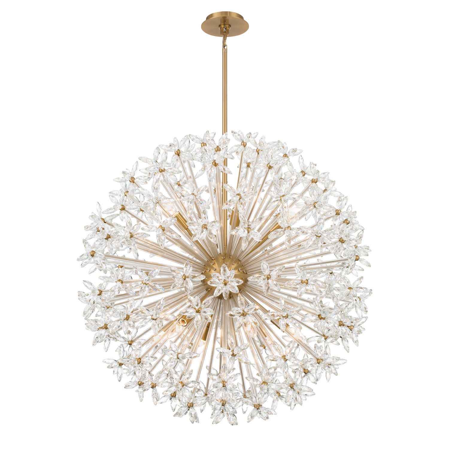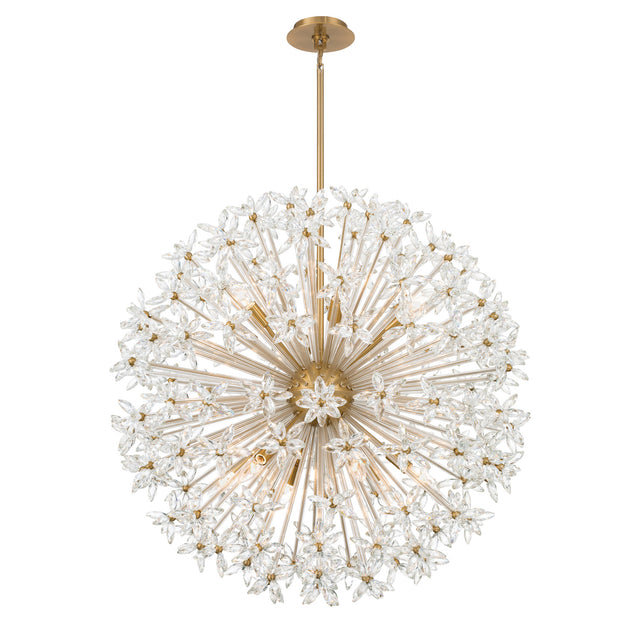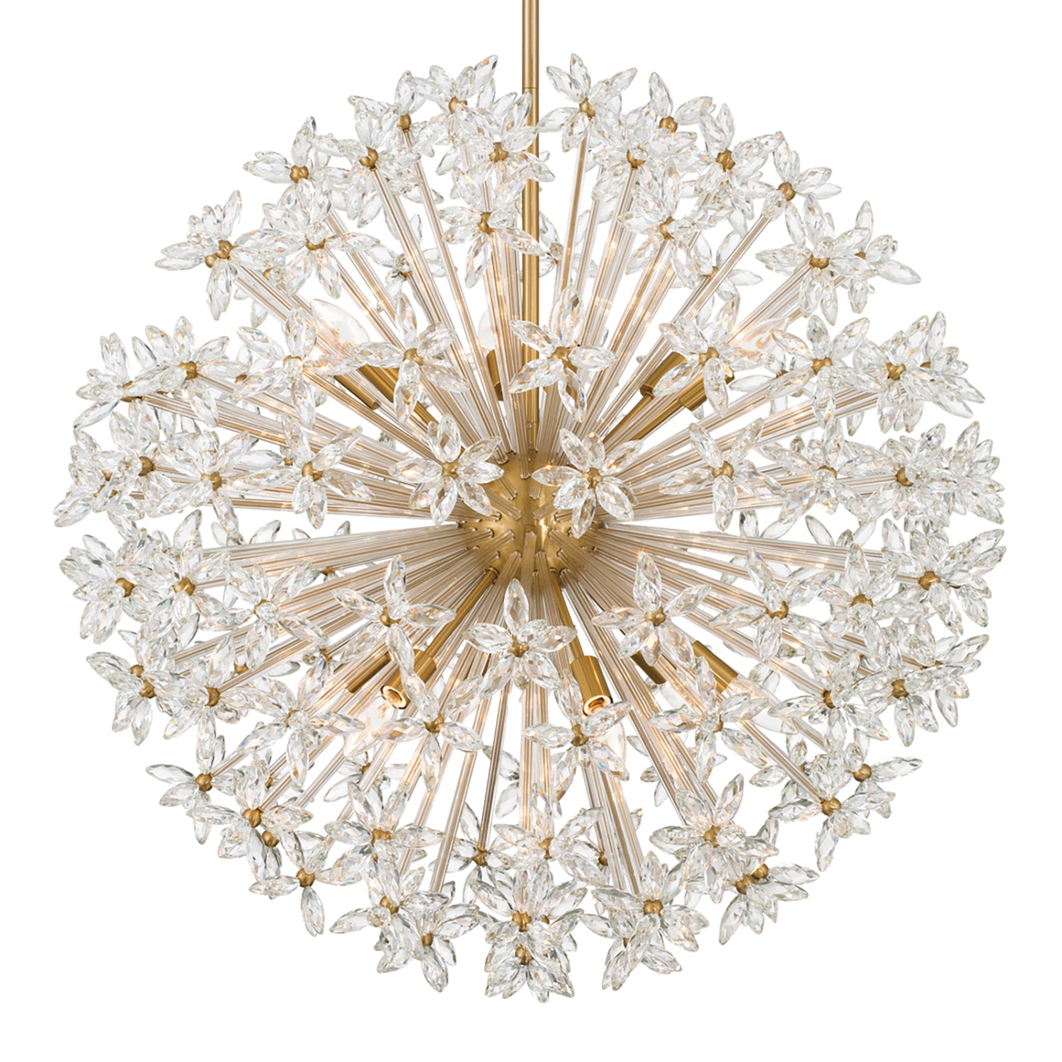 The Eliana Pendant 34" is a classic transitional light that transforms light into a dazzling display with its faceted crystal accents arranged in a radiant floral composition. The fixture features a large-scale arrangement of faceted cut crystals that are masterfully positioned to create a shimmering, sculptural silhouette. This grand glamorous pendant is thoughtfully designed to provide stunning, expansive illumination, making it an ideal centerpiece for a large foyer or grand dining room. With its UL dry rating, it offers both exceptional visual interest and a sophisticated decorative presence. The opulent Aged Brass finish enhances the sparkling floral details, delivering enduring style and a perfect blend of artistic elegance and modern charm.
