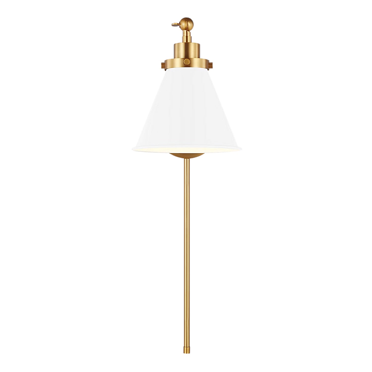 • Adjustable one-arm wall sconce with a matte white shade and modern brass finish for a sophisticated, contemporary look