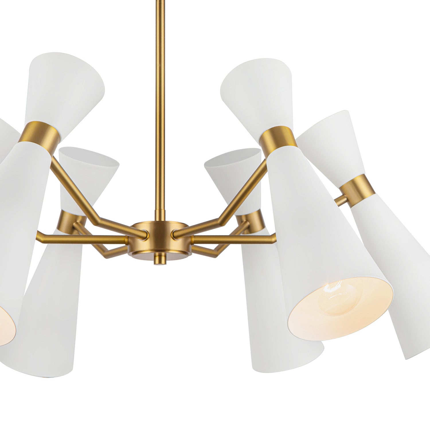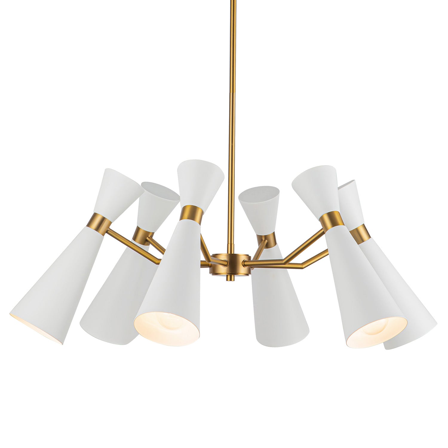 • Aiden mid-century-modern chandelier features six flared conical metal shades in white with antique brass accents
