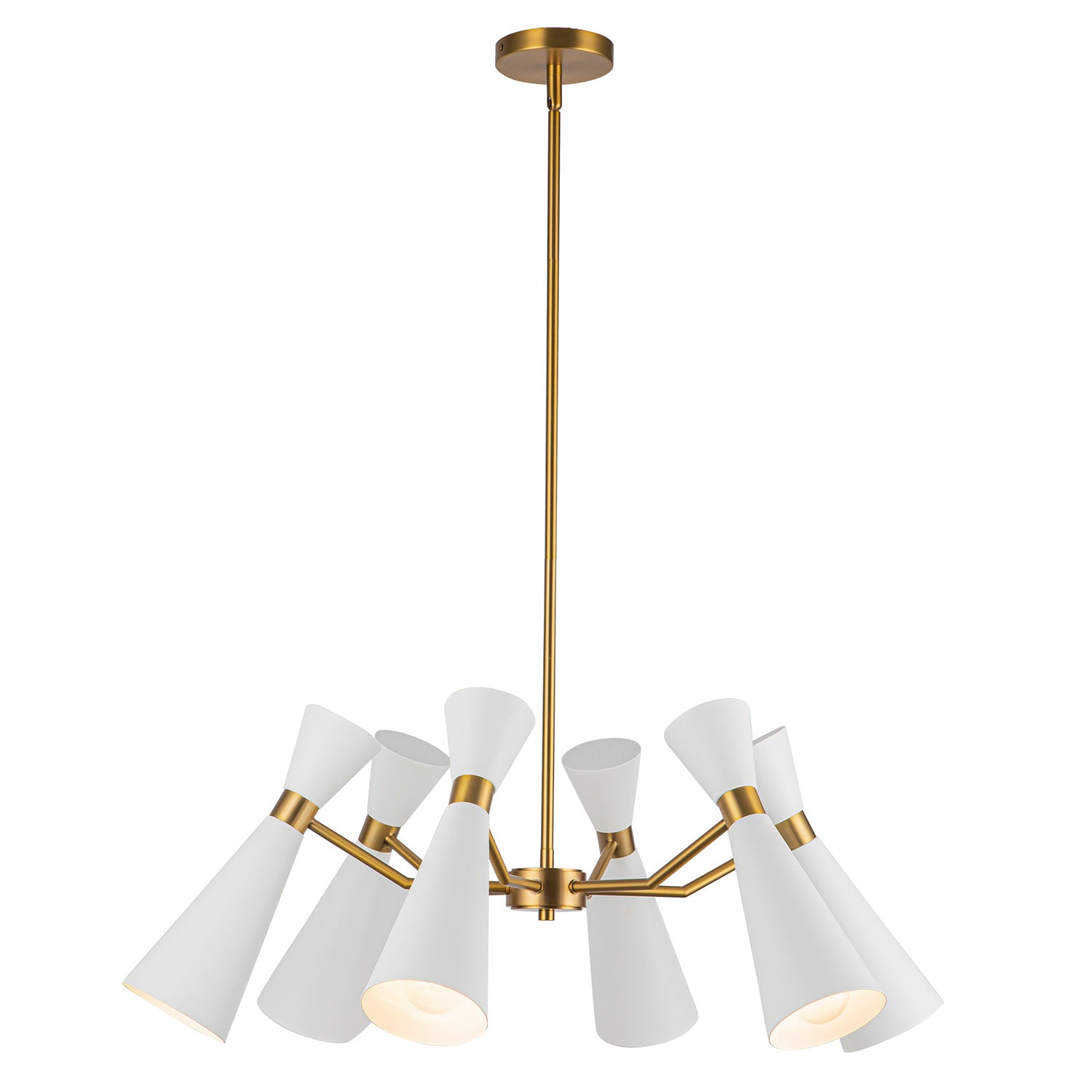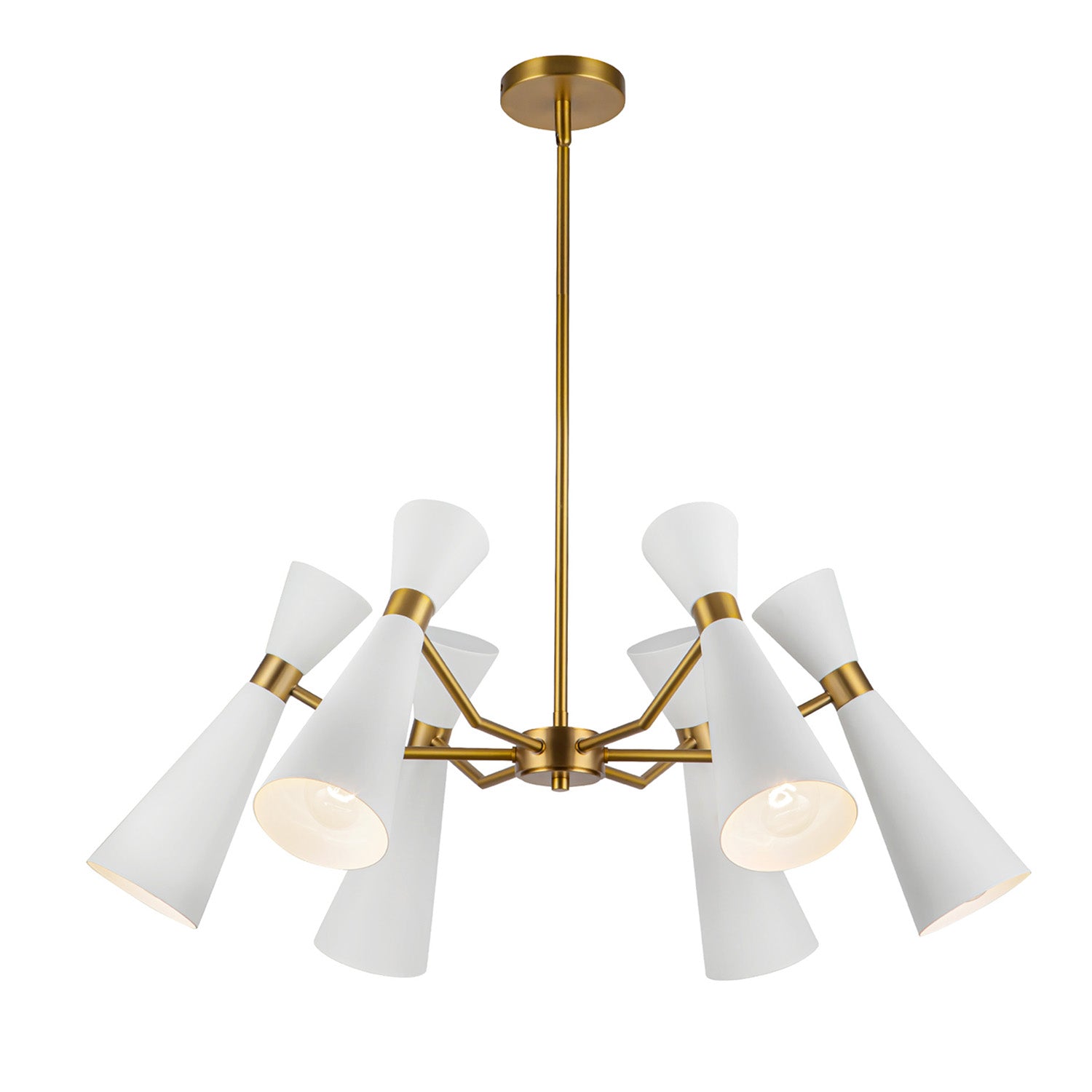 The Aiden Chandelier showcases mid-century-modern design with a contemporary twist. This striking fixture features four flared conical metal shades that extend from a central hub, creating a dynamic silhouette. Each crisp white shade is accented with antique brass detailing at the neck, offering a beautiful contrast while directing light precisely where needed. The warm metallic tones continue through the central body and the slim suspension rod, adding refined elegance to the bold geometric form. With its expansive 32-inch diameter, this chandelier makes a dramatic statement over large dining tables, kitchen islands, or in spacious living areas, blending retro-inspired elements with modern sophistication.