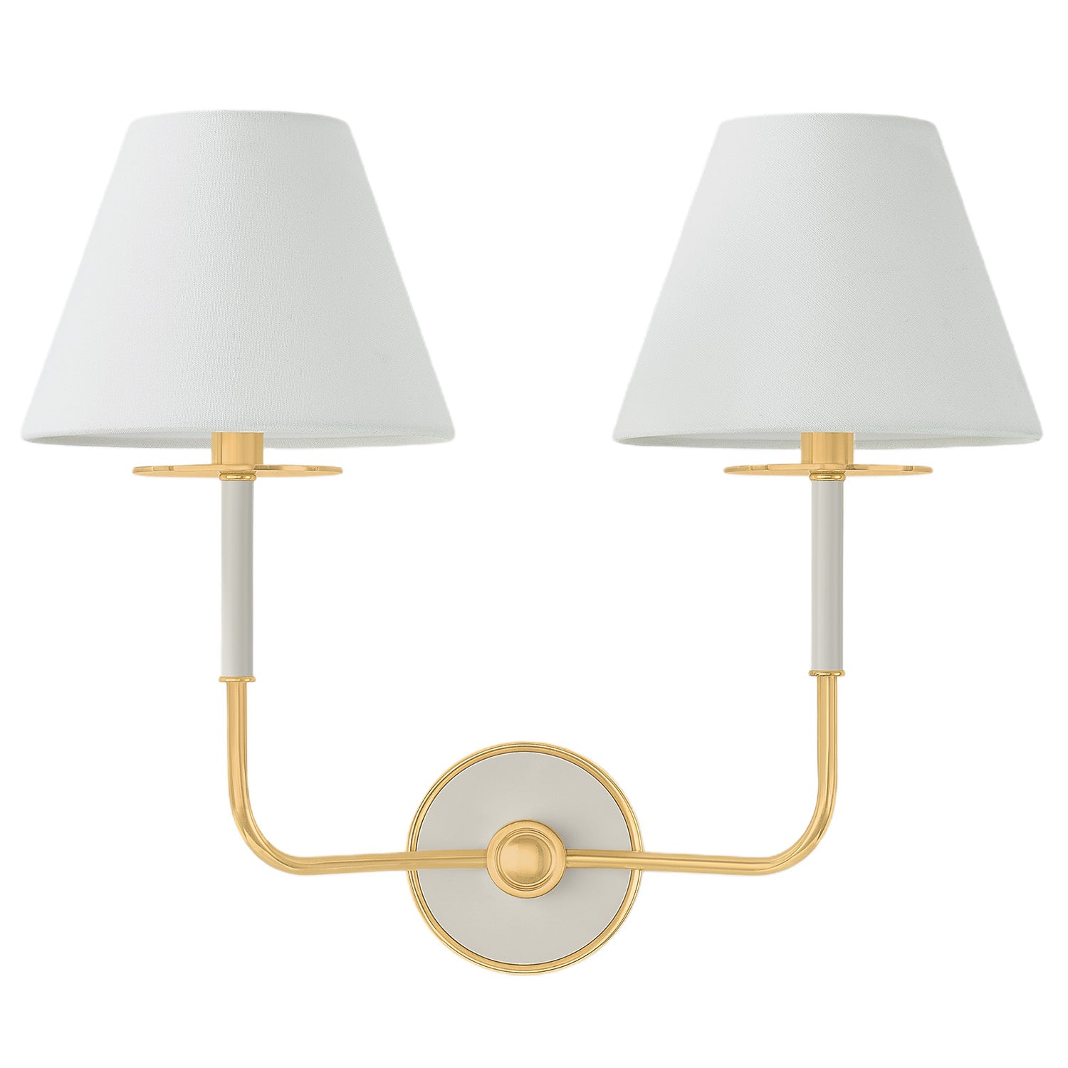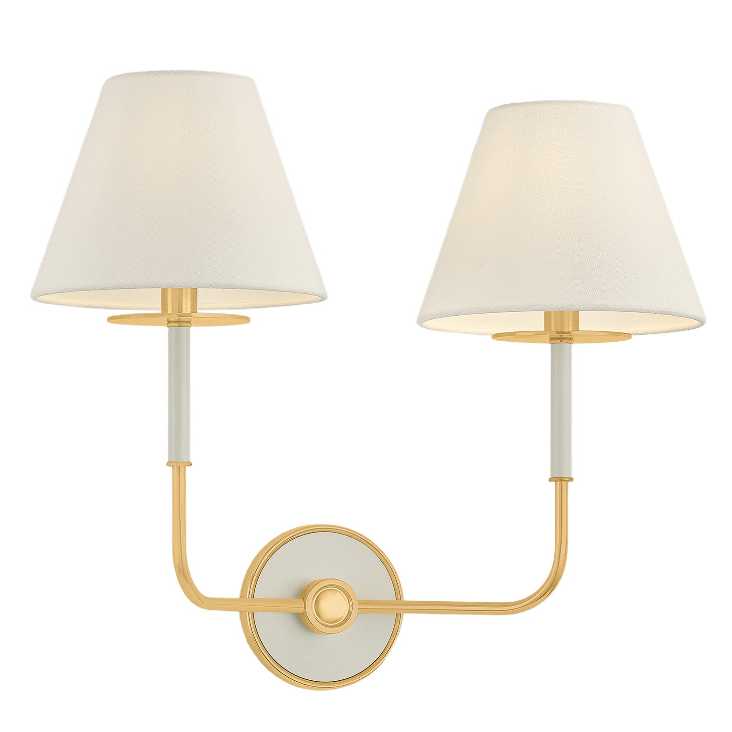 The Cicero Double Wall Sconce 16" evokes a sense of timeless charm through its refined framework and soft, tailored shades. This two-light fixture features a classic shape with gently curved metalwork and mixed finishes that create a sophisticated, curated aesthetic. The Aged Brass frame is further enhanced by off-white details, providing a rich tonal contrast that highlights the artisanal quality of the design. Perfectly balanced and elegant, this double sconce brings a warm, inviting glow to larger wall spaces, entryways, or living areas.