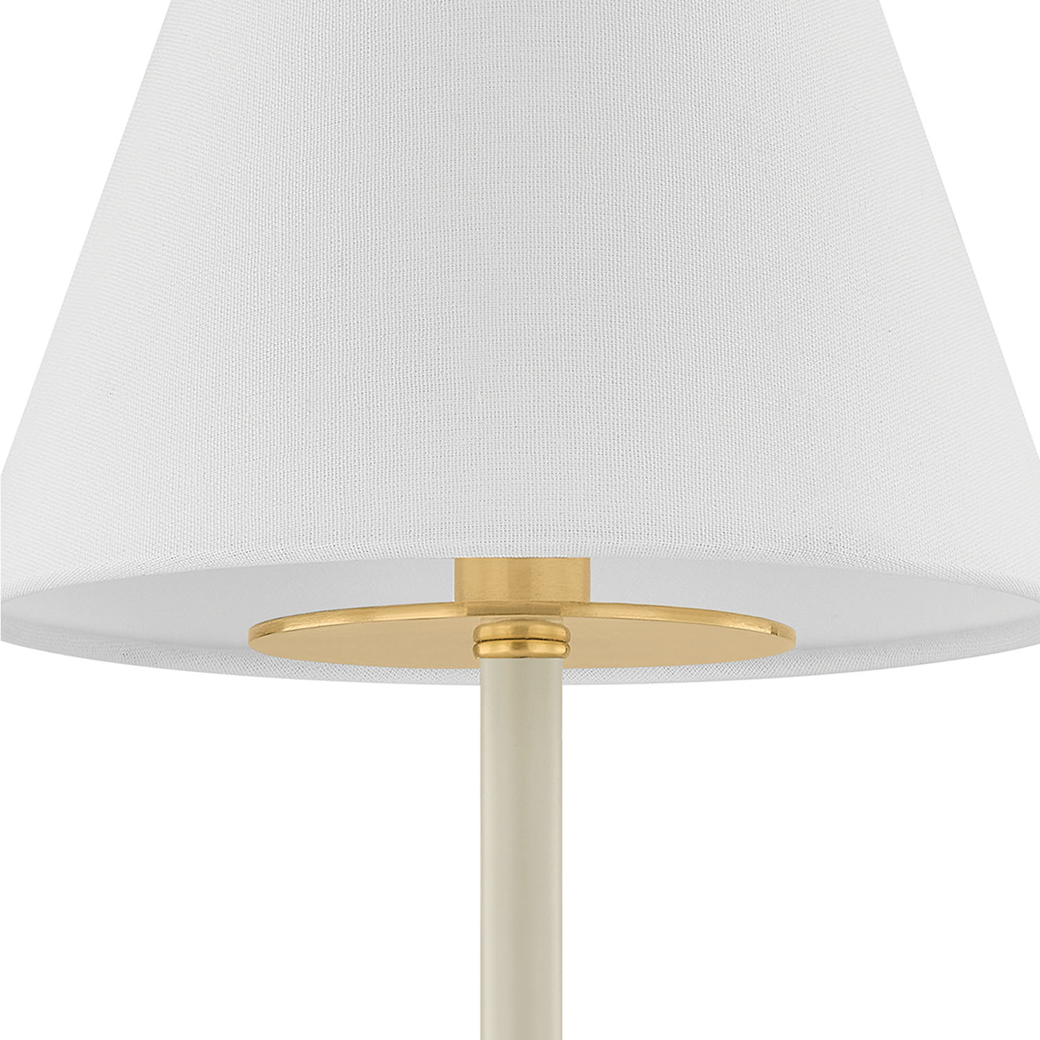 • Cicero features a classic two-light wall sconce with a refined Aged Brass and Off-White frame and white fabric shades