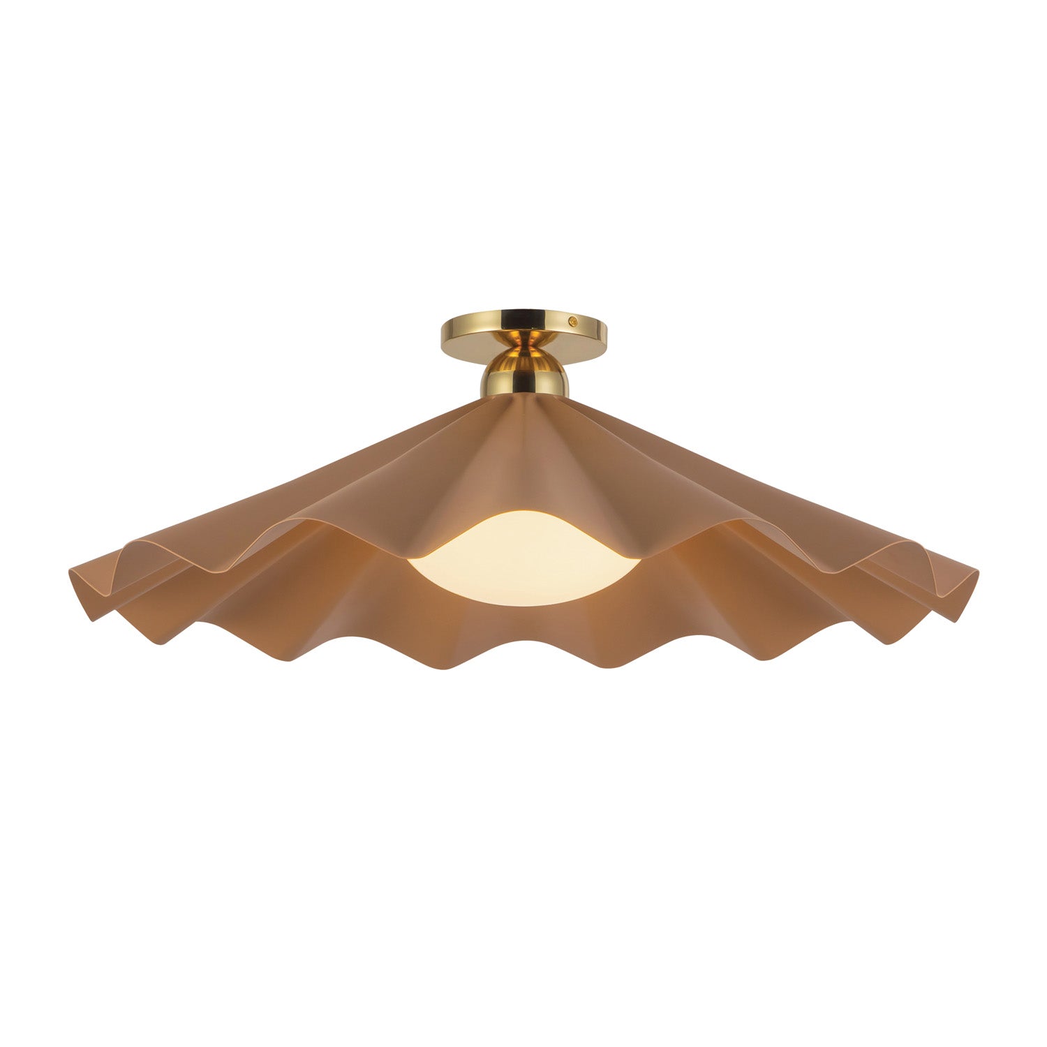 The Babette Large Semi-Flush 25", Blush and Brass celebrates the beauty of rarity and form. This fixture features an oblong, pearl-like opal glass diffuser nestled within a ruffled metal “shell” finished in a soft blush with brass accents. By combining whimsical, fan-like geometry with classic lighting elements, the Babette serves as a uniquely expressive focal point that transforms overhead lighting into a sculptural art piece. Its playful yet sophisticated form brings a vibrant pop of color and refined texture to modern interiors, creating a visually striking atmosphere without unnecessary clutter.