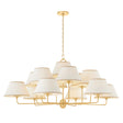 The Belmont 13 Light Chandelier 55" features a vintage-inspired silhouette that brings a sophisticated, multi-tiered presence to dining and living areas. Arranged at varying heights, the oversized, white linen tapered shades create a voluminous effect, filling the room with a soft, expansive glow. Contrasting ivory trim along the shades' edges provides subtle visual interest while remaining fresh and neutral. The steel frame and hardware is finished in Aged Brass with rounded right angles that keep the design feeling soft and refined.
