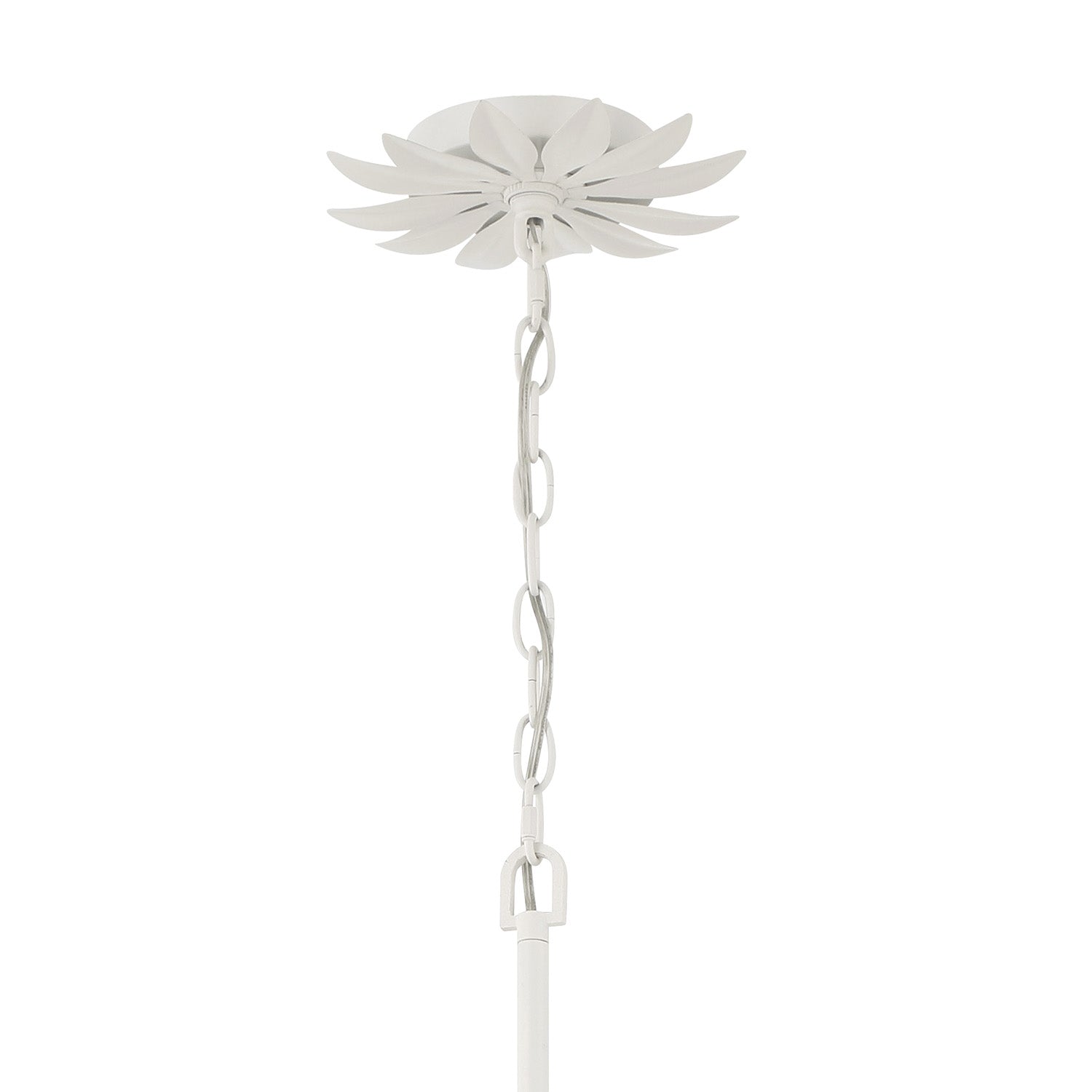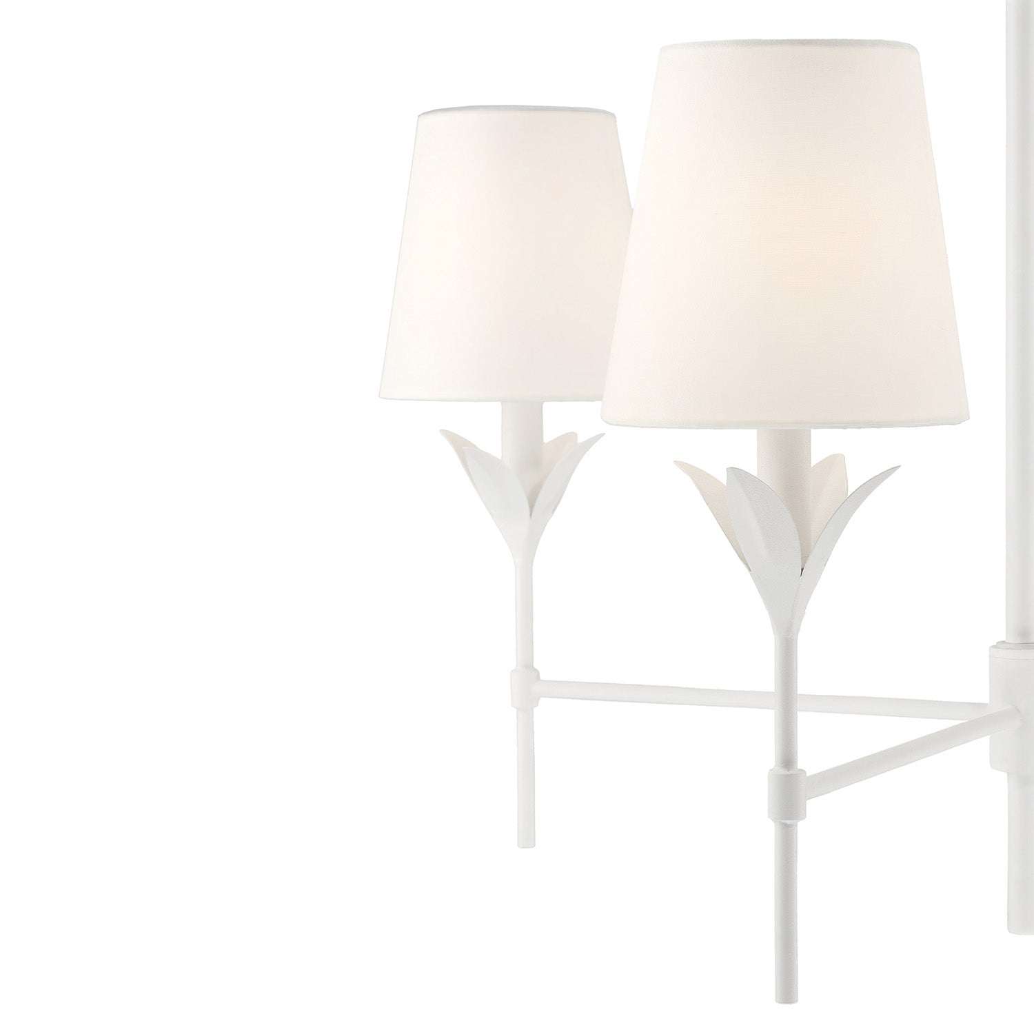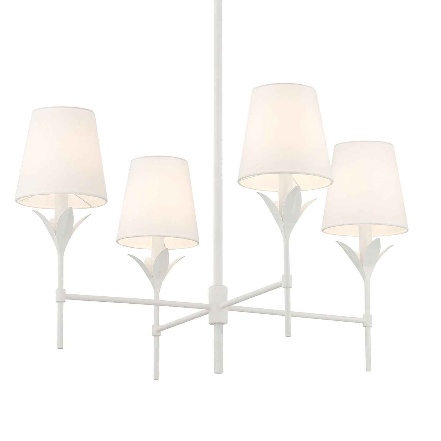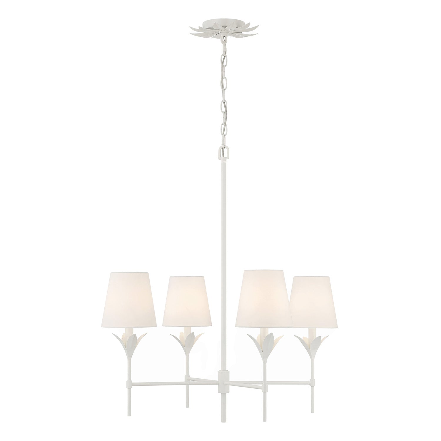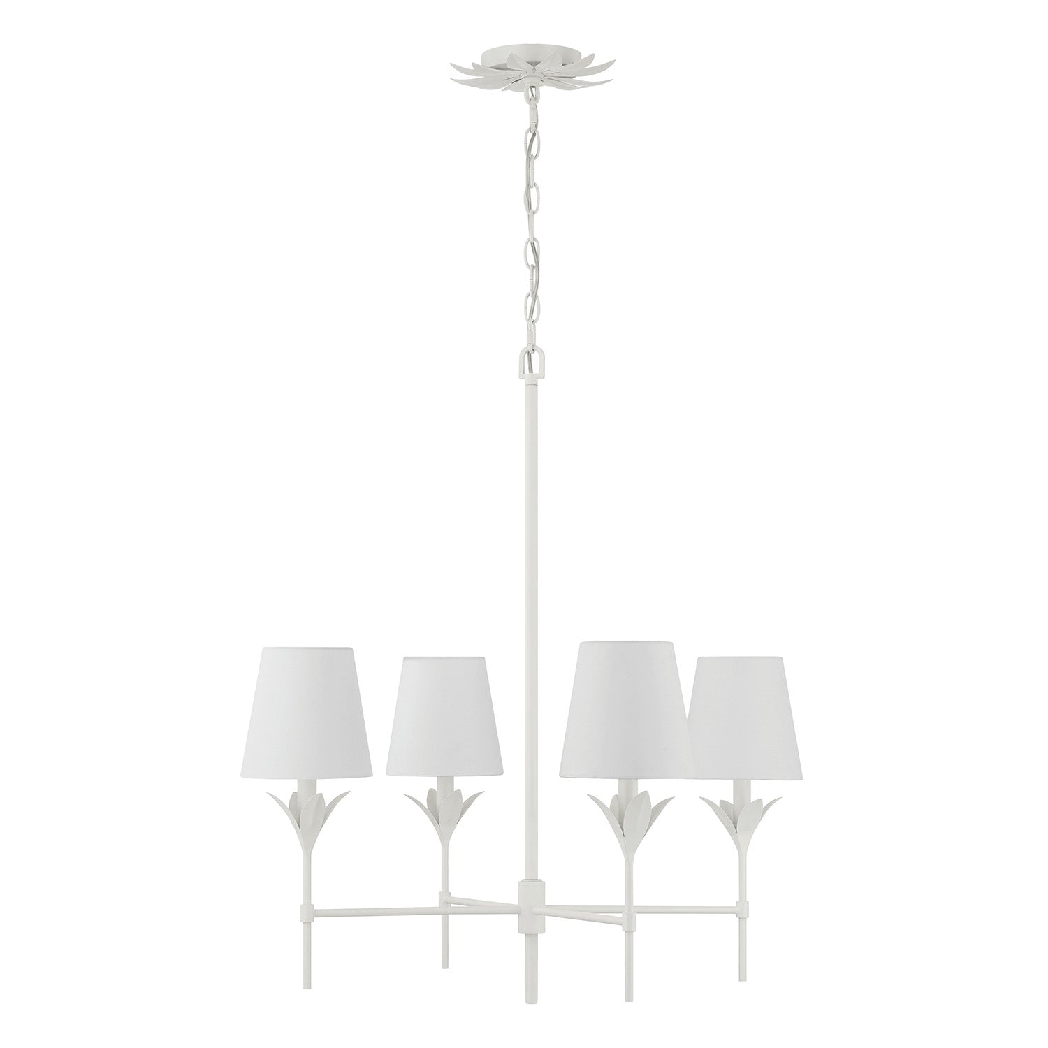 The Alice 4 Light Chandelier brings refined elegance to your space with sculptural leaf details and tailored fabric shades. Finished in fresh matte white, this fixture offers timeless appeal with a touch of vintage charm. The crisp white shades diffuse light beautifully, casting a warm, inviting glow. With a balanced 28" diameter, it makes a statement while maintaining graceful proportions, perfect for dining rooms, living areas, or entryways. The included 72" chain and rod allow for adjustable hanging height, ensuring a seamless fit for your space.