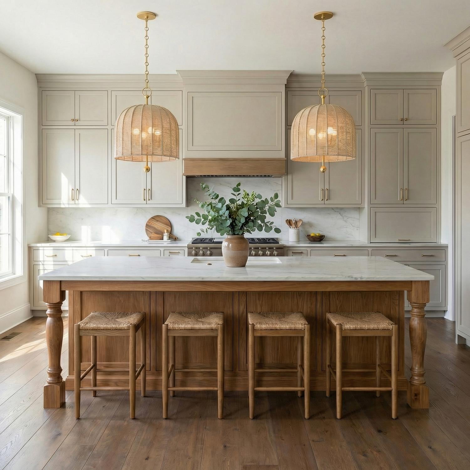 The Benito Pendant 20" redefines the classic dome light as a textural statement piece through the artisanal use of natural materials. This striking fixture features an expansive umbrella-shaped frame intricately hand-wrapped in natural rope, creating a warm, organic contrast against the hidden Gold Leaf accents. The unique construction allows light to pass through the weave, while a Gold Leaf stem appears to pierce through the entire fixture, finishing in a decorative sphere at the base. Perfectly scaled for larger rooms or expansive dining areas, this pendant brings a sense of refined, handcrafted luxury to modern, coastal, or transitional interiors.