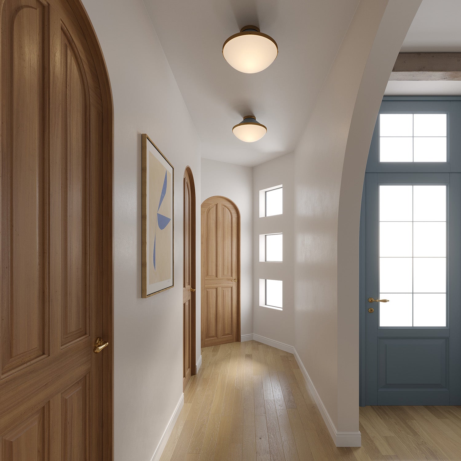 The Blair Flush Mount brings vintage-inspired charm to spaces with lower ceilings. Featuring a soft French blue frame and brass accents, this 16" fixture offers a gentle, inviting presence that complements any room. The white opal glass diffuser ensures even, gentle illumination, and the brass details add a touch of timeless elegance. Ideal for hallways, bedrooms, or bathrooms, this flush mount combines mid-century design with contemporary color. It creates a sophisticated focal point, elevating the style of any space.