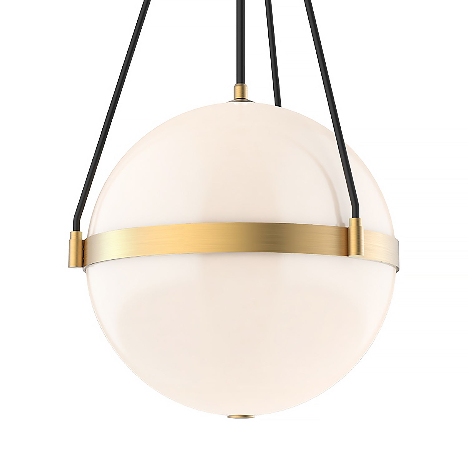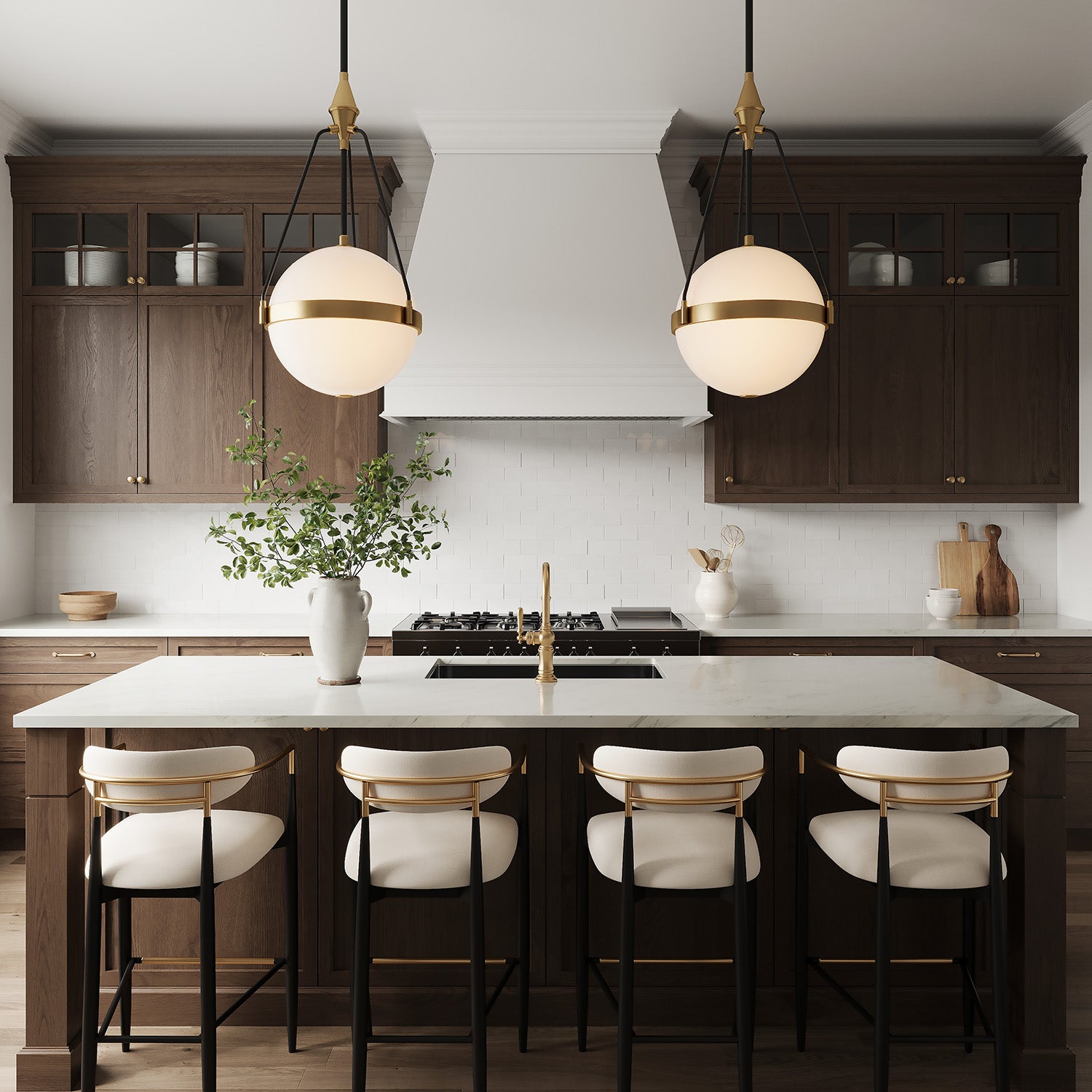 The Darcy Large Pendant features a striking design with a luminous milk glass sphere suspended within a geometric framework. The opaque white glass globe is accented by a Brushed Brass equatorial band and supported by three slender Matte Black rods that create an elegant silhouette. This mixed-metal ceiling light combines contemporary styling with timeless materials, creating a focal point that's both sophisticated and eye-catching. Measuring 18" in diameter, the Darcy provides beautiful diffused lighting that's perfect for dining areas, entryways, or spacious living rooms. The milk glass diffuser softens light while creating a warm, inviting glow when illuminated.