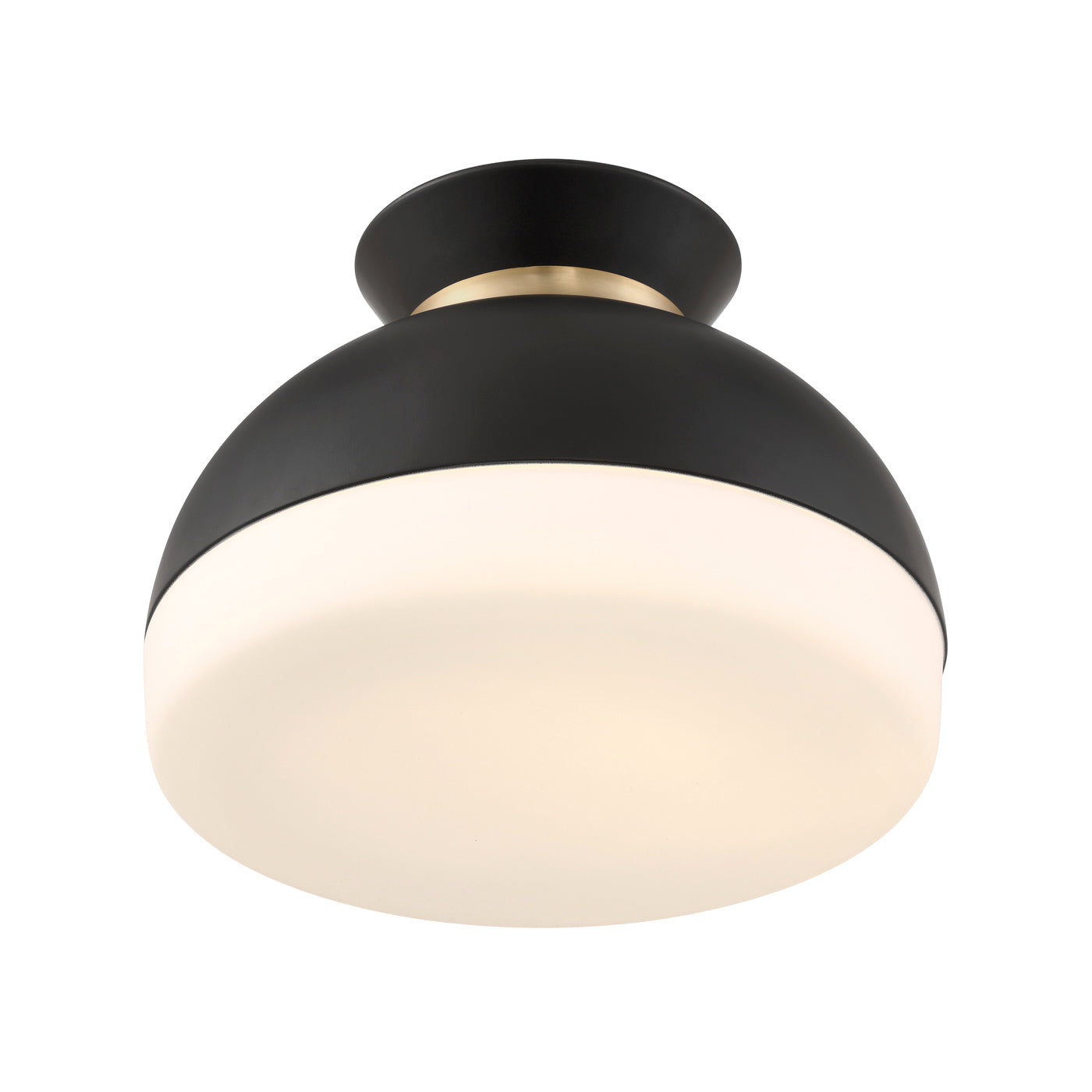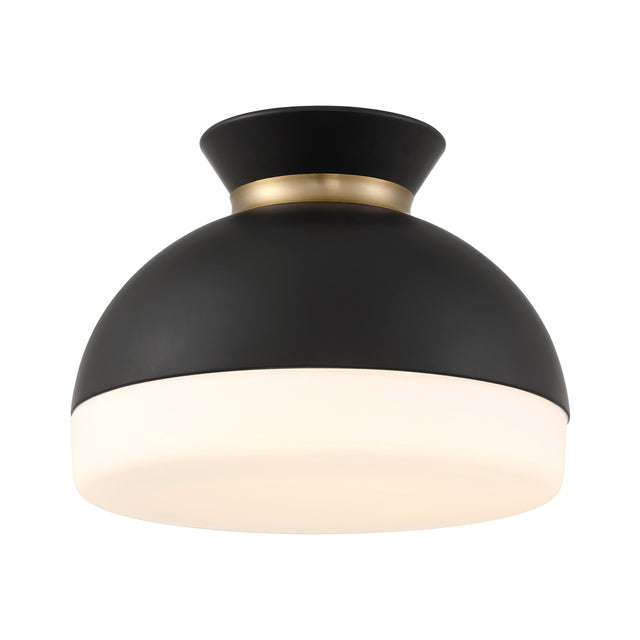 The Elody Flush Mount 15" features a warm and inviting design with a sophisticated Matte Black and Brass metal dome and flat opal glass shade. This versatile fixture measures 11.25" tall and 15" in diameter, making it perfect for hallways, bedrooms, or bathrooms with lower ceilings. The mid-century modern inspired silhouette brings a contemporary edge to various interior styles while providing even, downward illumination. The combination of the bold matte black finish, lustrous brass accents, and clean lines adds a touch of elegance to your space without being overly ornate. Damp-rated for use in bathrooms, the Elody creates a sophisticated lighting solution for any room in your home.