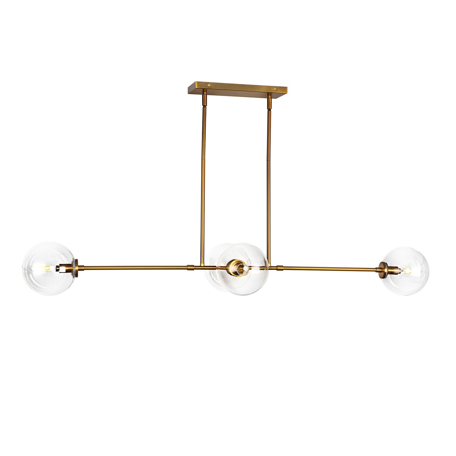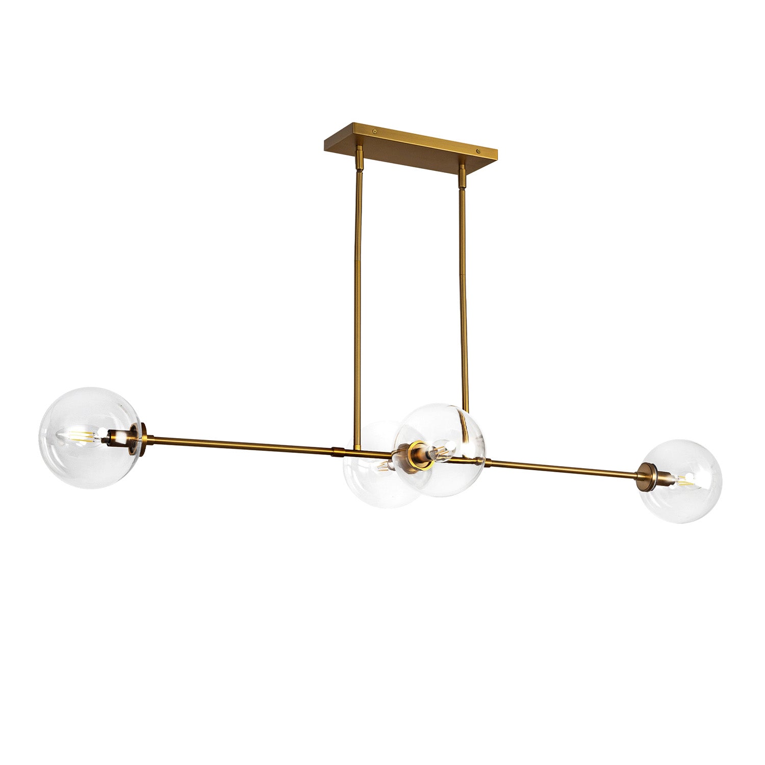 The Gurt 4 Light Linear Pendant brings bold mid-century modern style to any space with its distinctive linear silhouette and rich aged brass finish. This striking fixture features four clear glass spheres positioned along a sleek linear frame that creates dramatic ambient lighting while adding visual interest to dining rooms, kitchen islands, and living areas. The contemporary sputnik-inspired design provides clean lines and commanding presence, while the clear glass globes showcase the beauty of decorative bulbs. At 48" in length with adjustable hanging height, this linear pendant makes a statement piece that combines mid-century shapes with modern appeal for spaces that demand both class and personality.