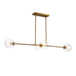 • The Gurt Linear Pendant features a modern sputnik design with four clear glass spheres positioned along a linear frame in an aged brass finish