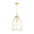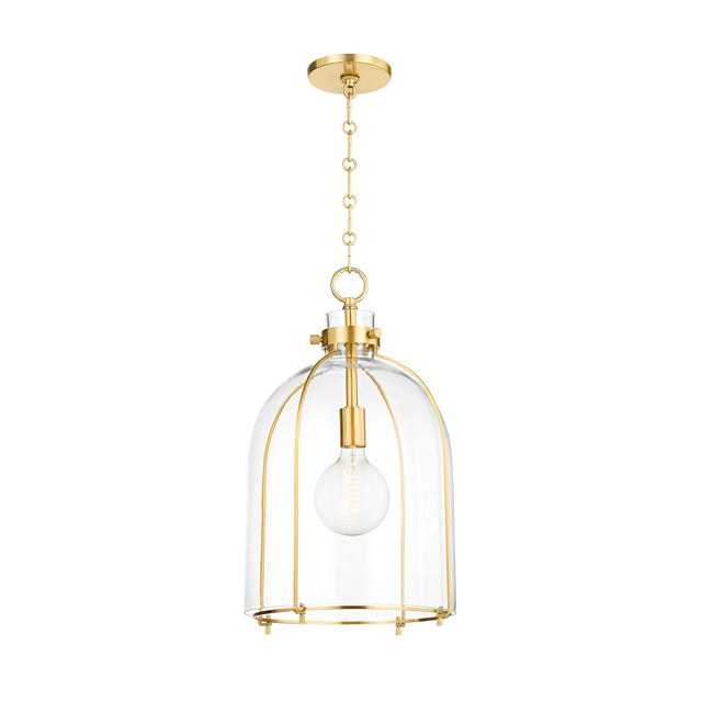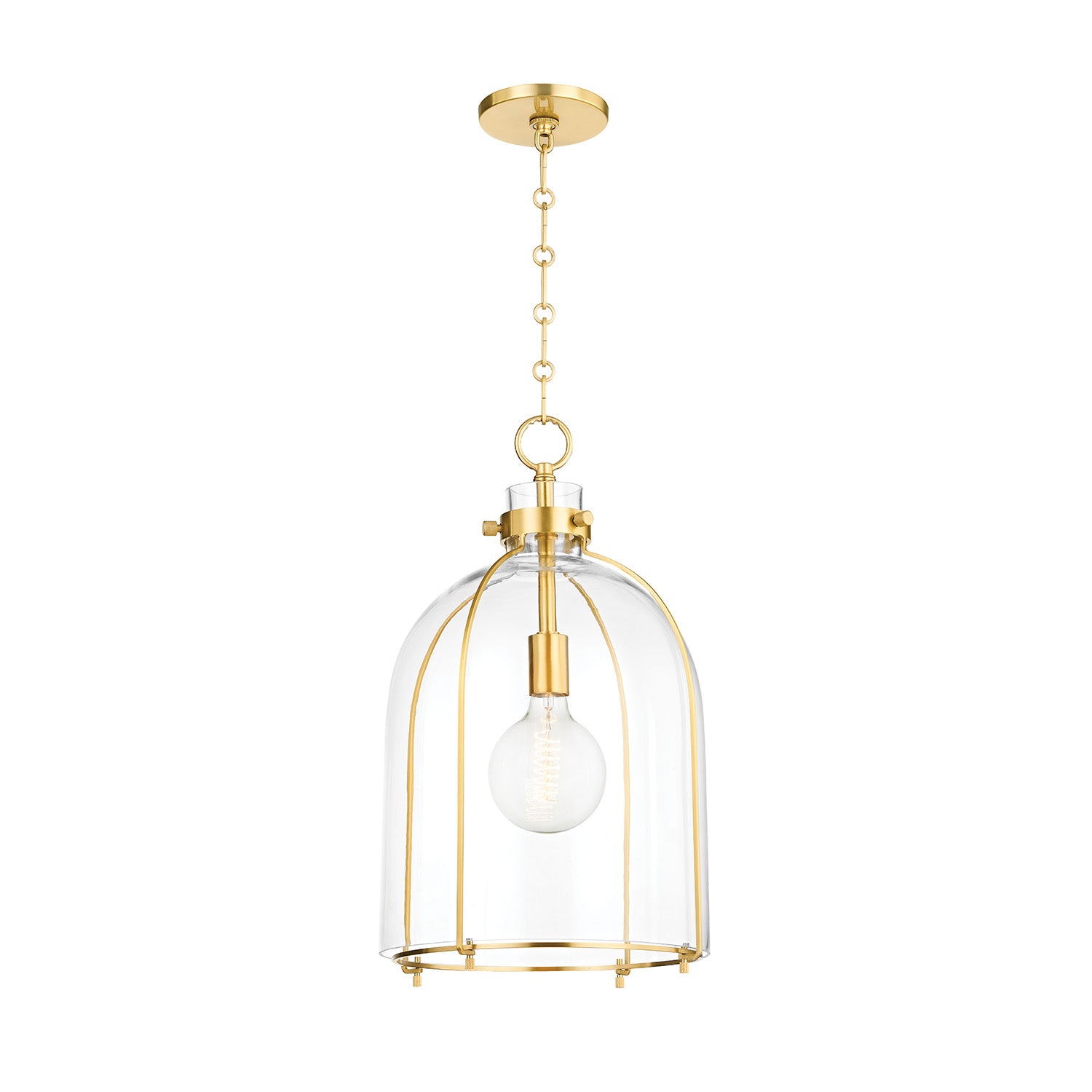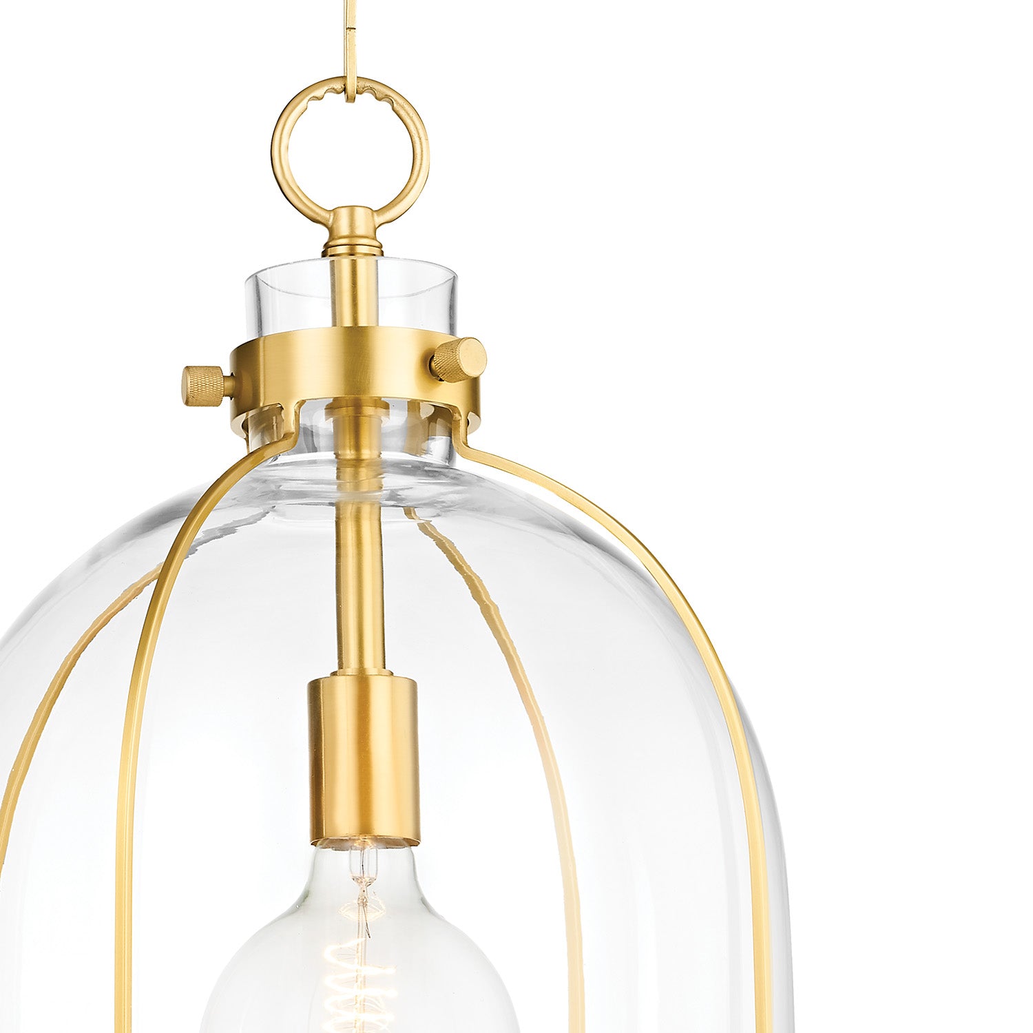 • The Lana Pendant features an aged brass cage framework with a clear glass bell-shaped shade