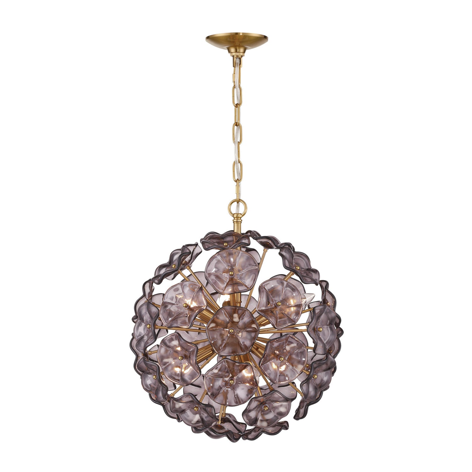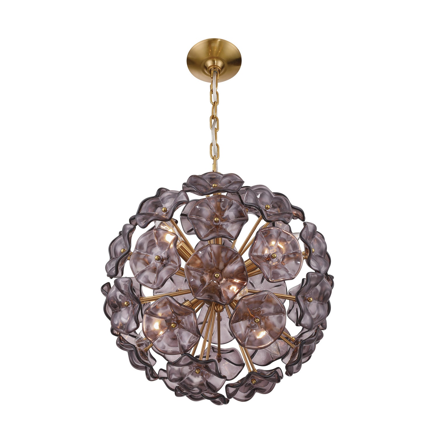 The Layla Glass Pendant brings mid-century modern lighting to striking new heights with its breathtaking silhouette. From its central aged brass hub, slender arms radiate outward like rays of light, each culminating in a hand-blown smoke glass petal. This 6-light pendant captivates both day and night—standing as a sculptural centerpiece when unlit and casting a soft, intimate glow through its smoky glass petals when illuminated. The Aged Brass finish provides a warm counterpoint to the sophisticated smoke glass, balancing vintage charm with contemporary elegance. At 18.25" in diameter, the Layla makes a dramatic statement in dining areas, foyers, or living rooms, becoming not just a source of illumination but a conversation-starting work of art.
