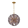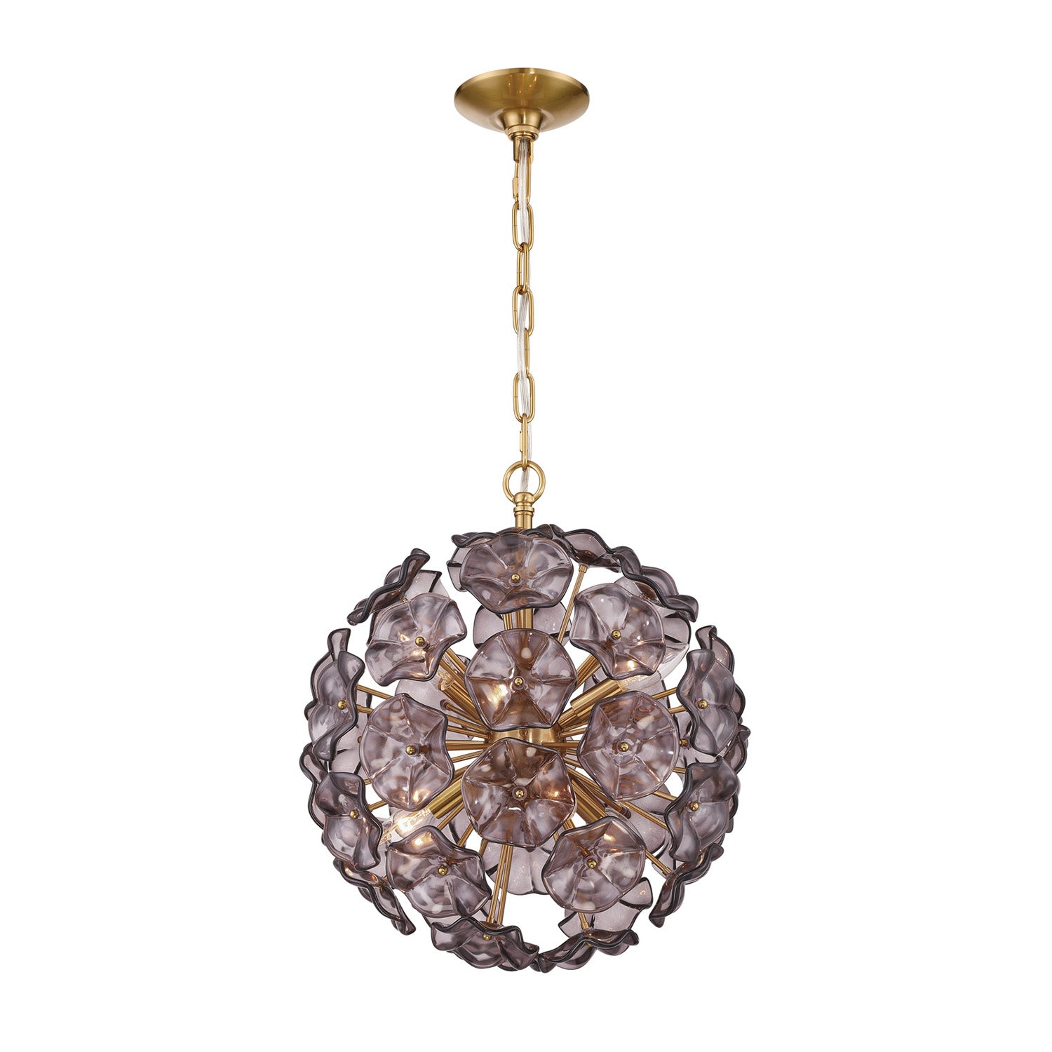 • Features a stunning Sputnik-inspired round design with aged brass arms radiating from a central hub, each ending in a hand-blown smoke glass petal