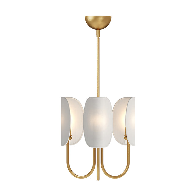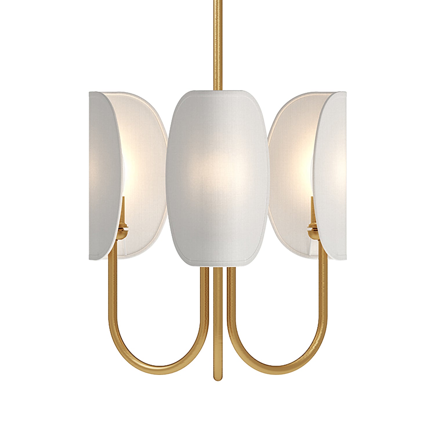 The Nico 3 Light Chandelier features a sculptural design with curved white fabric shades in a warm Antique Brass frame. This elegant ceiling light showcases three petal-like elements arranged around a central column, creating a contemporary silhouette with architectural appeal. The curved fabric shades diffuse light beautifully, creating a warm, ambient glow in your space. Measuring 15" in diameter, the Nico makes a refined statement over dining tables, kitchen islands, or in entryways. The combination of soft fabric shades and sleek brass hardware brings a touch of sophistication to any room, while the unique shade design adds visual interest and modern character.