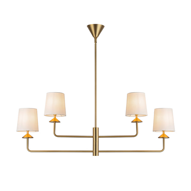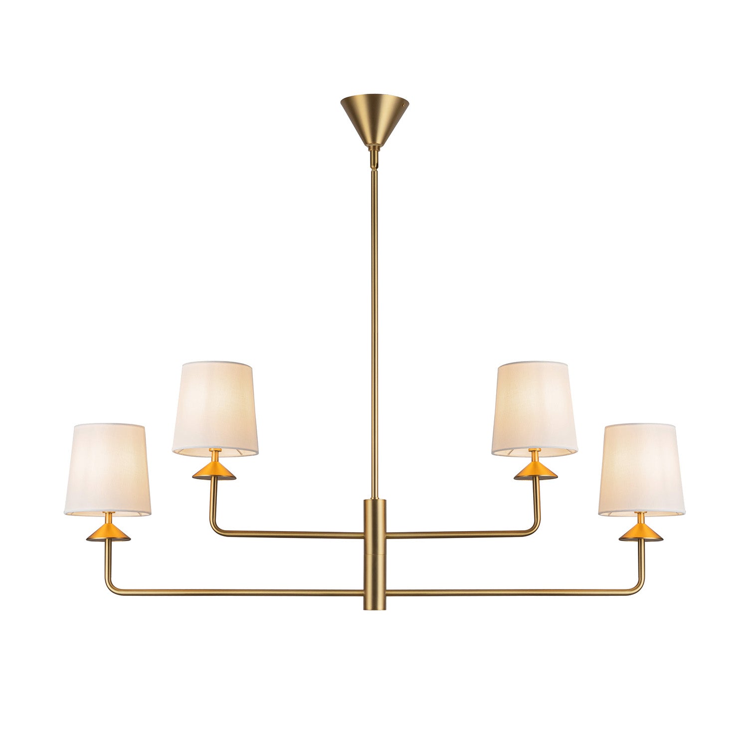 The Sabina 4 Light Chandelier brings modern angular style to any space with its distinctive linear design and warm brushed brass finish. This striking fixture features four white linen shades positioned along sleek rotating arms that create beautiful ambient lighting while adding contemporary visual interest to dining rooms, living areas, and entryways. The adjustable design provides graceful presence and architectural appeal, while the linen shades deliver soft, even illumination. At 45" in width with adjustable hanging height and depth, this chandelier makes a statement that combines modern sophistication with creative flair for spaces that demand both style and personality.