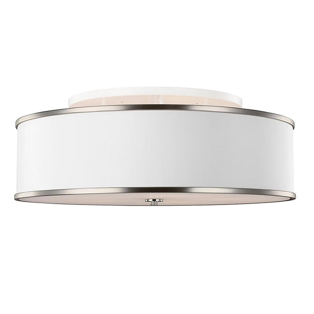 • Modern flush mount ceiling light with a classic linen drum shade and a low-profile design