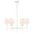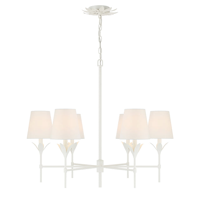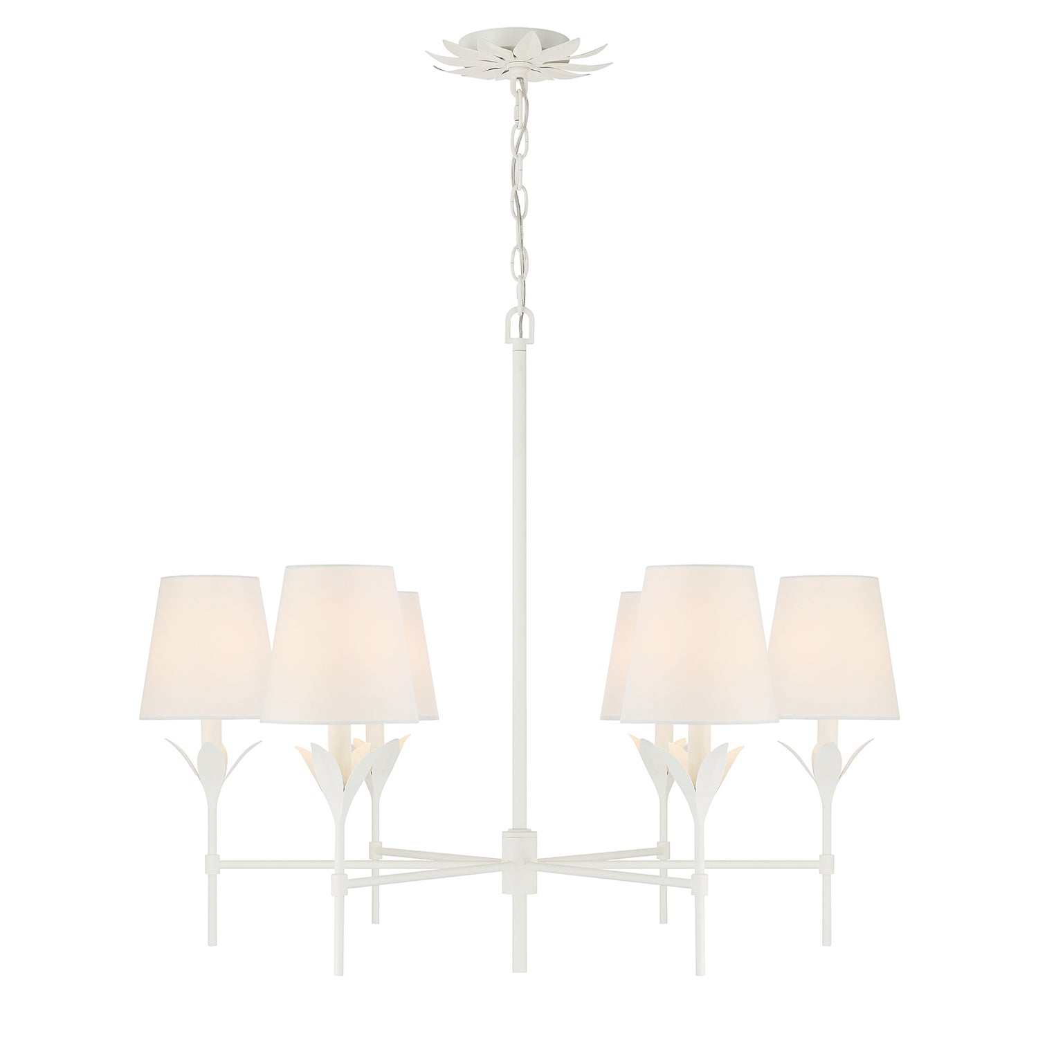 The Alice 6 Light Chandelier brings refined elegance to your space with sculptural leaf details and tailored white fabric shades. Finished in fresh matte white, this fixture exudes timeless charm with a touch of vintage inspiration. Six crisp fabric shades diffuse light beautifully, casting a warm, inviting glow. With a balanced 32" diameter, it makes a statement while maintaining graceful proportions, perfect for dining rooms, living areas, or entryways. The included 72" chain and rod allow for adjustable hanging height, ensuring a seamless fit for your space.