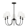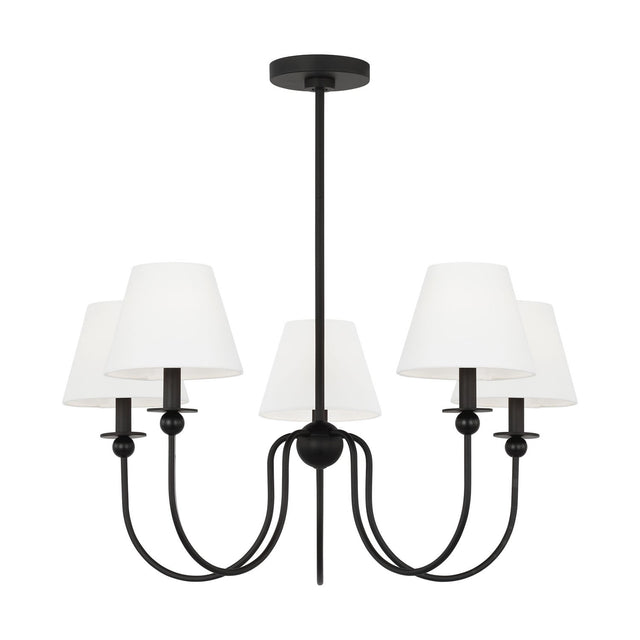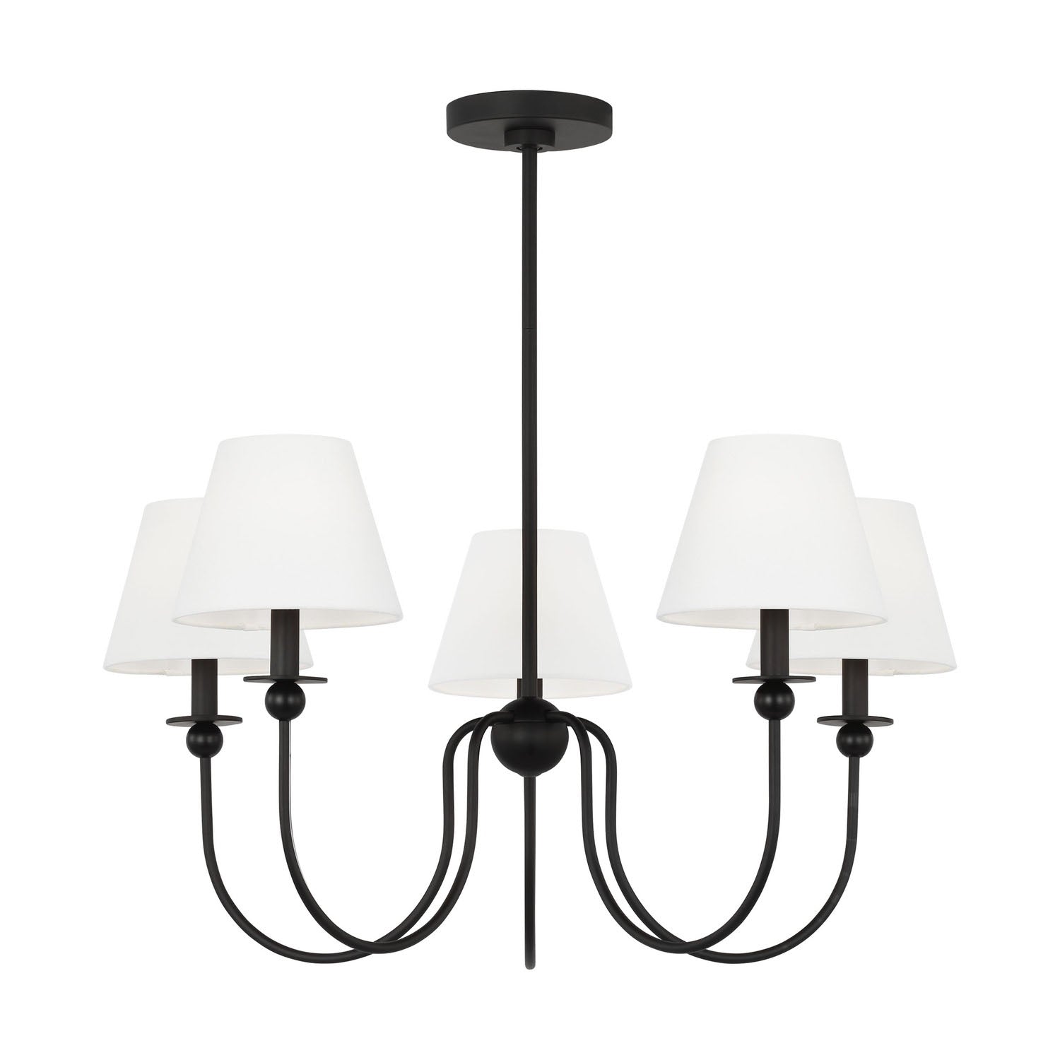 The Anise 5 Light Chandelier brings contemporary sophistication to classic chandelier design, featuring five graceful arms with refined circular elements that create timeless appeal with modern sensibility throughout the space. This sophisticated 30" chandelier combines traditional proportions with clean, updated details that effortlessly complement interior decor styles of all kinds, perfect for dining rooms, entryways, living spaces, foyers, and areas seeking elevated chandelier lighting with distinctive character. The matte black finish creates sophisticated contrast while the white linen shades provide soft, diffused illumination with classic refinement. With its damp-rated construction and flexible hanging height, this thoughtfully designed chandelier enhances any space with sophisticated style and reliable performance.