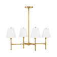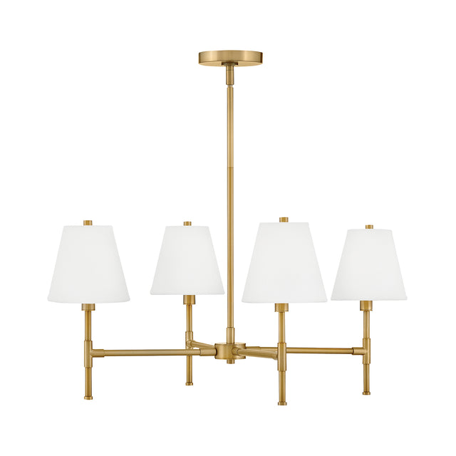 The Declan 4 Light Chandelier makes a refined statement, defined by its crisp lines and timeless, tailored design. Four straight, clean-lined arms support white linen shades, creating a balanced and elegant horizontal profile. This fixture is thoughtfully designed to provide soft, multi-directional illumination, making it an ideal centerpiece for a dining room, bedroom, or entryway. With its ETL dry rating and sloped ceiling compatibility, it offers both functional beauty and versatile appeal. The warm Satin Brass finish enhances the fixture's tailored silhouette, resulting in a look of enduring style and timeless elegance. This striking collection delivers enduring style and a perfect blend of elegance and simplicity.