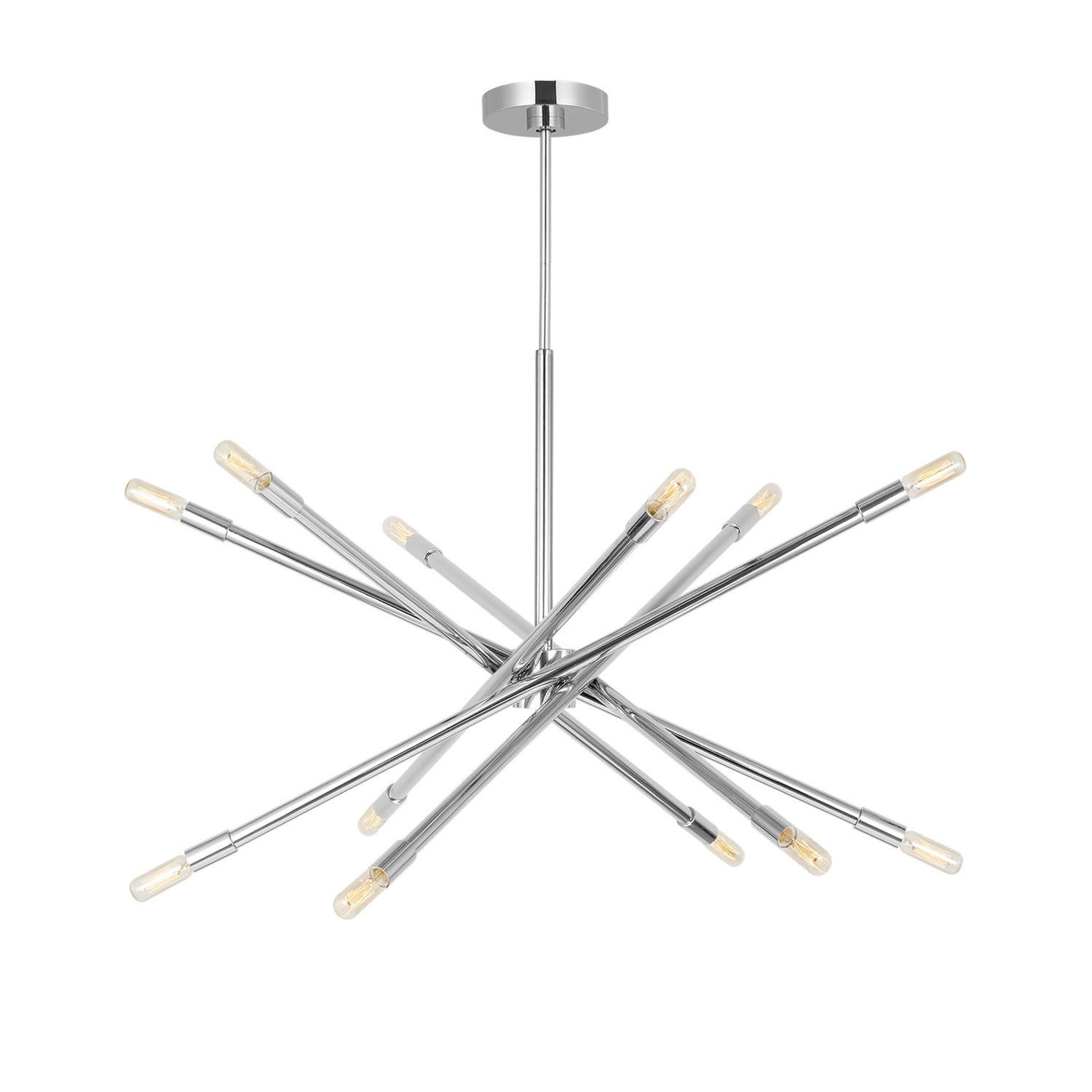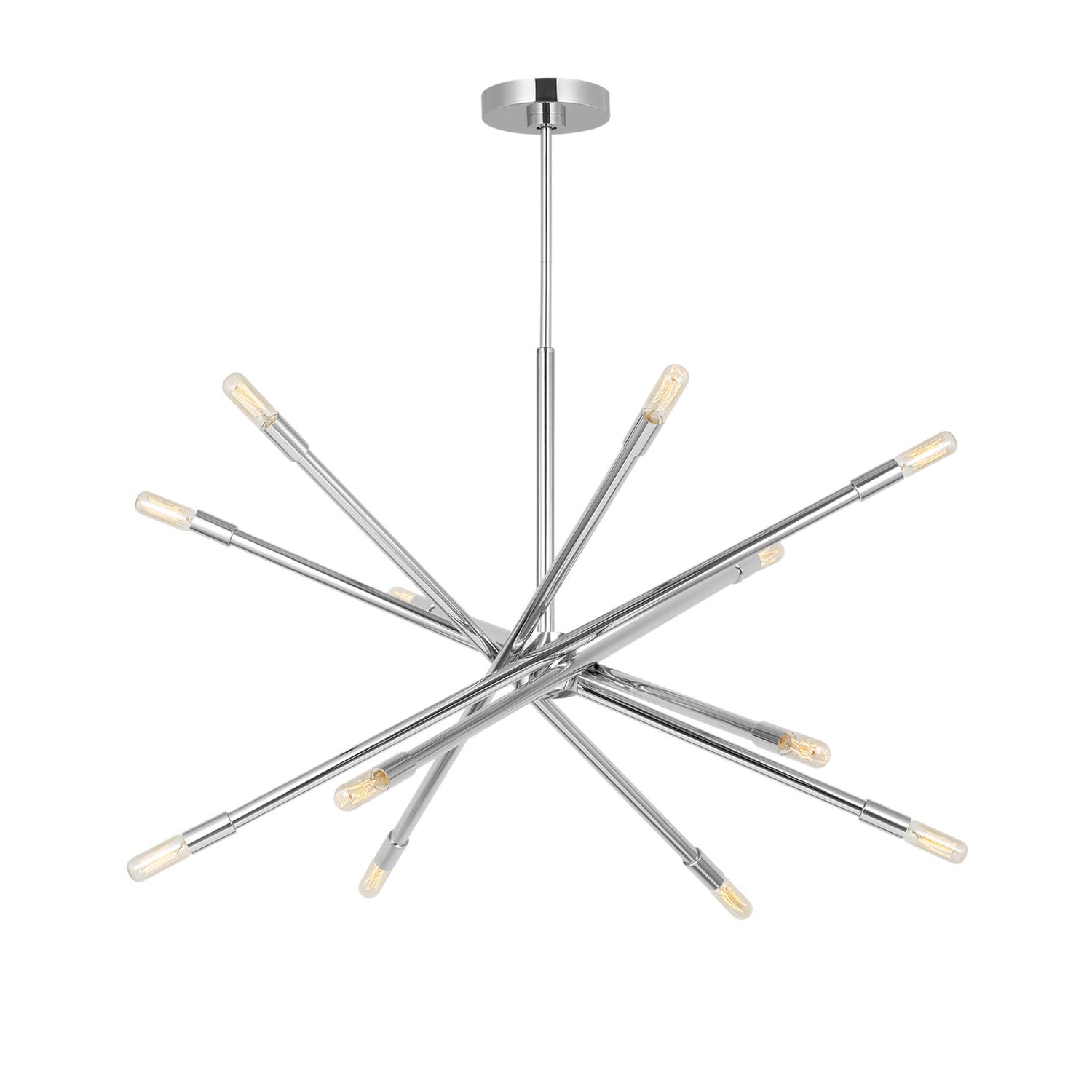 The Ferris Large Chandelier offers a dynamic mid-century design with its contemporary sputnik silhouette and structured form. Slender metal arms extend outward from a central hub, each capped with streamlined bulbs that emit a warm, inviting glow. This captivating chandelier, with its generous proportions, is damp-rated for versatility, making it a perfect centerpiece for a grand dining room, living space, or entryway. With its unique sphere of light, it adds a touch of timeless elegance and modern style to any interior. The brilliant Polished Nickel finish brings a cool metallic sheen that beautifully complements the fixture's refined silhouette. This striking chandelier is a perfect centerpiece that brings both elegant lighting and a modern, timeless style to your home.