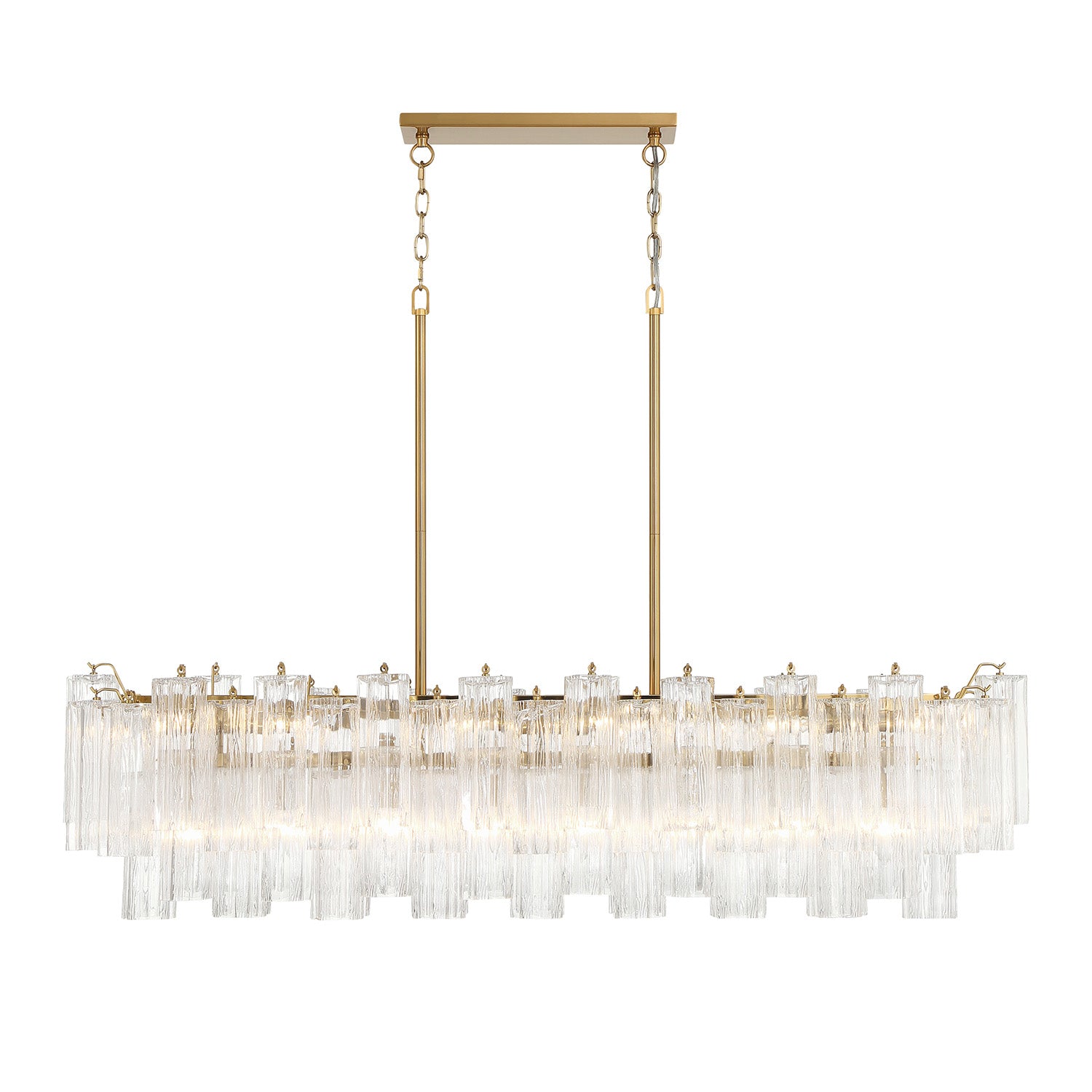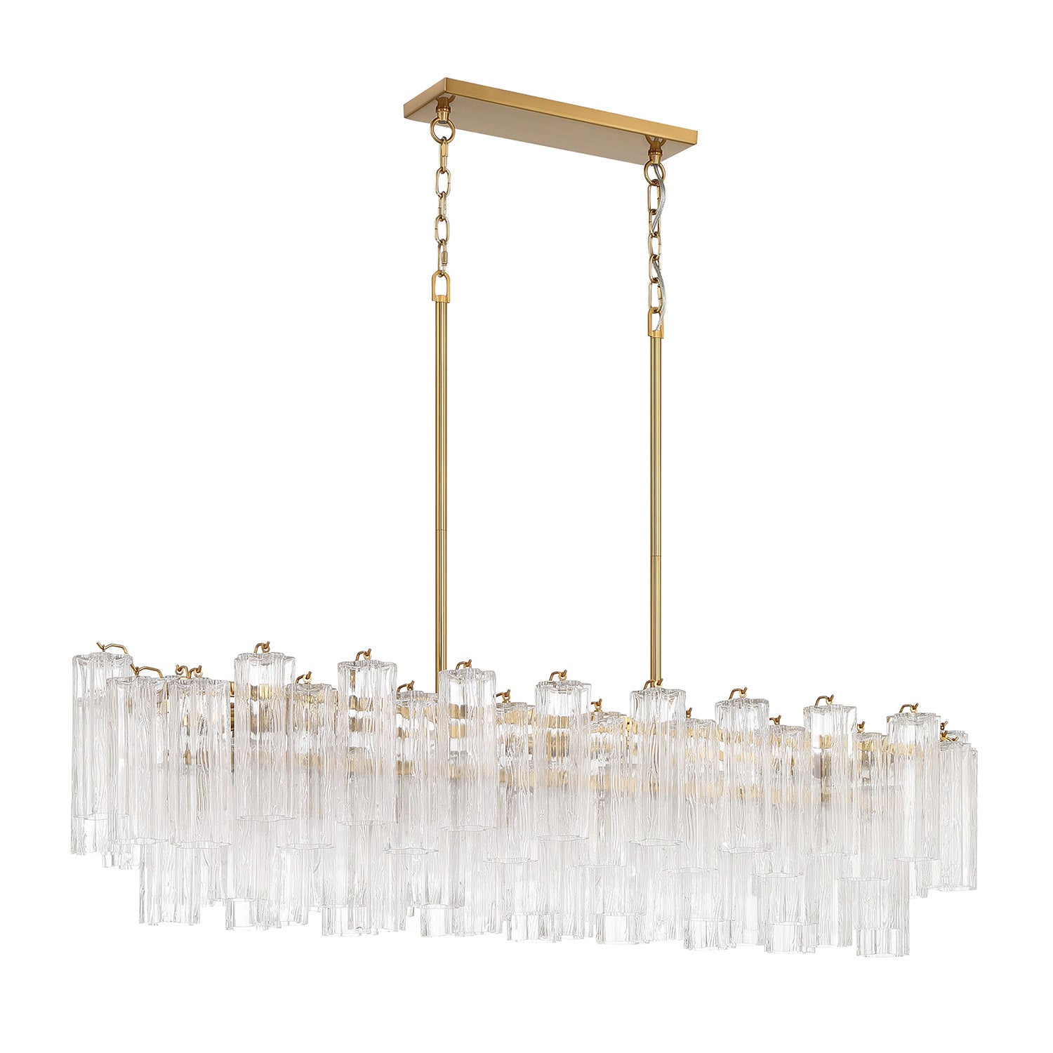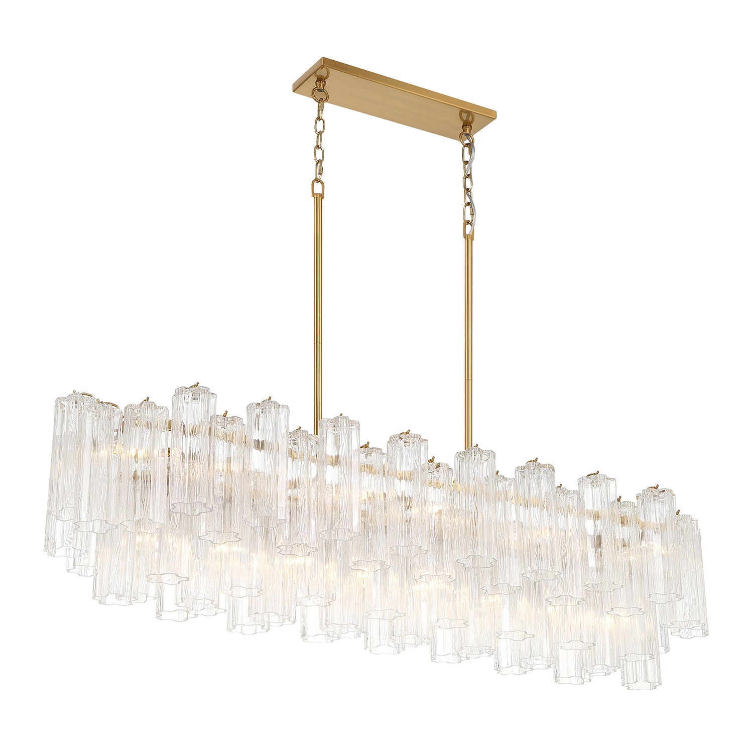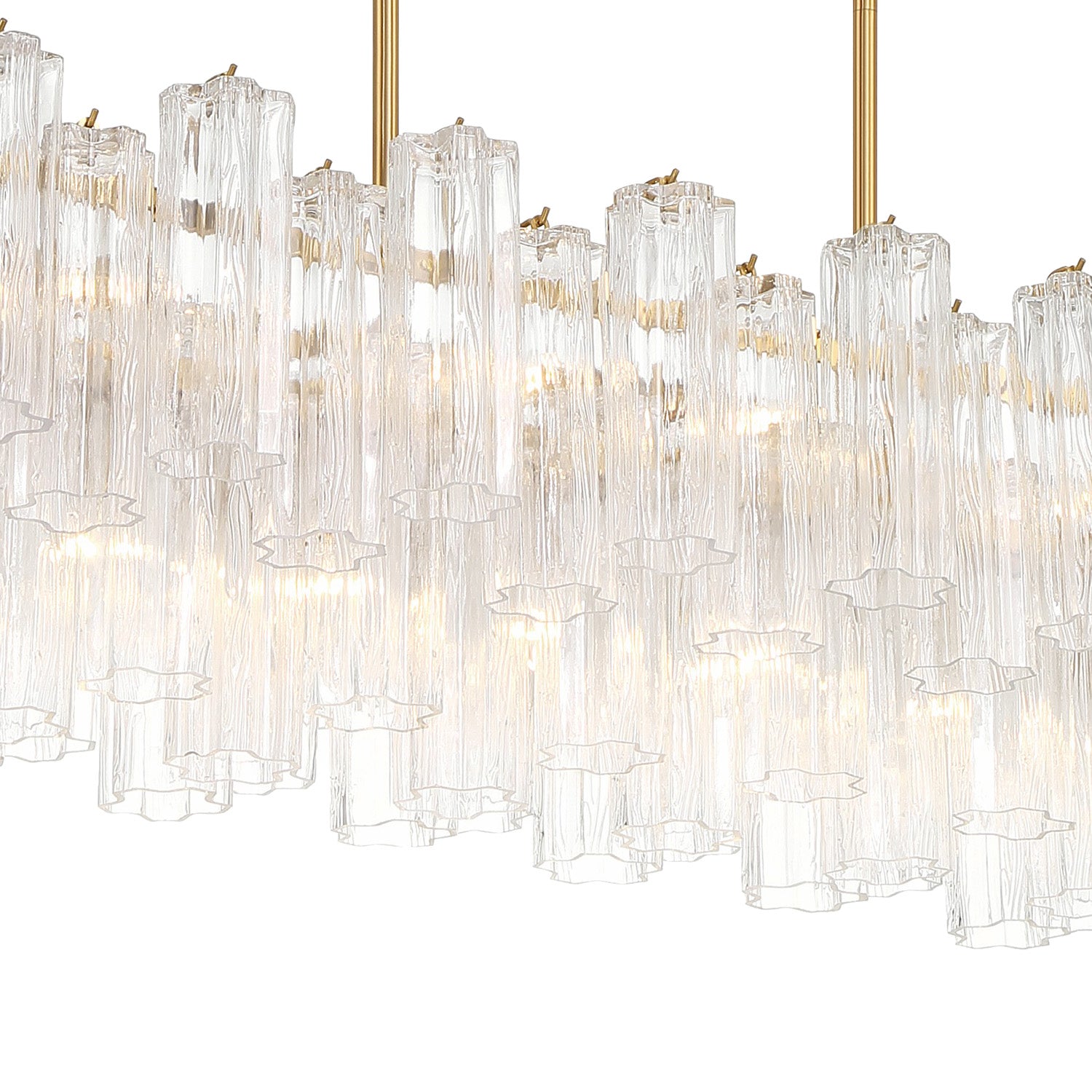 The Grace Linear Chandelier makes a stunning statement with its impressive combination of rich brass finish and clear, textured Tronchi glass. This spectacular fixture features cascading textured glass tubes arranged in a dramatic linear formation, creating beautiful light diffusion while commanding attention in dining rooms, above large kitchen islands, and in living spaces. The warm brass framework provides structural elegance, while the crisp, clear glass delivers soft, evenly distributed illumination that bathes spaces in luxurious ambiance. At an impressive 52" in length with 14 light sources, this grand chandelier delivers both substantial presence and abundant illumination. The multi-panel glass design creates captivating shadows and light patterns throughout the room, making it the perfect centerpiece for sophisticated interiors.