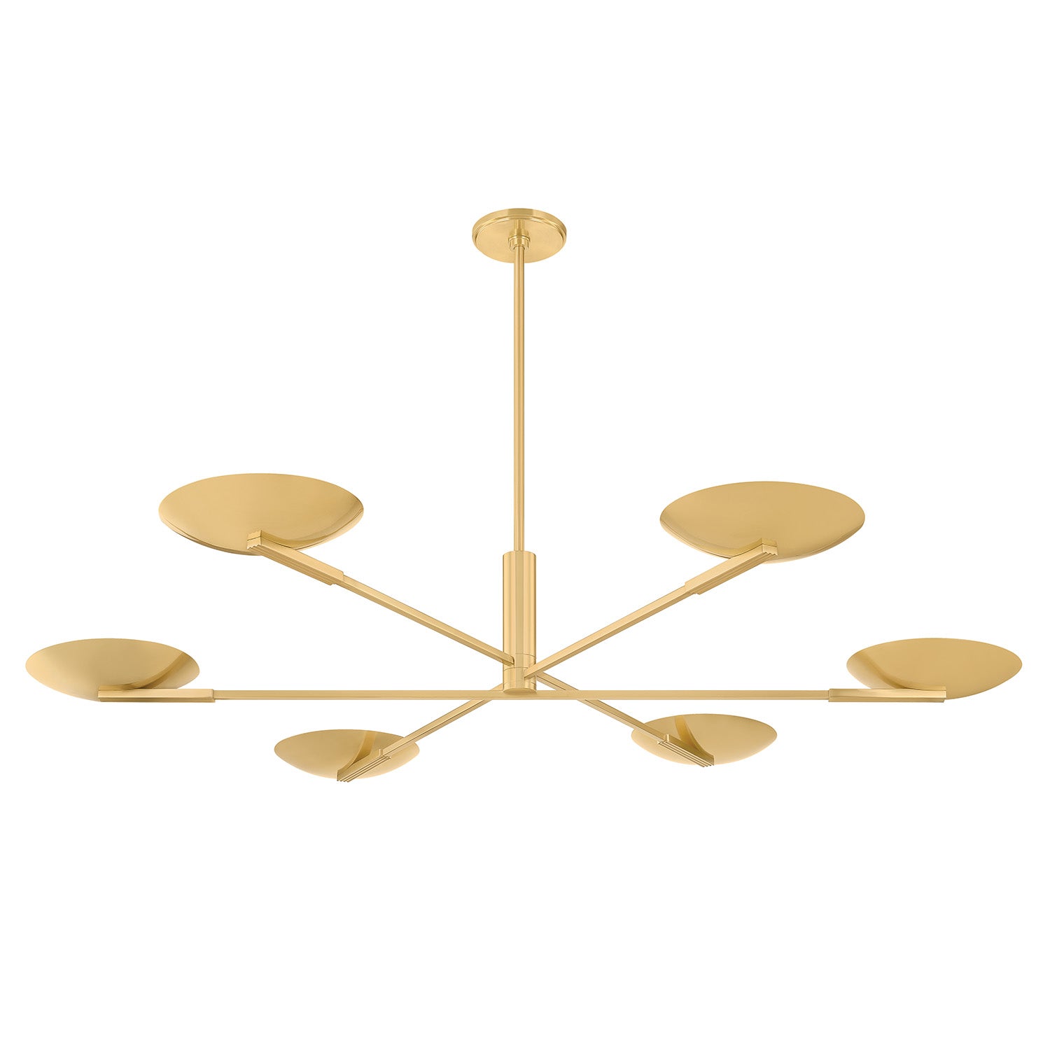 The Phoebe 6 Light LED Chandelier is a modern statement light that delivers a striking, minimalist profile inspired by mid-century design. The fixture features six sleek, horizontal arms that radiate outwards, each tipped with an integrated LED and an acrylic diffuser, creating a broad, soft wash of ambient light. This large LED chandelier is thoughtfully designed to provide expansive illumination while maintaining a low profile, making it an ideal centerpiece for a living room or dining area. With its UL damp rating and modern LED source, it offers exceptional style and efficiency. The rich Aged Brass finish enhances the clean, architectural silhouette, delivering enduring style and modern efficiency.