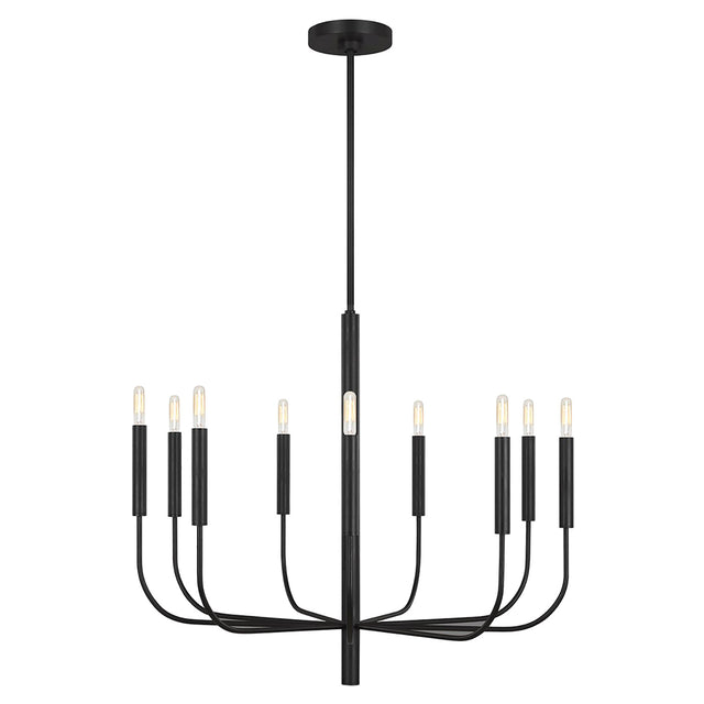 The Thayer 9 Light Chandelier features a single tier design that supplies ample lighting for your daily needs while adding a layer of style to your home's decor. This striking 30" chandelier showcases graceful, seamless curvature and elongated tubular arms that lend fluidity and modern appeal to the classic minimalist silhouette, perfect for large dining rooms, living spaces, and areas seeking substantial lighting with contemporary sophistication. The antique iron finish brings rich character while the nine-light configuration provides abundant illumination throughout expansive spaces. Damp-rated for added versatility, this chandelier delivers both style and functionality for various environments. With its dimmable capabilities and sloped ceiling compatibility, this chandelier transforms any space with distinctive style and performance.