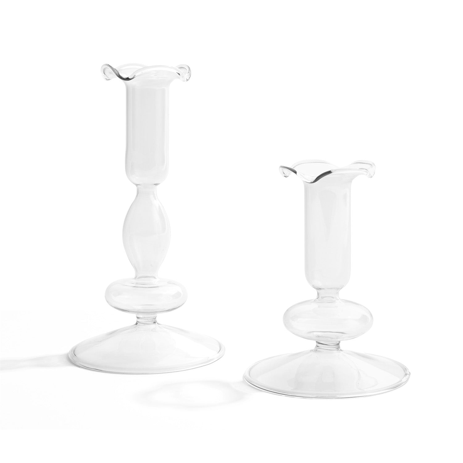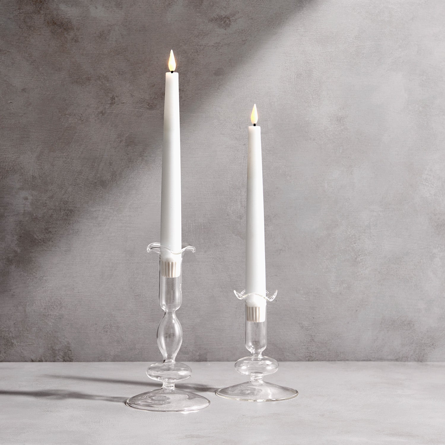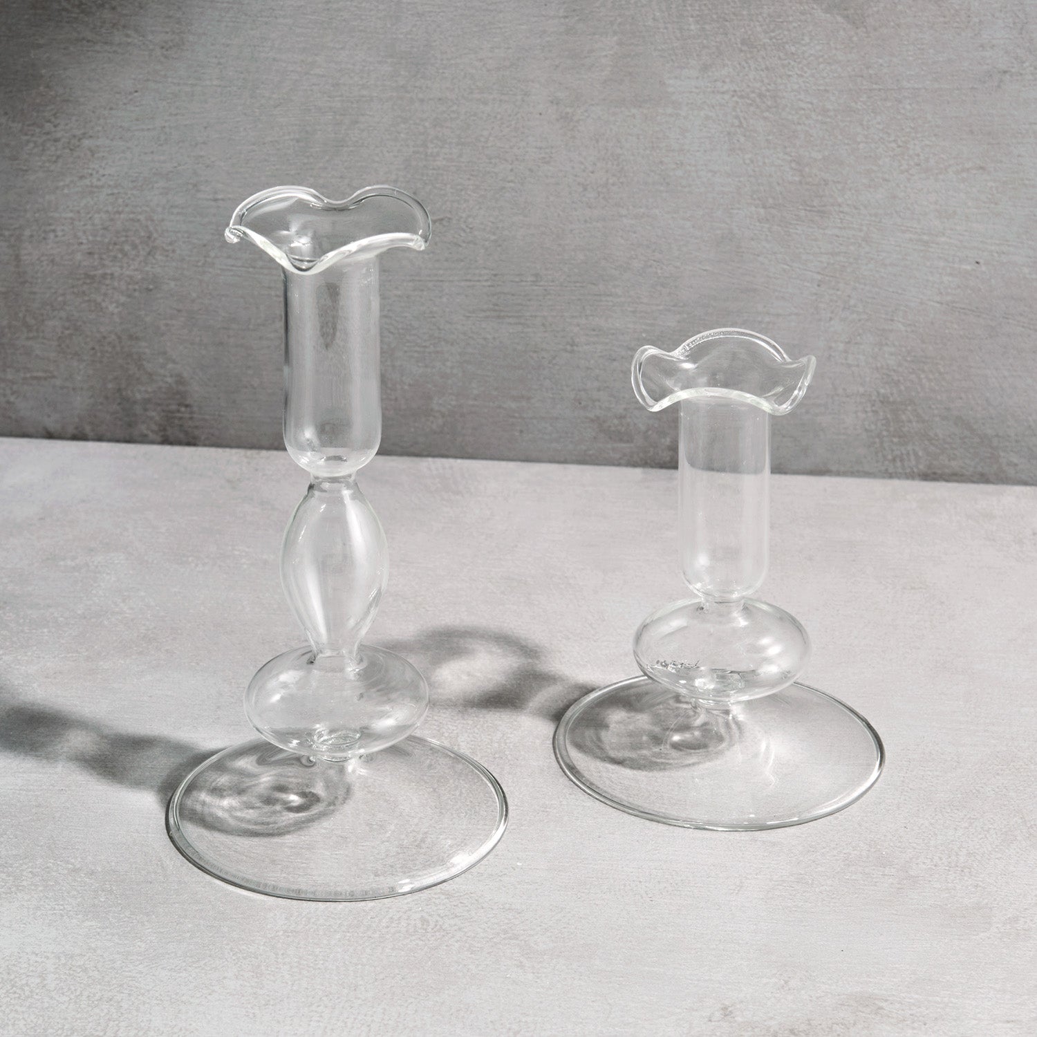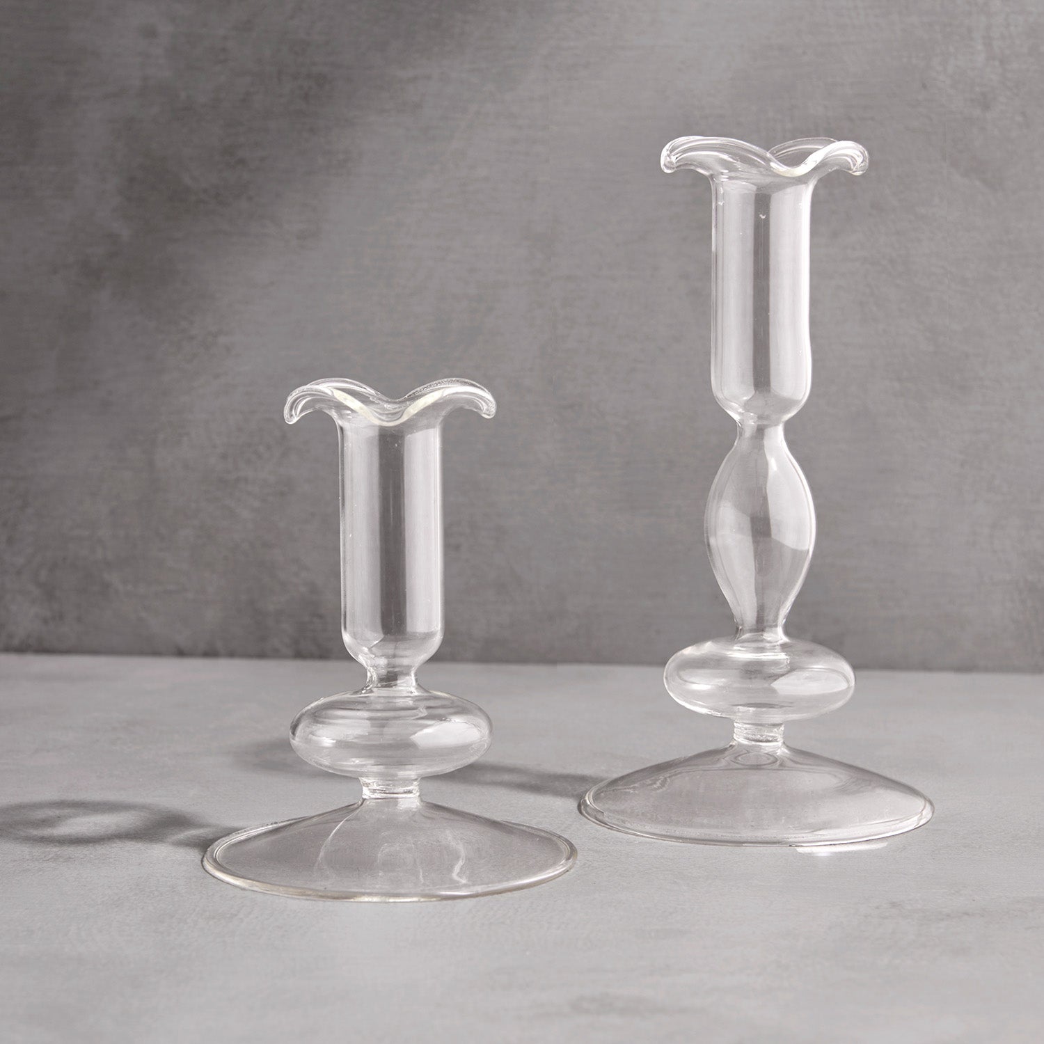Elevate your interior decor with our Lily Taper Candle Holders, featuring two heights — 4.5 inches and 6.5 inches — adding a touch of sophistication to any setting. Handcrafted from resilient borosilicate blown glass, these candle holders feature a delicate appearance. Inspired by the elegance of lilies, their design captures the essence of blooming petals while adding a timeless touch to your home. Make a statement at your next gathering with these unique candle holders, perfect for weddings, parties, or intimate dinners.
