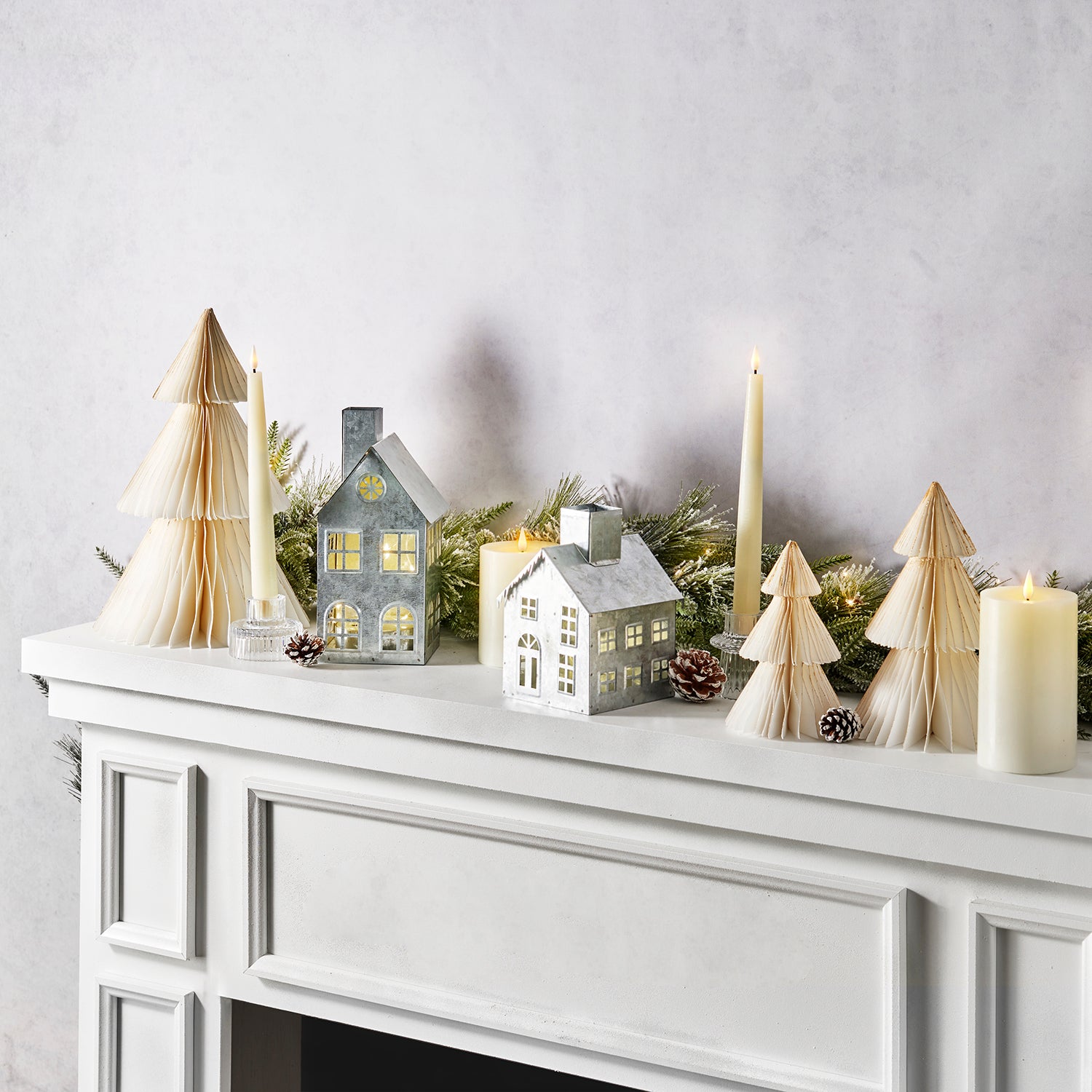 Create a festive winter mood in your home with this set of large pleated paper Christmas trees. Crafted from sturdy ivory-colored paper with gold glitter edging, these paper trees go from flat to 3D in seconds thanks to their honeycomb construction and hidden magnetic closure. Stand them on a mantel or tabletop, place them in a window sill, or arrange them with our flameless candles for a memorable holiday tablescape. Easy to assemble and quick to store away, these cheery Christmas trees will bring a smile to your face year after year.
