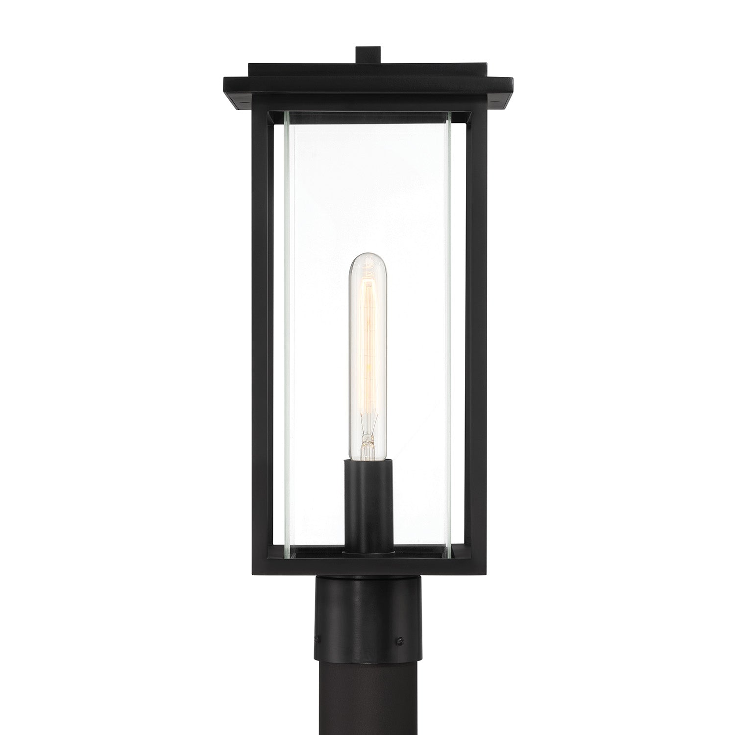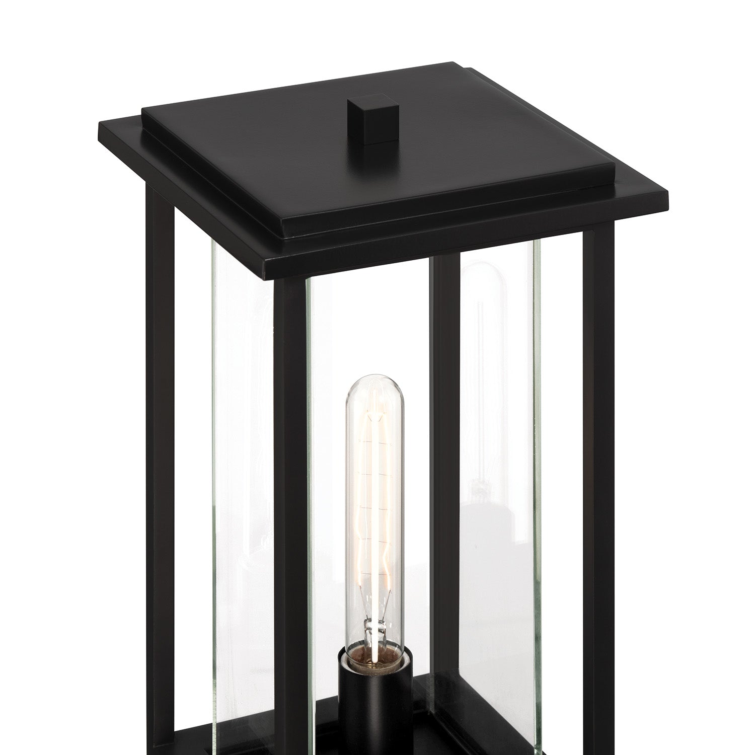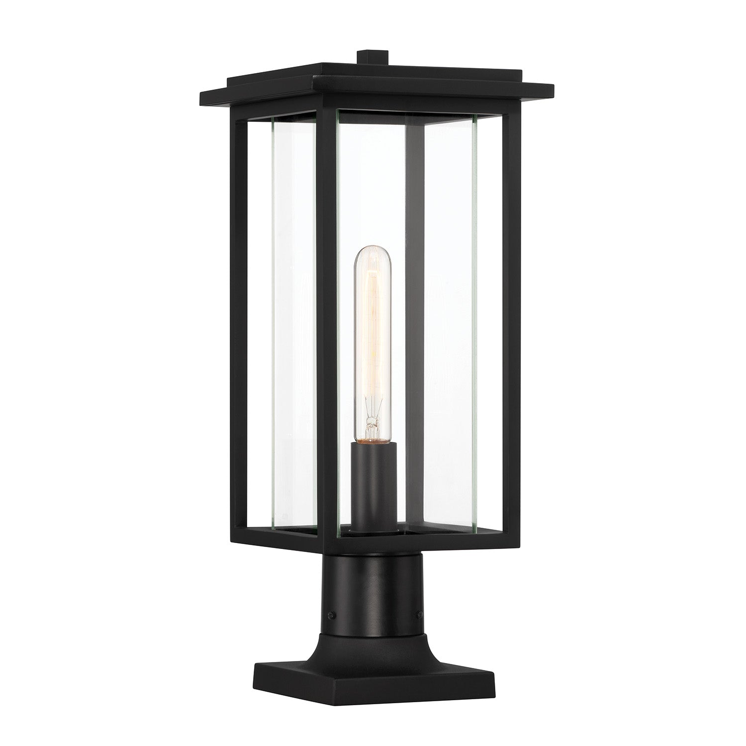 Inspired by Mission-style lighting, the Colin Outdoor Post Light is a timeless design with a modern sensibility. A rectangular frame surrounds clear, 3mm mitered glass side panels, which gives a clean transitional look, and is topped with a weatherproof canopy that blends harmoniously with the frame. This sturdy, 18.5" post light is designed to withstand the elements complete with a matte black, powder-coated finish. This outdoor light will add a charming appeal to any front yard, walkway, or outdoor living space. This versatile fixture can be mounted atop a round metal post; alternately, it can be mounted to other surfaces with a pier mount. Both mounting options are sold separately and come in matte black. This outdoor post light is part of the larger Colin Outdoor Lighting collection, including wall and hanging lights to complete your exterior lighting project.