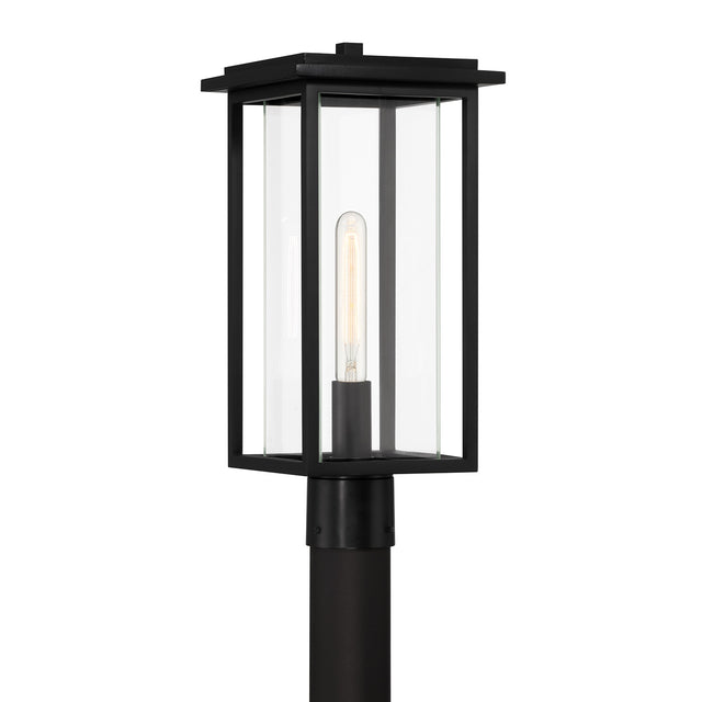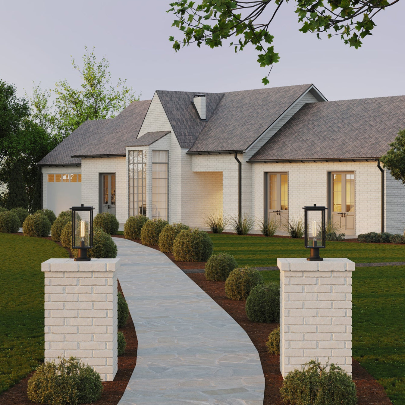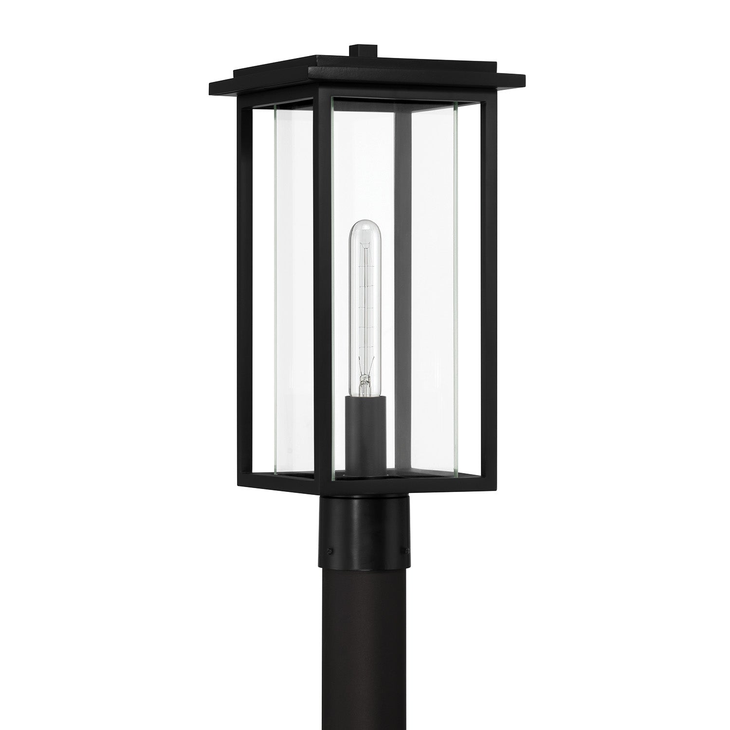 Inspired by Mission-style lighting, the Colin Outdoor Post Light is a timeless design with a modern sensibility. A rectangular frame surrounds clear, 3mm mitered glass side panels, which gives a clean transitional look, and is topped with a weatherproof canopy that blends harmoniously with the frame. This sturdy, 18.5" post light is designed to withstand the elements complete with a matte black, powder-coated finish. This outdoor light will add a charming appeal to any front yard, walkway, or outdoor living space. This versatile fixture can be mounted atop a round metal post; alternately, it can be mounted to other surfaces with a pier mount. Both mounting options are sold separately and come in matte black. This outdoor post light is part of the larger Colin Outdoor Lighting collection, including wall and hanging lights to complete your exterior lighting project.
