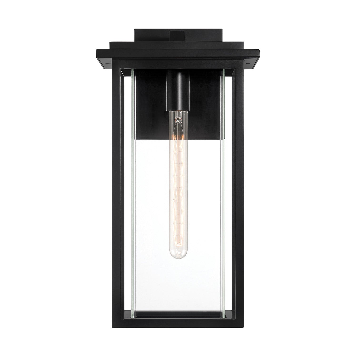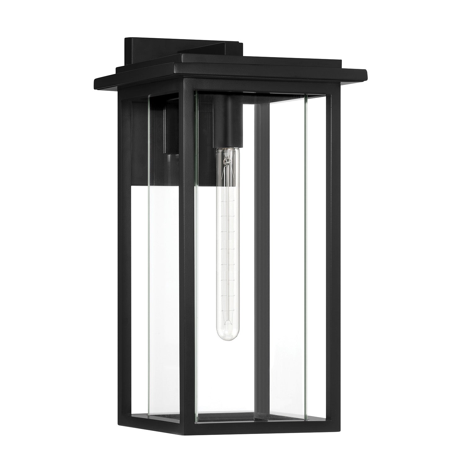 Inspired by Mission-style lighting, the Colin Outdoor Wall Light is a timeless design with a modern sensibility. A rectangular frame surrounds clear, 3mm mitered glass side panels, which gives a clean transitional look, and is topped with a weatherproof canopy that blends harmoniously with the frame and backplate. This sturdy, 19" outdoor light is designed to withstand the elements complete with a matte black, powder-coated finish, and is wet-rated. Perfect for illuminating an entryway, lighting a patio, or in pairs flanking garage doors, this small outdoor wall light is part of the larger Colin Outdoor Lighting collection, including post and hanging lights to complete your exterior lighting project.