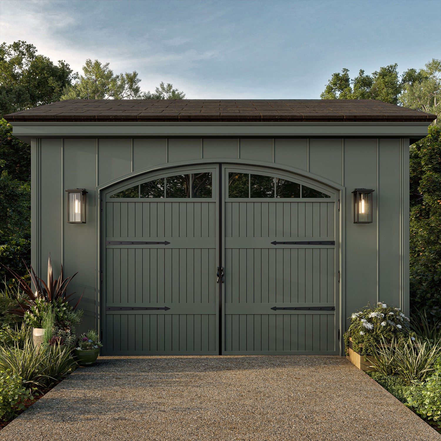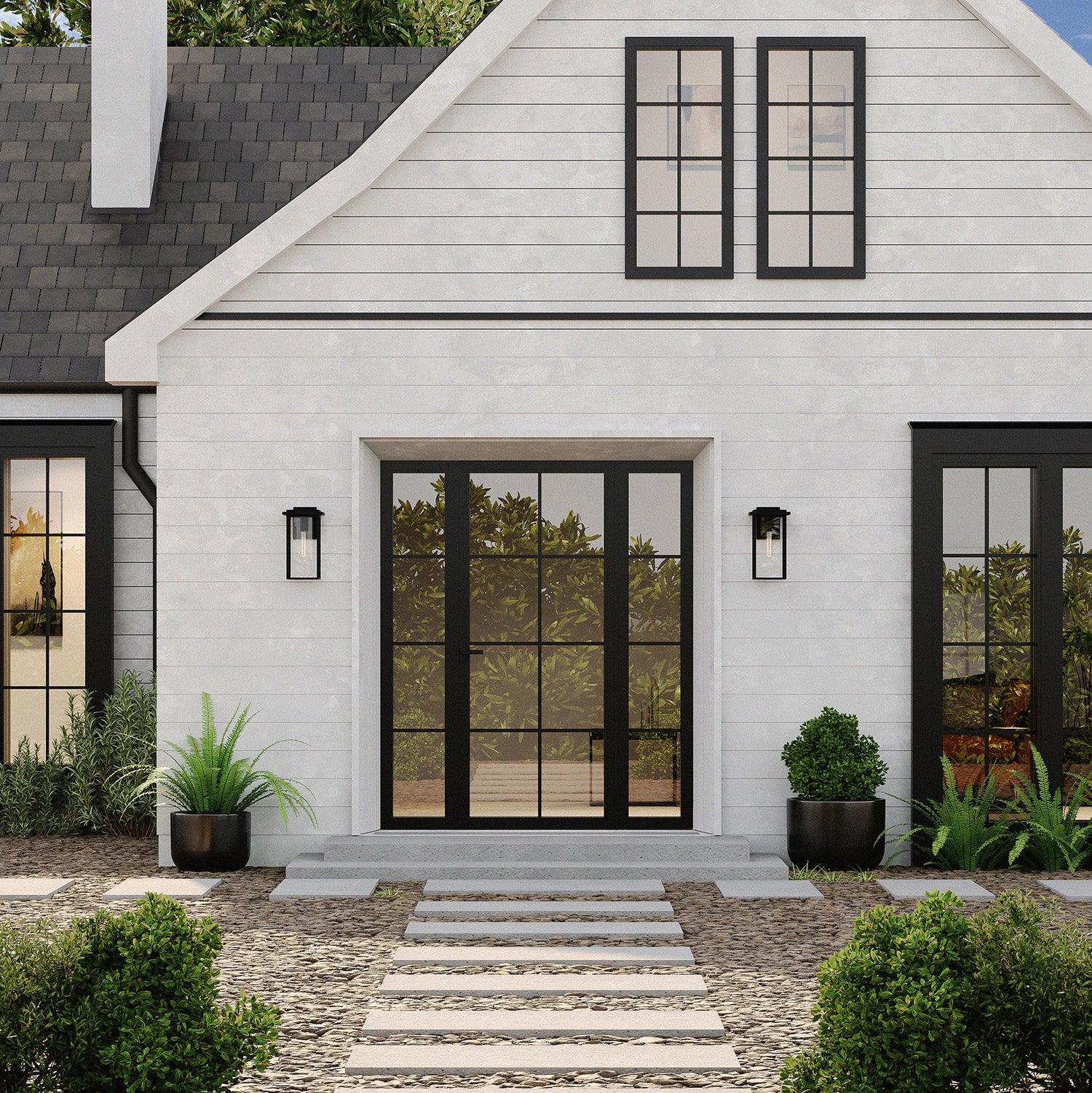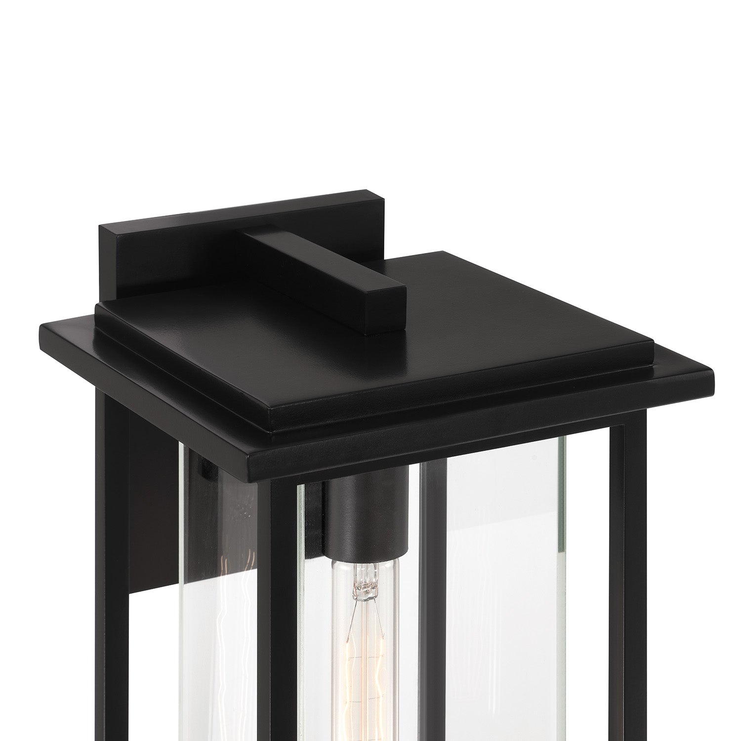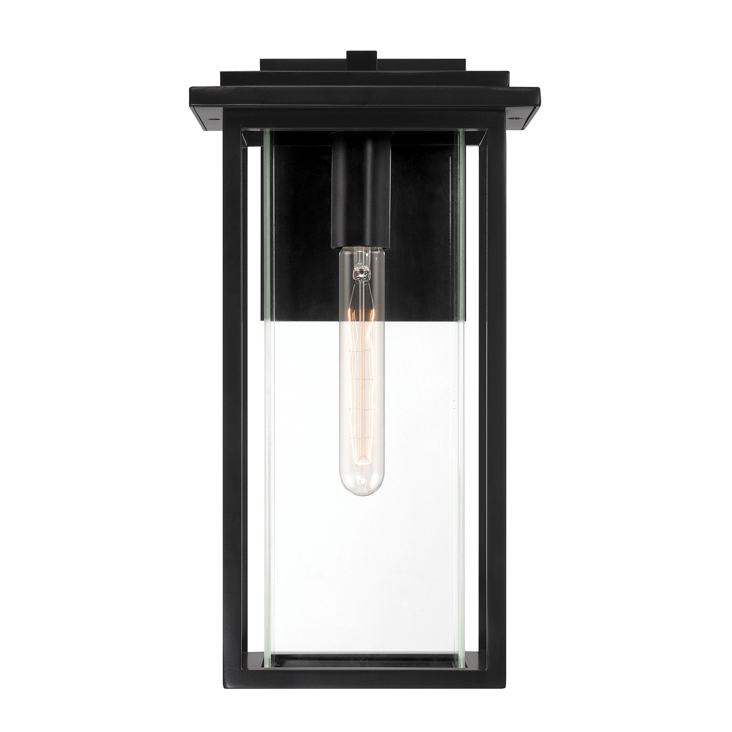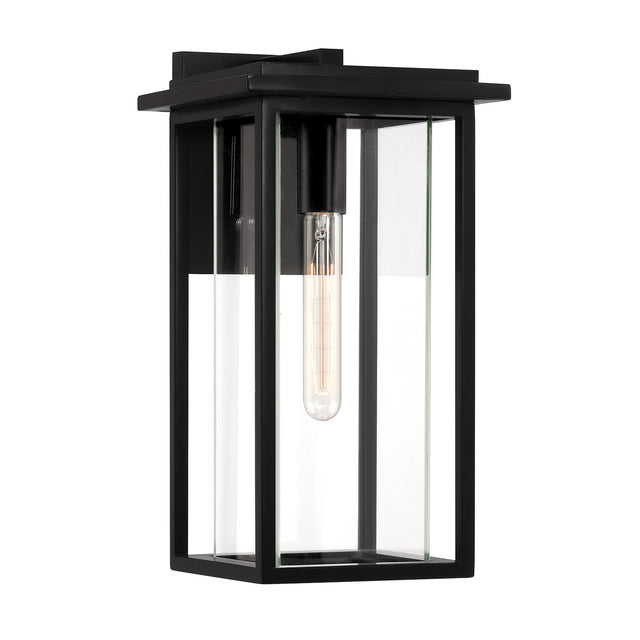 Inspired by Mission-style lighting, the Colin Outdoor Wall Light is a timeless design with a modern sensibility. A rectangular frame surrounds clear, 3mm mitered glass side panels, which gives a clean transitional look, and is topped with a weatherproof canopy that blends harmoniously with the frame and backplate. This sturdy, 16" outdoor light is designed to withstand the elements complete with a matte black, powder-coated finish, and is wet-rated. Perfect for illuminating an entryway, lighting a patio, or in pairs flanking garage doors, this small outdoor wall light is part of the larger Colin Outdoor Lighting collection, including post and hanging lights to complete your exterior lighting project.