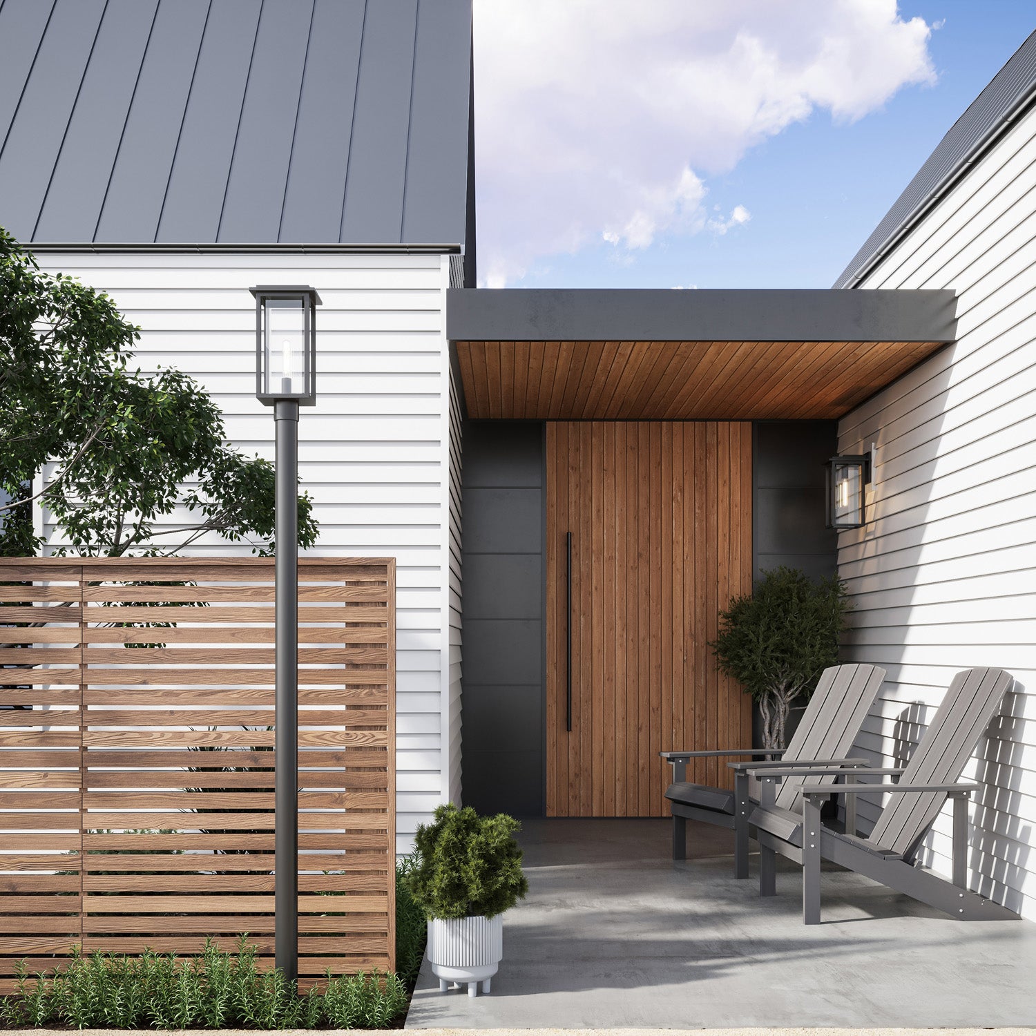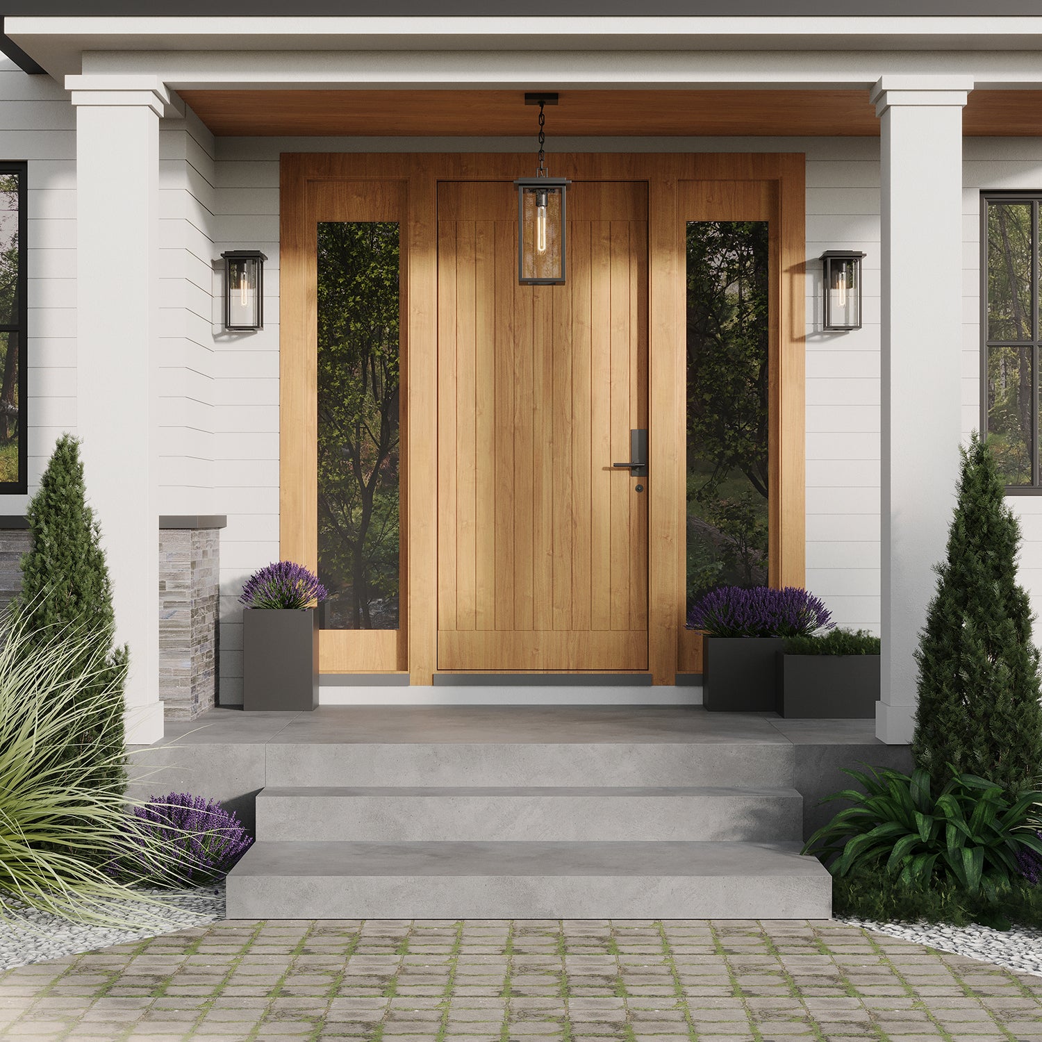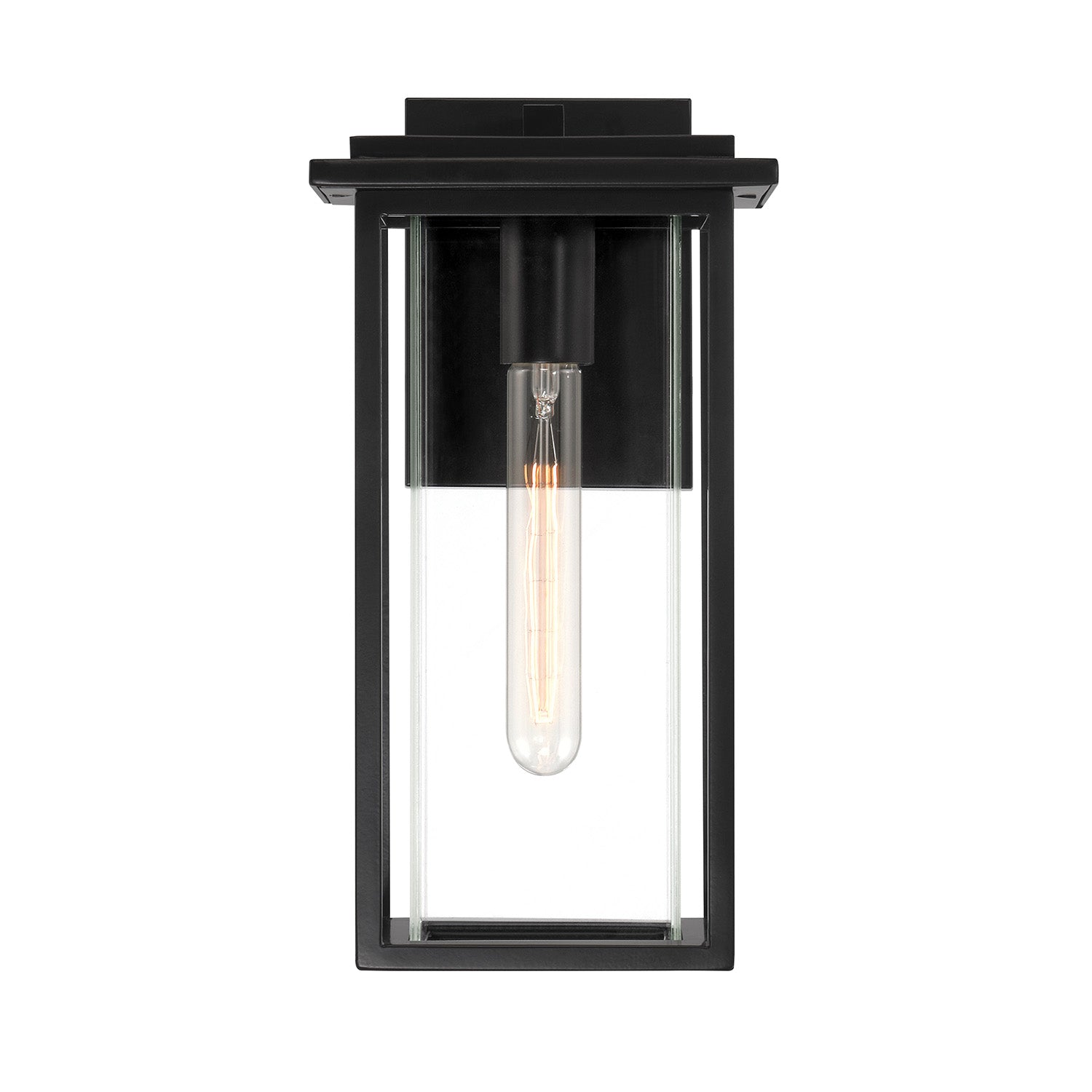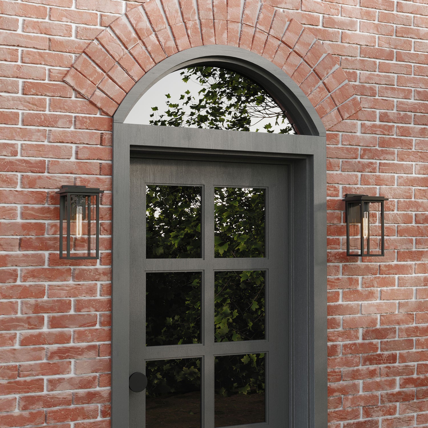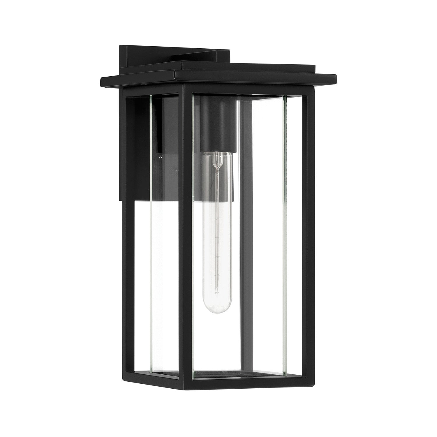Inspired by Mission-style lighting, the Colin Outdoor Wall Light is a timeless design with a modern sensibility. A rectangular frame surrounds clear, 3mm mitered glass side panels, which gives a clean transitional look, and is topped with a weatherproof canopy that blends harmoniously with the frame and backplate. This sturdy, 13.5" outdoor light is designed to withstand the elements complete with a matte black, powder-coated finish, and is wet-rated. Perfect for illuminating an entryway, lighting a patio, or in pairs flanking garage doors, this small outdoor wall light is part of the larger Colin Outdoor Lighting collection, including post and hanging lights to complete your exterior lighting project.
