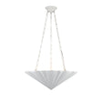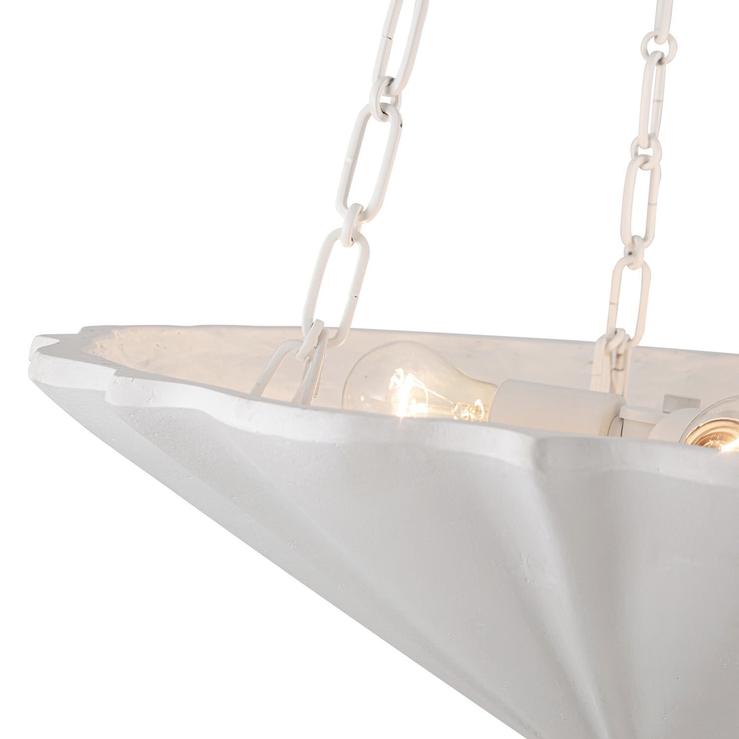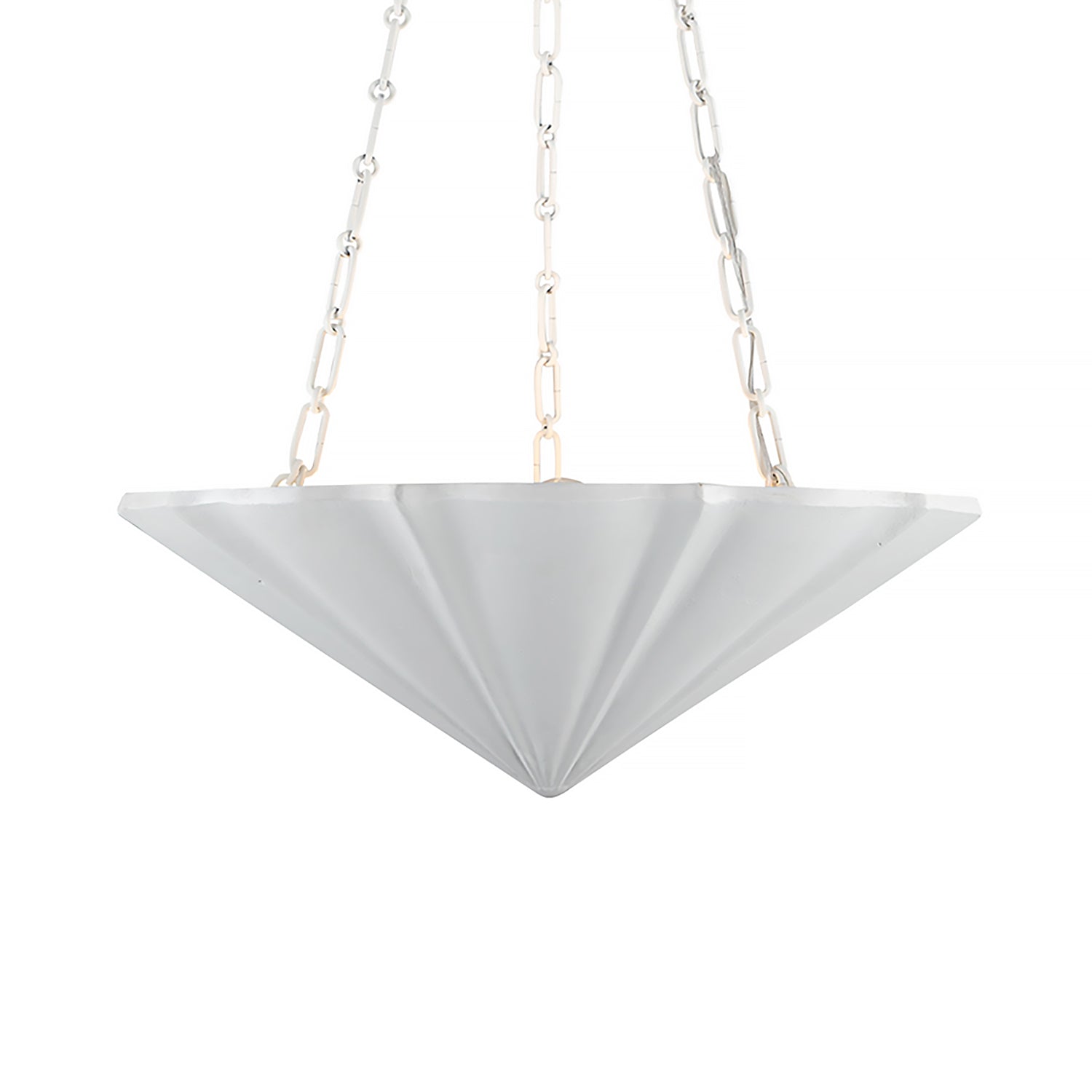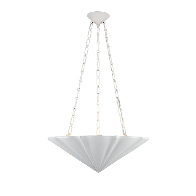 The Cora Pendant showcases a timeless design inspired by the classic cast plaster lighting of the 1930s and 40s. This elegant ceiling light features a sculptural form with delicate, wave-like carvings that create an organic, textural pattern. The inverted, pleated bowl shape with offers a sophisticated silhouette that bounces light upward beautifully while making a subtle architectural statement. Suspended by three chain links from a matching canopy, Cora's textured white plaster finish brings a touch of refined elegance to any interior. Measuring 23" in diameter, this pendant makes a striking focal point in entryways, dining rooms, or living spaces, adding artisanal character and a soft, ambient glow.