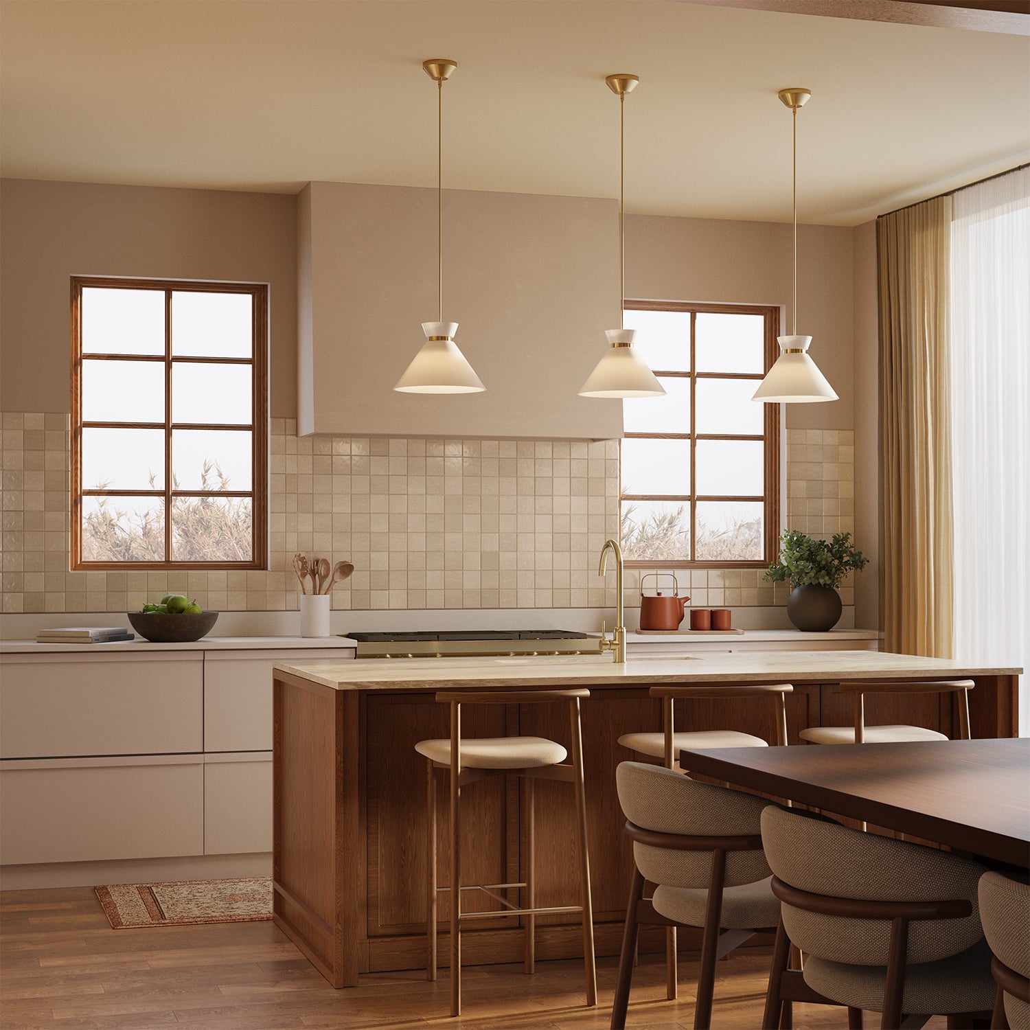 The Cori Pendant features a vintage-inspired design with a conical, white milk glass shade and elegant Brushed Brass accents. This sophisticated ceiling light showcases the perfect blend of retro and contemporary elements with its sleek cone-shaped shade and understated metallic details. Measuring 14" in diameter, the Cori creates a warm, diffused illumination that's ideal for dining areas, kitchen islands, or entryways. The timeless silhouette brings a touch of mid-century charm to your space while providing practical lighting for everyday use.