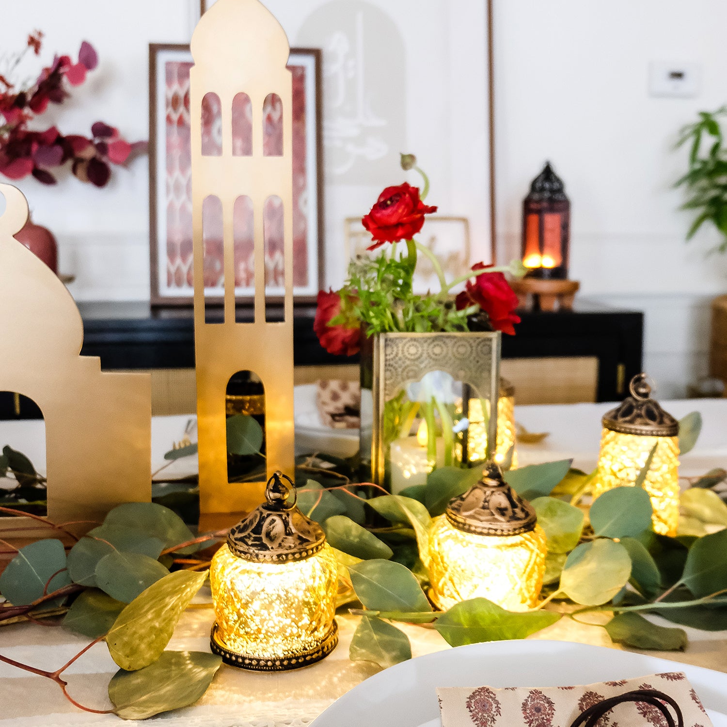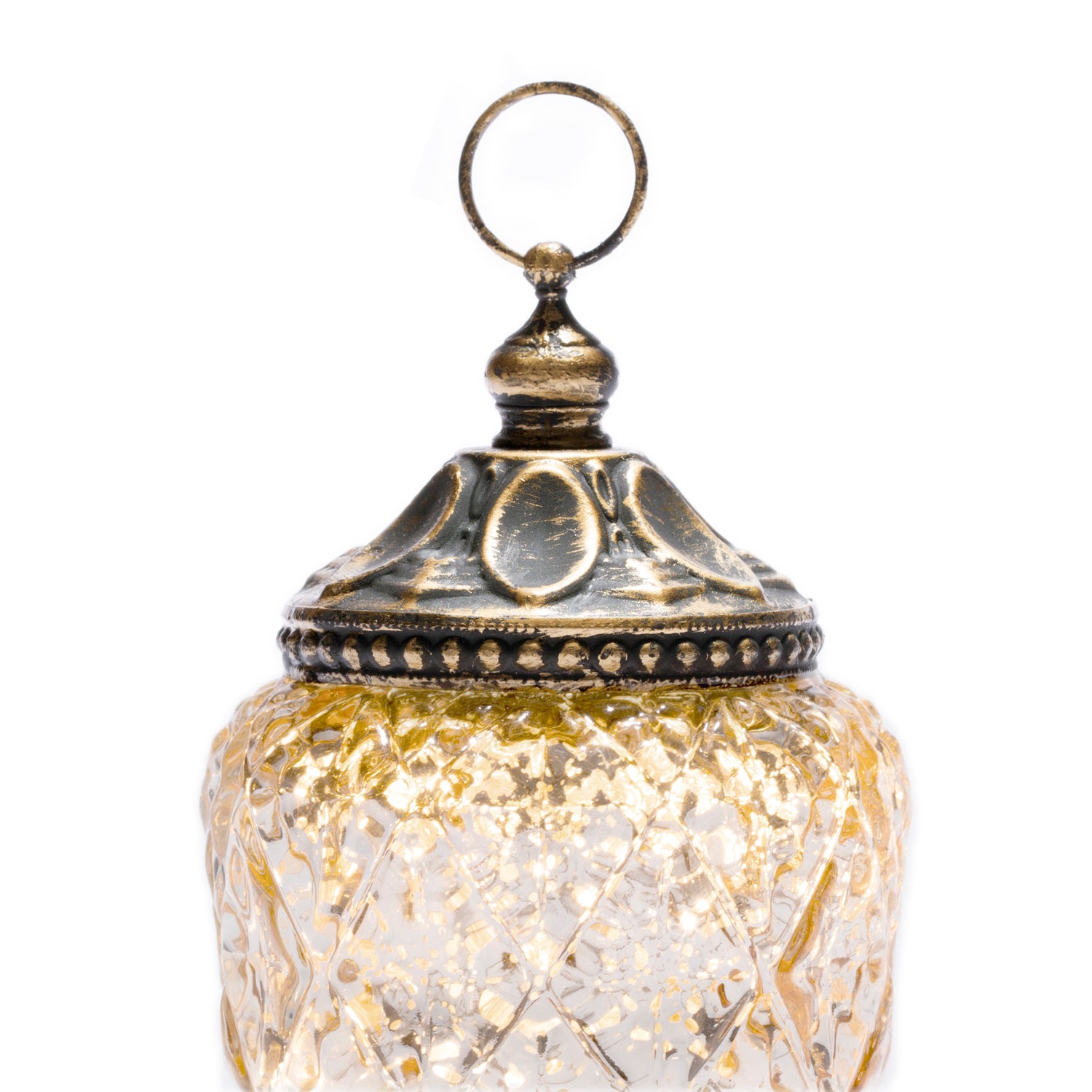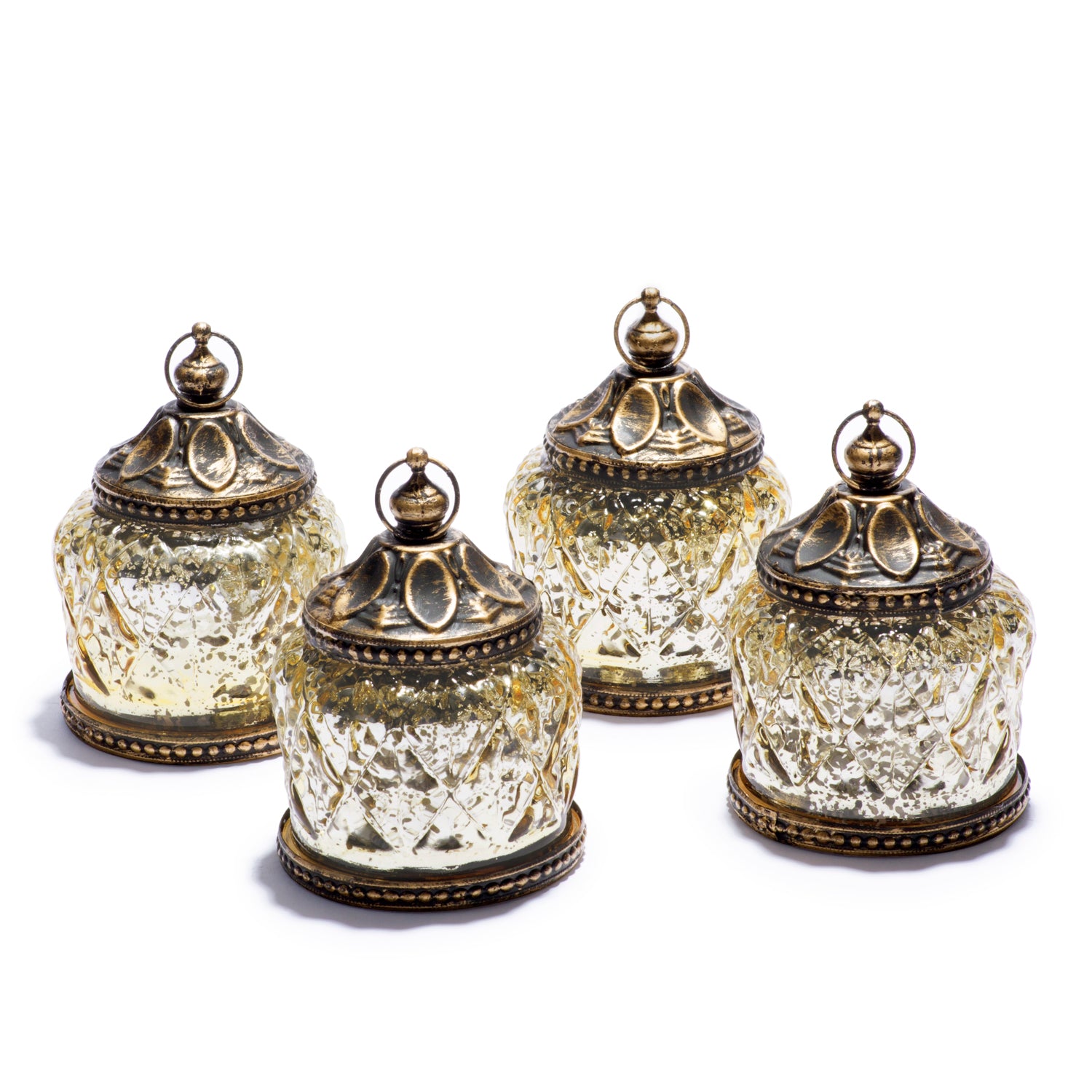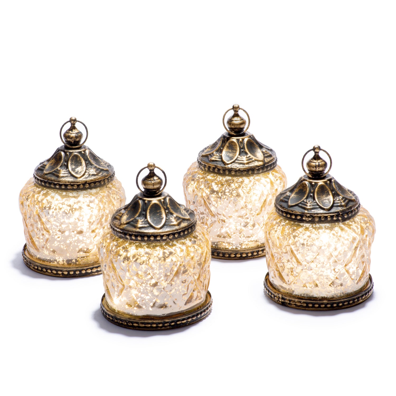 This set of 4 mini mercury glass lanterns cast a soft, warm white glow in their environment. Textured gold pattern provides a decorative look, inspired by the architecture of Morocco. These mini lanterns are great for parties or every day use; Ideal as gifts or wedding favors, and beautiful as decorations for Ramadan.